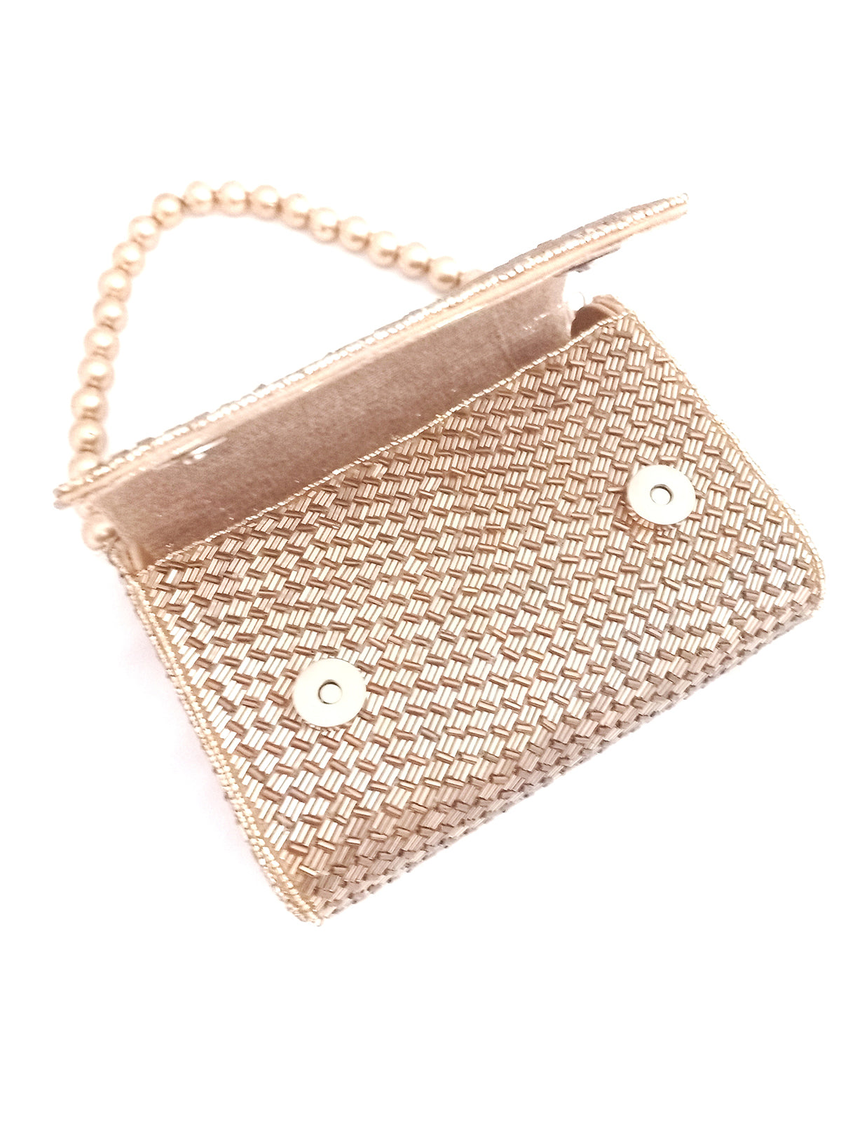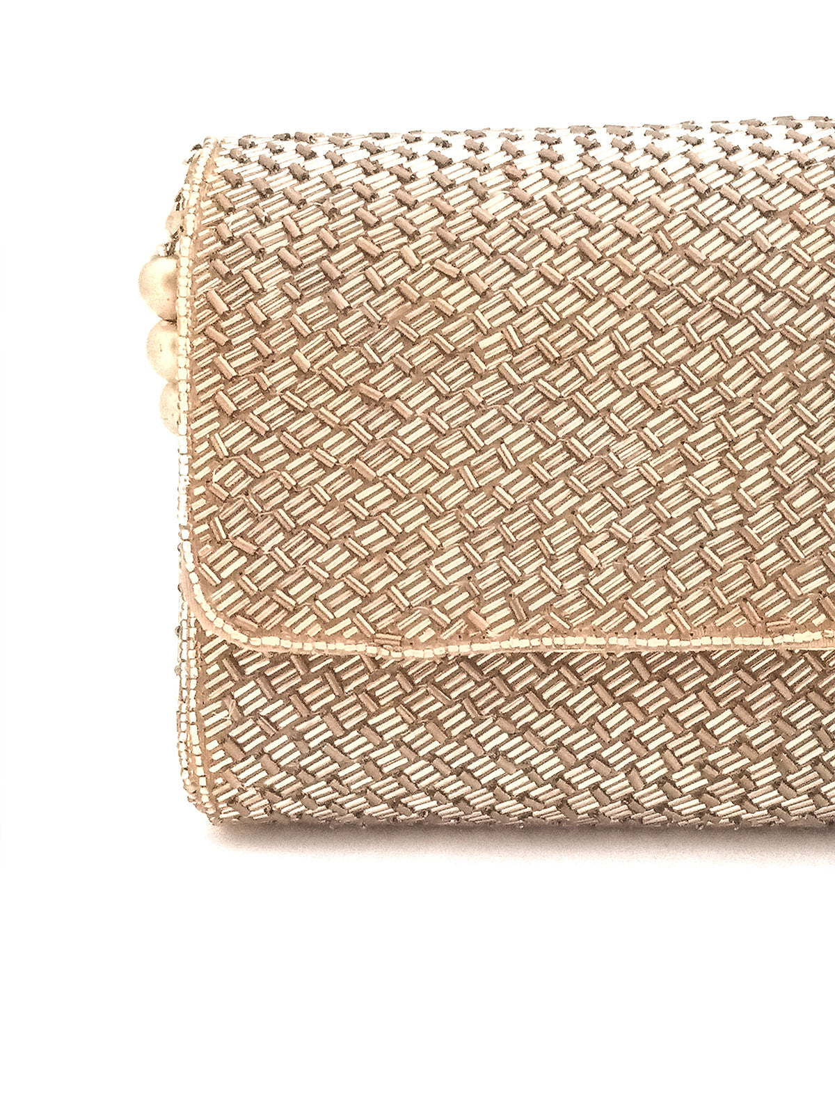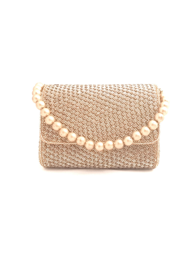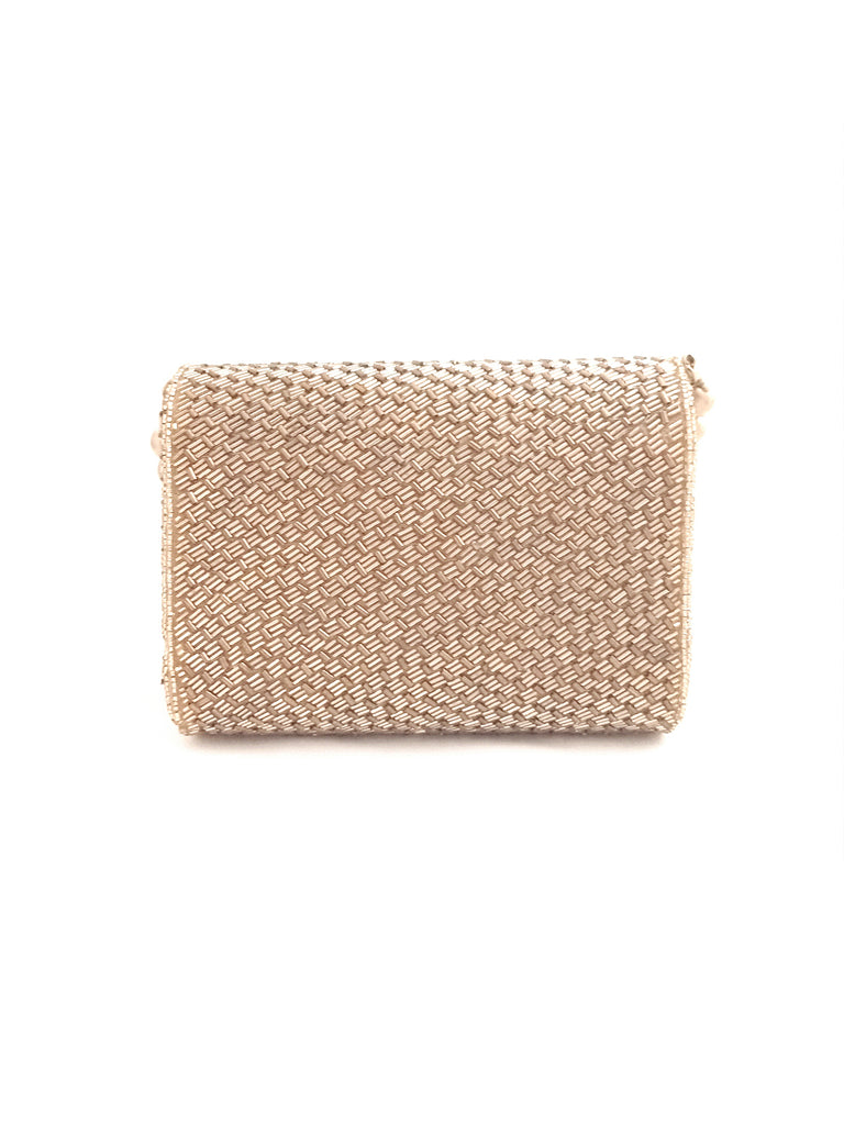 Flap over clutch Hand embroidered with Gold Bugle Beads in a weave pattern on all sides.