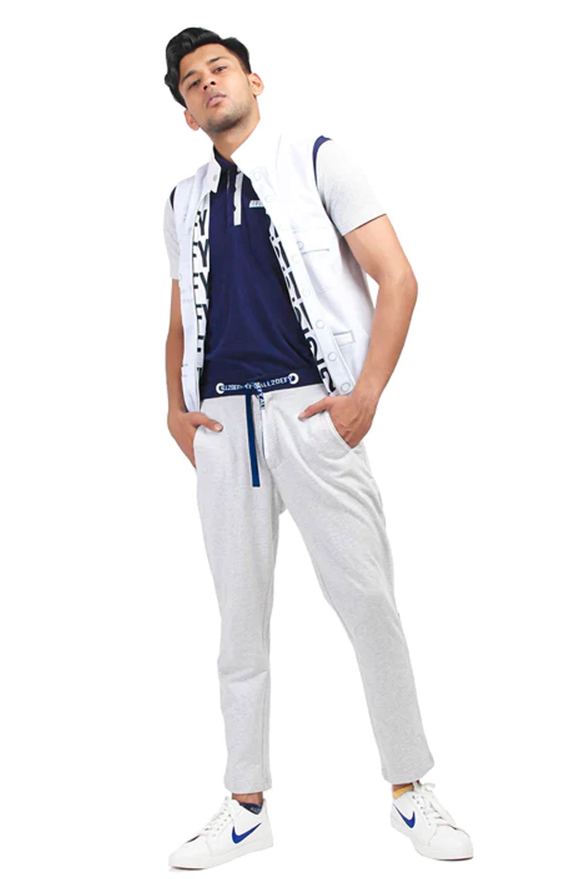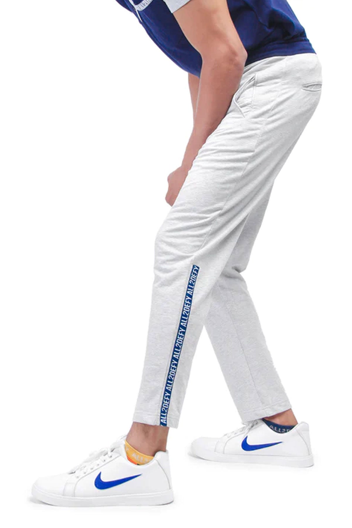 Colour-blocked cotton terry trouser in navy and grey. Mid-rise. Signature ALL2DEFY drawstring at elasticized waistband in navy. Two-pocket styling. Outseams with ALL2DEFY navy mesh trimming with grey print.