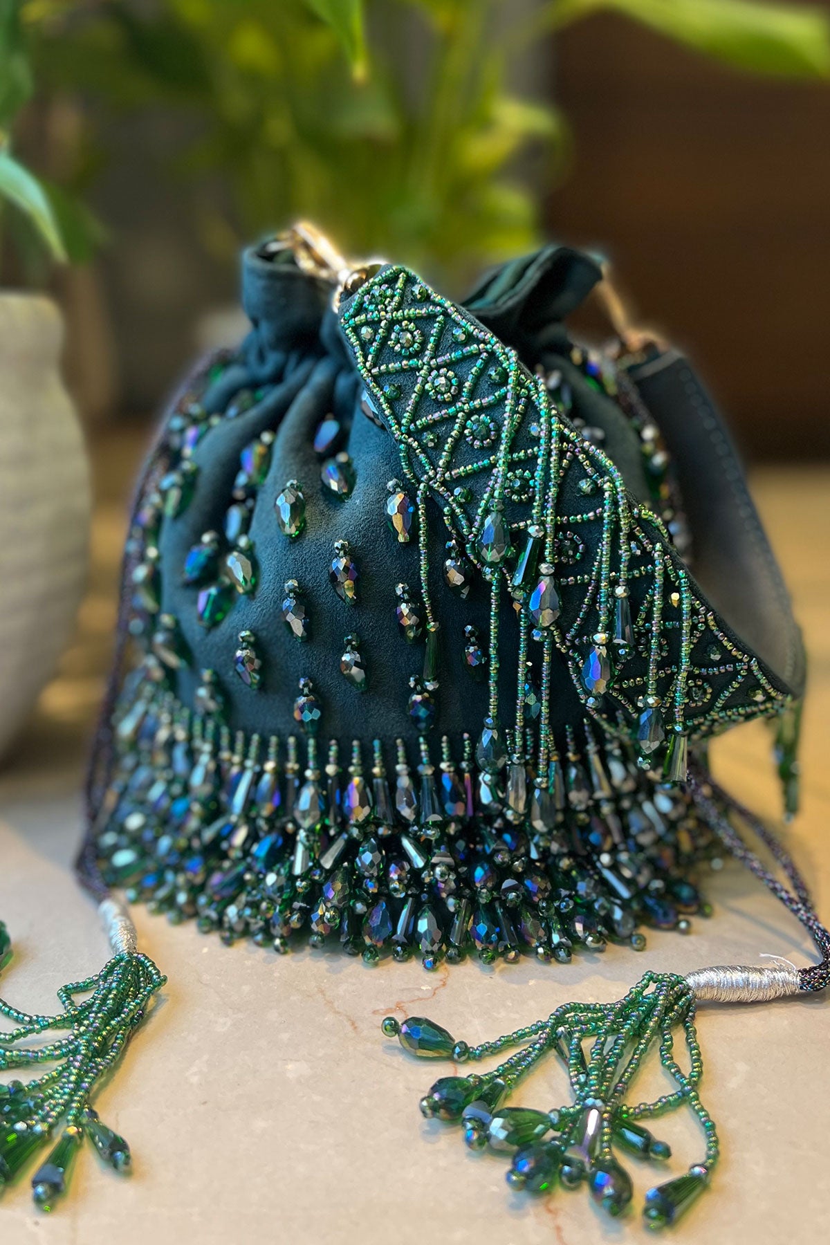 Rainbow green glass crytals hand stitched to give beautiful movement with a gorgeous hand embroidered belt.
