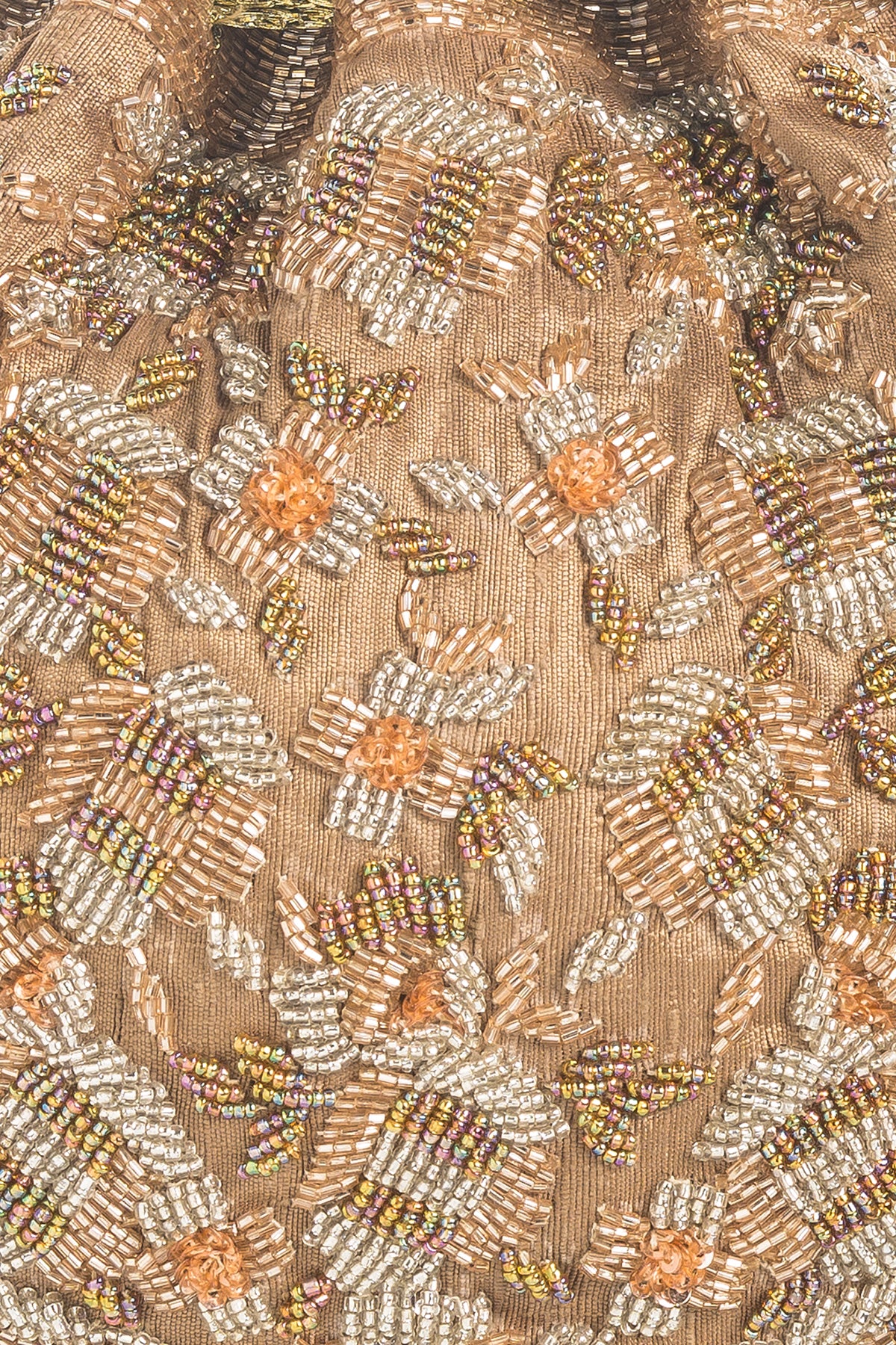Raw silk potli with intricate jaal of flowers in rose gold,gold and silver pot and kardana. Finished off with 1 inch long sallis as tassels.
