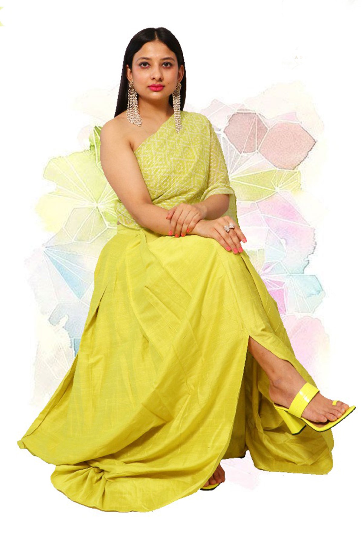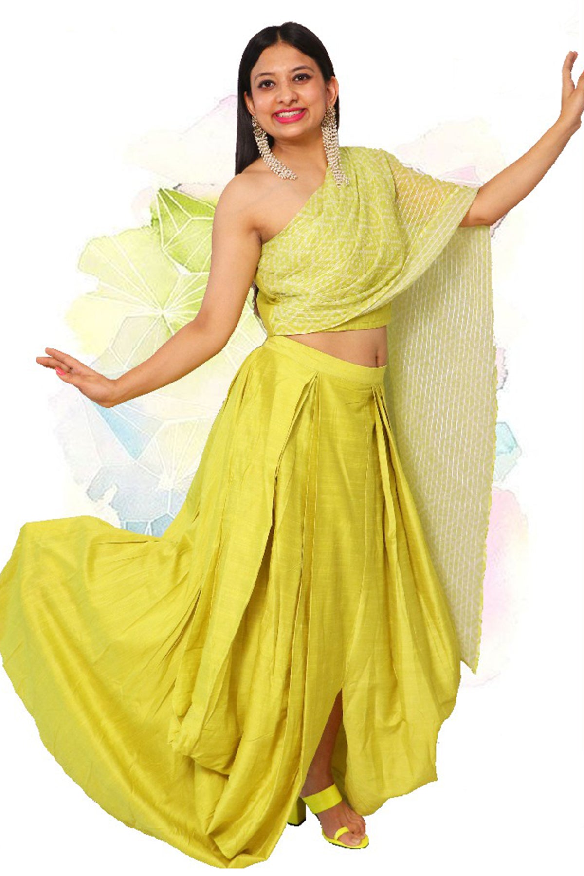 Neon green skirt and one shoulder drape blouse. A perfect combination of raw silk drape wear skirt with one shoulder crop with attached pleated drape falling at the back.