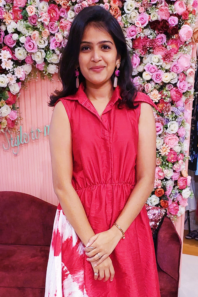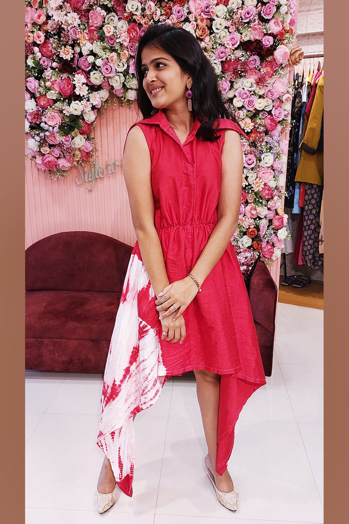 Red shirt dress side tie and dye. Amalgamation of cuts and colors this smart shirt dress can be Styled in various ways. Wear it as shirt dress for a perfect Sunday or team it up with denims for your casual office wear.
