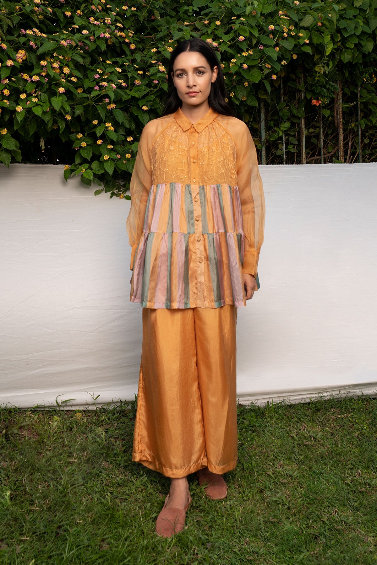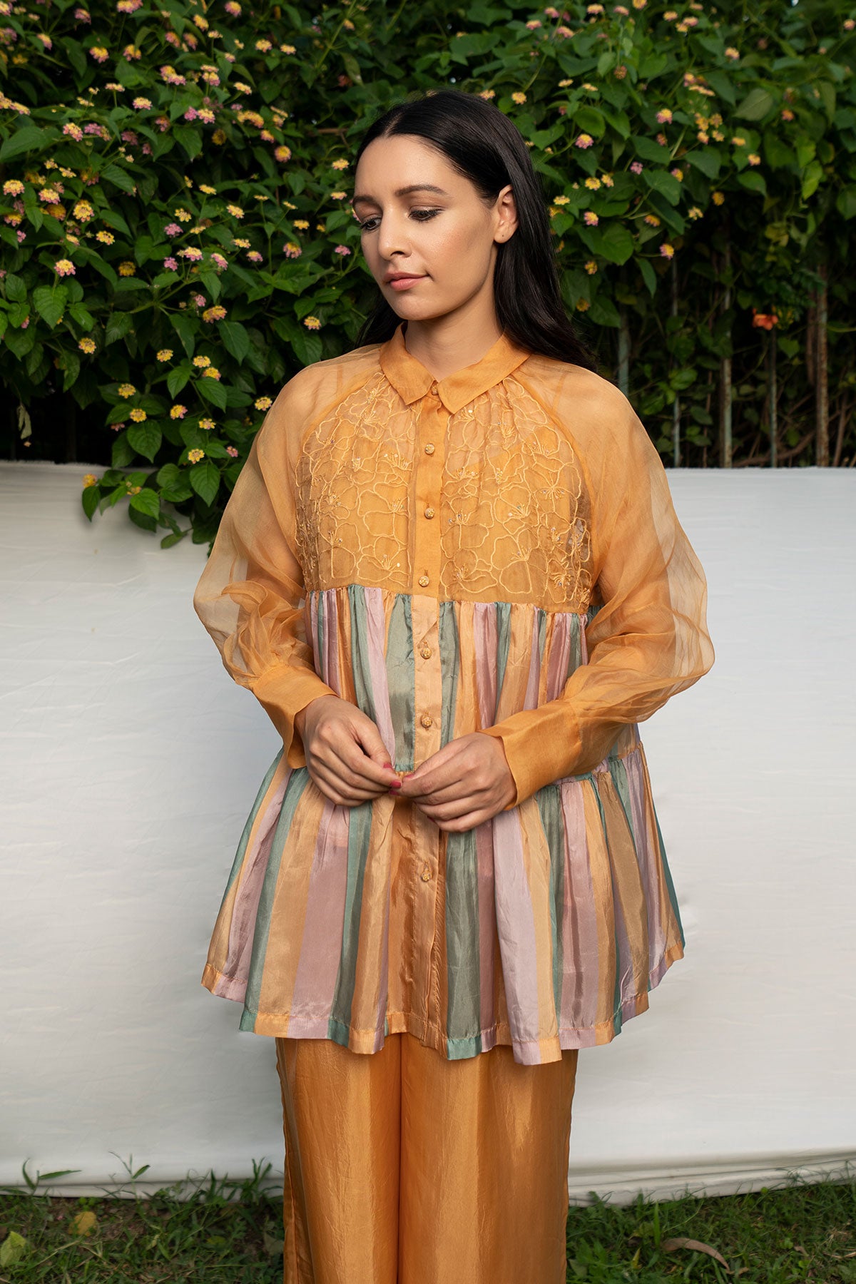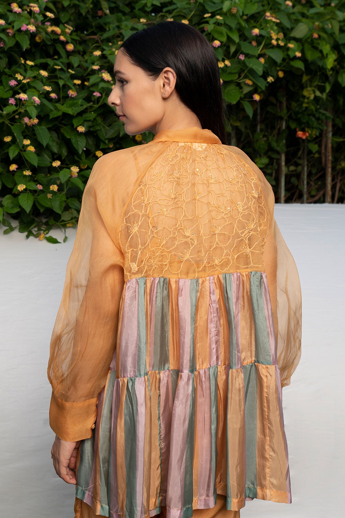 - Hand Embroidered Shirt with stripes tiers and spaghetti lining.