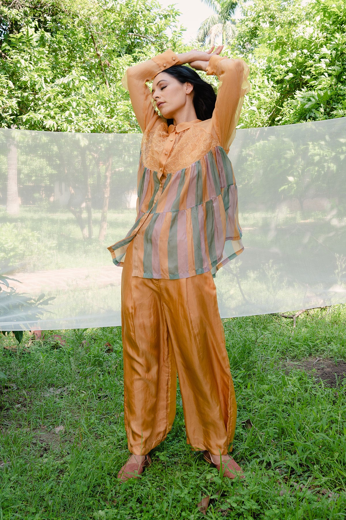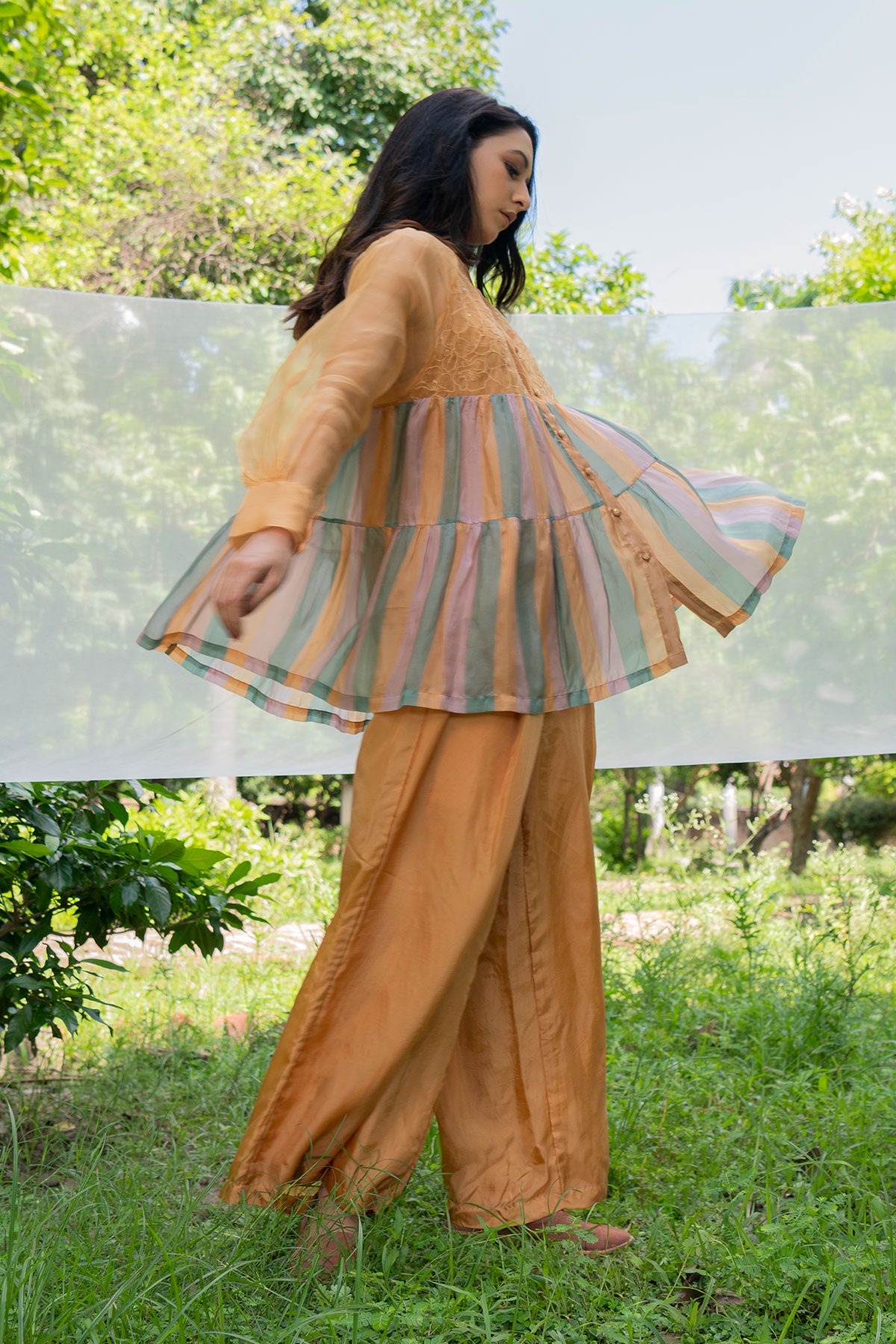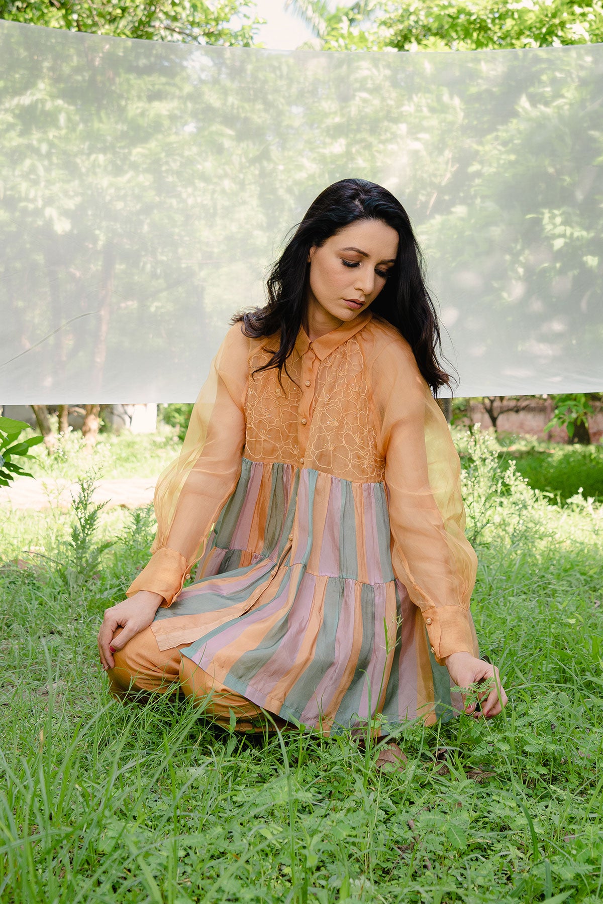 - Hand Embroidered Shirt with stripes tiers and spaghetti lining.