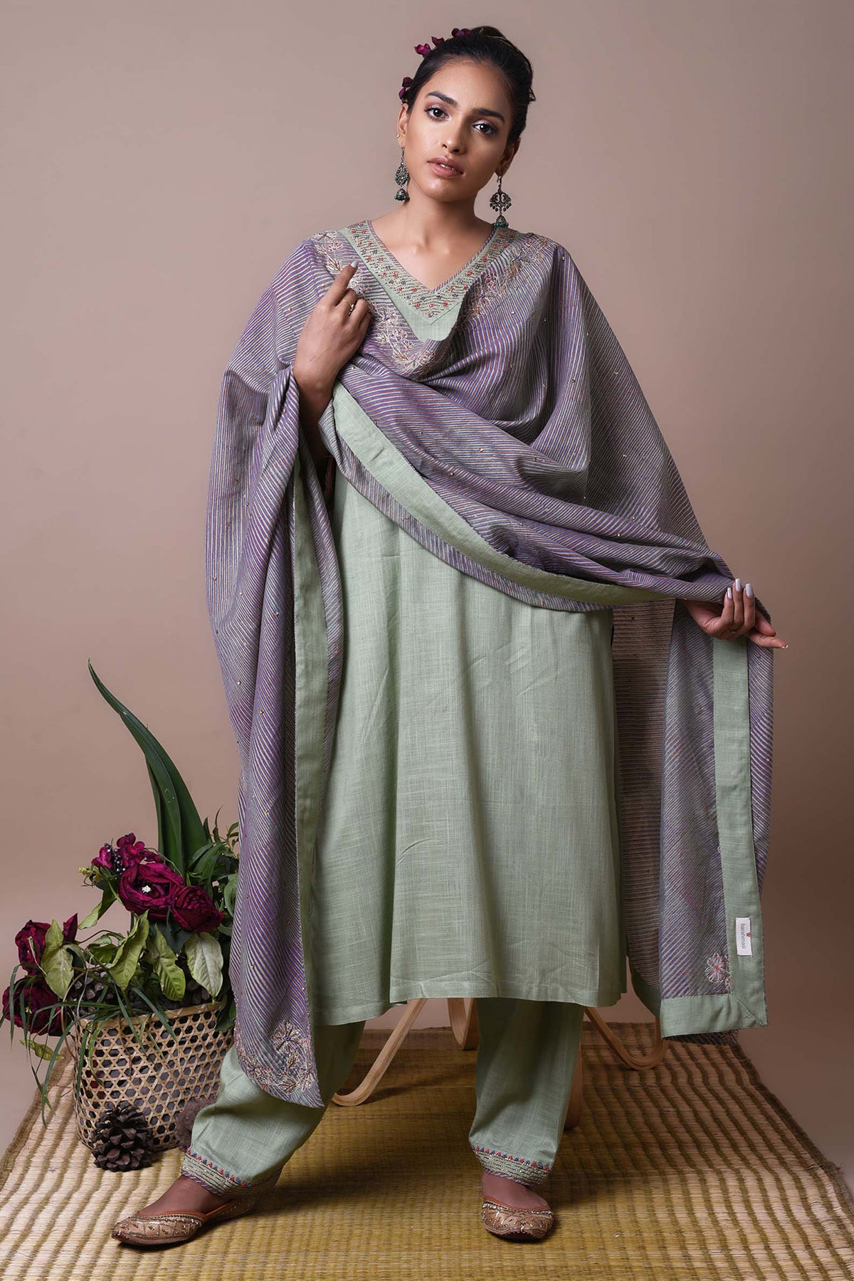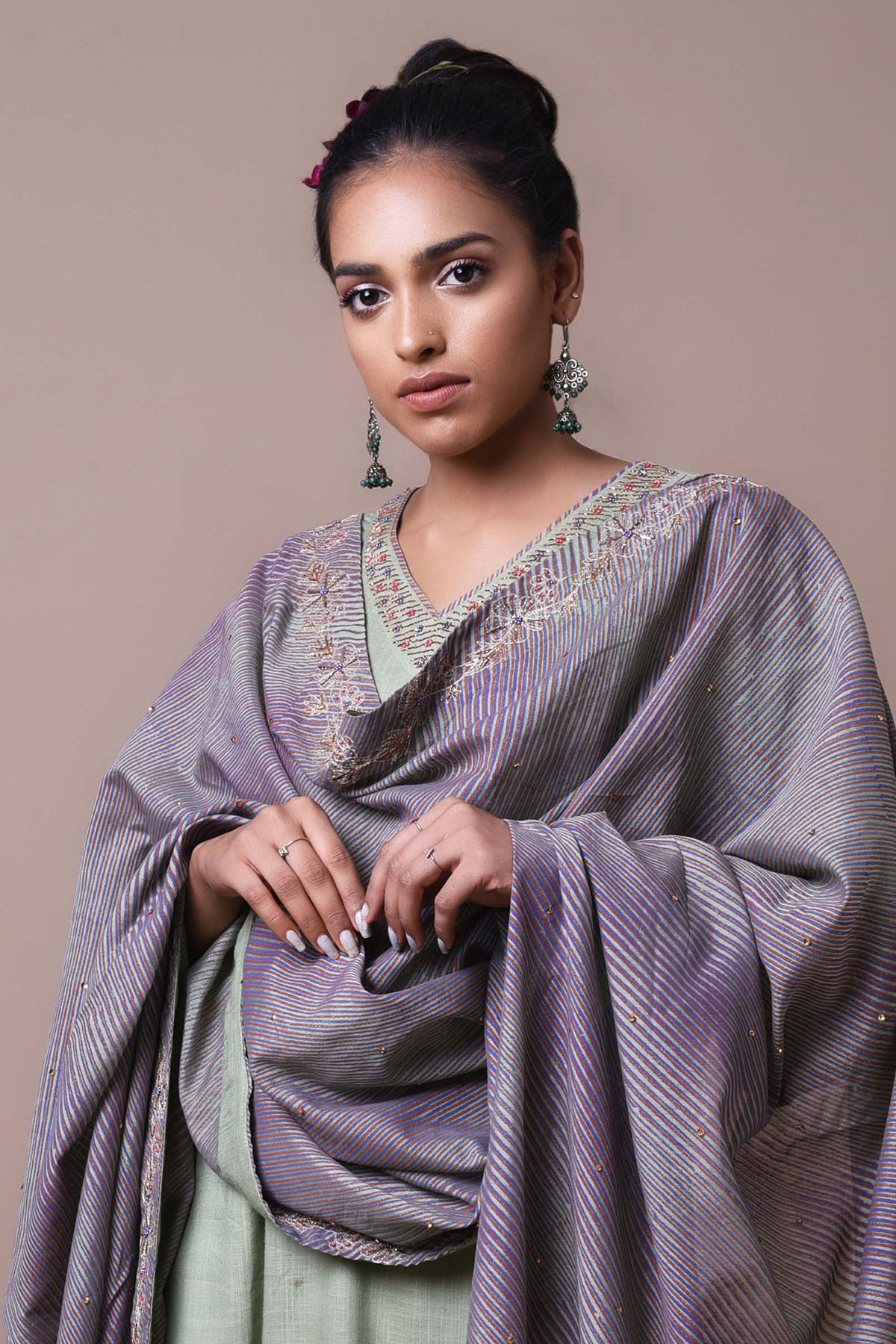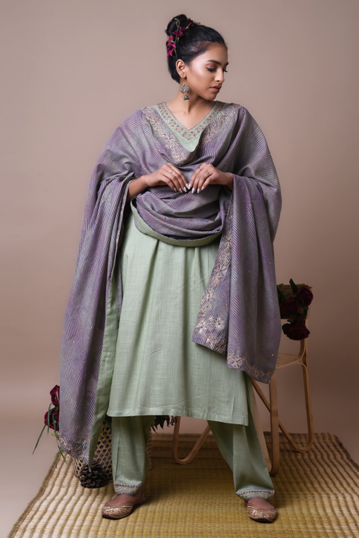Green block printed dupatta is made of chanderi , hand embroidered with Dabka and Bead work.