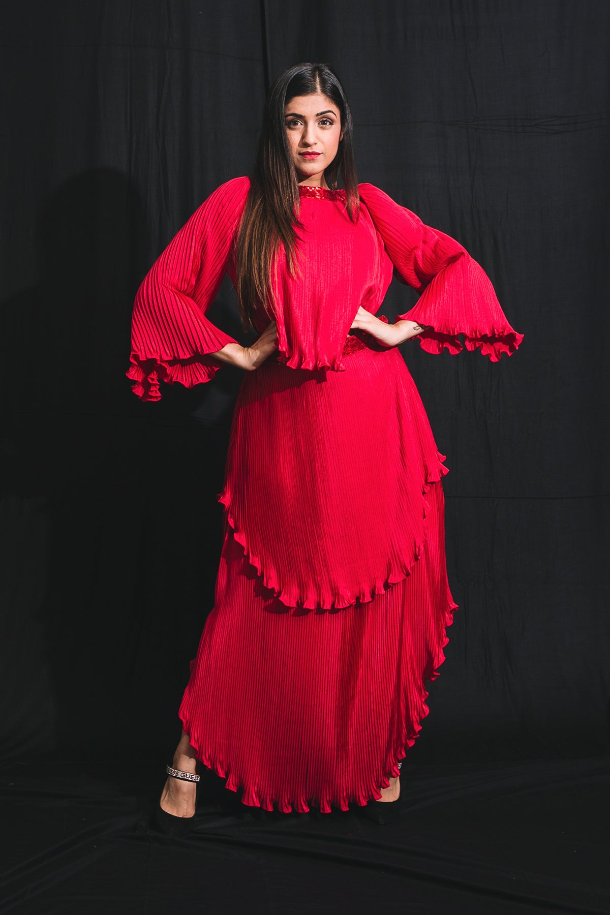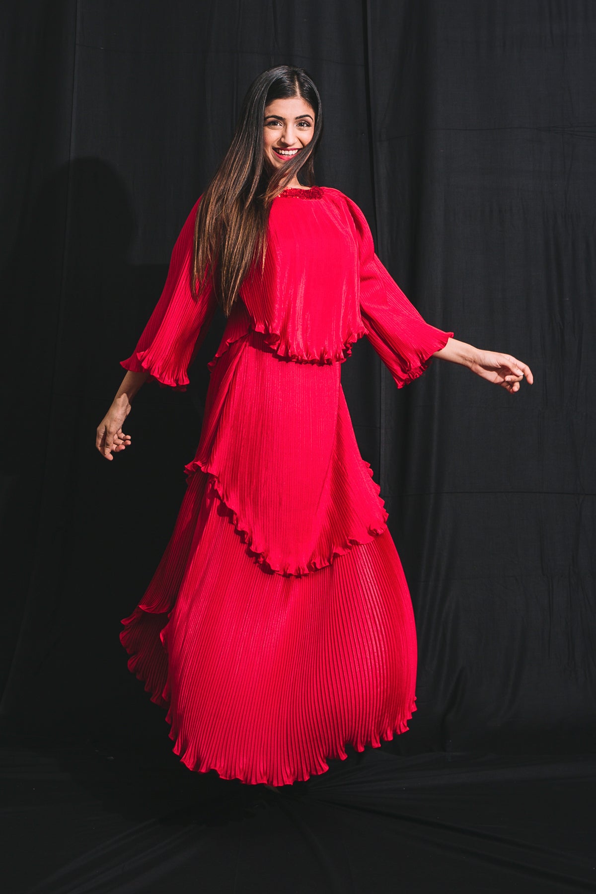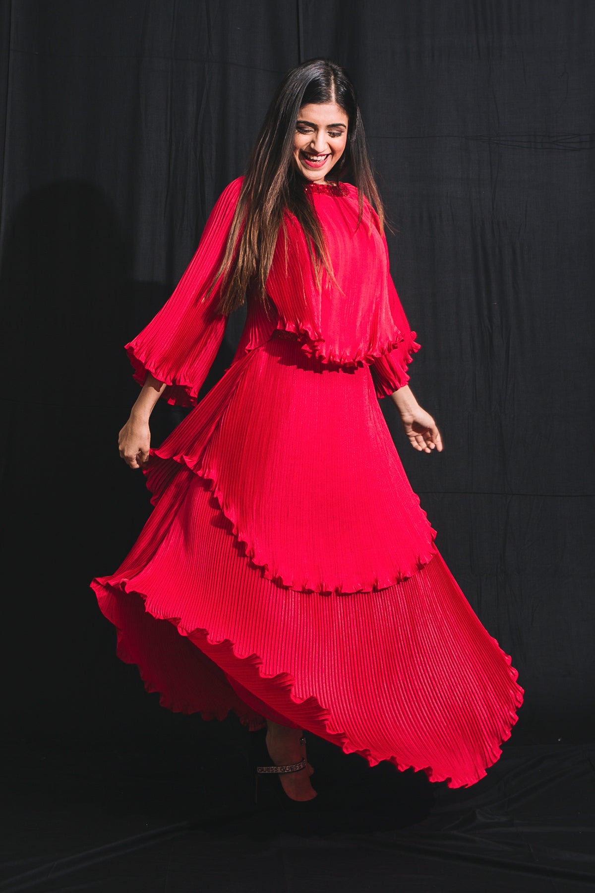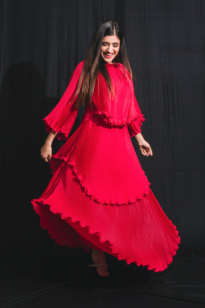 Pleated skirt paired with crop top cut in a way that makes it look like a dress.