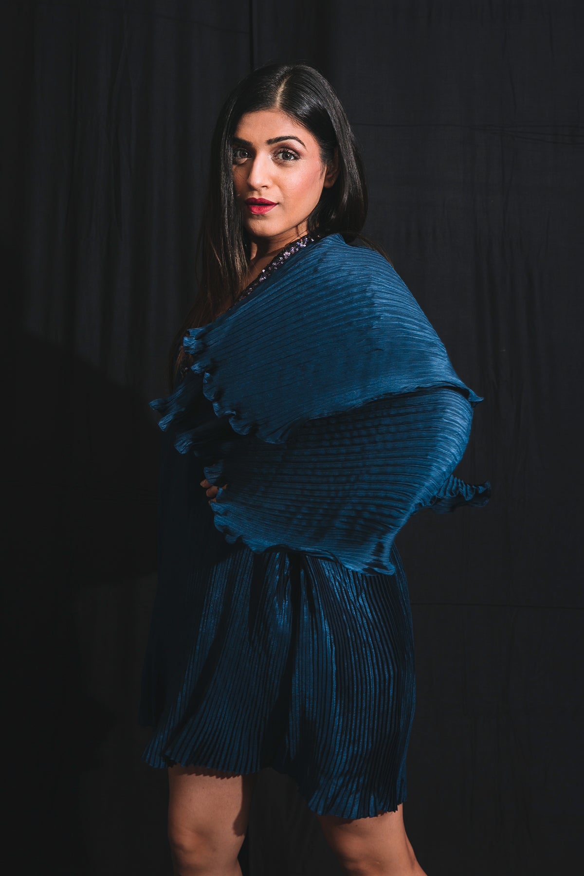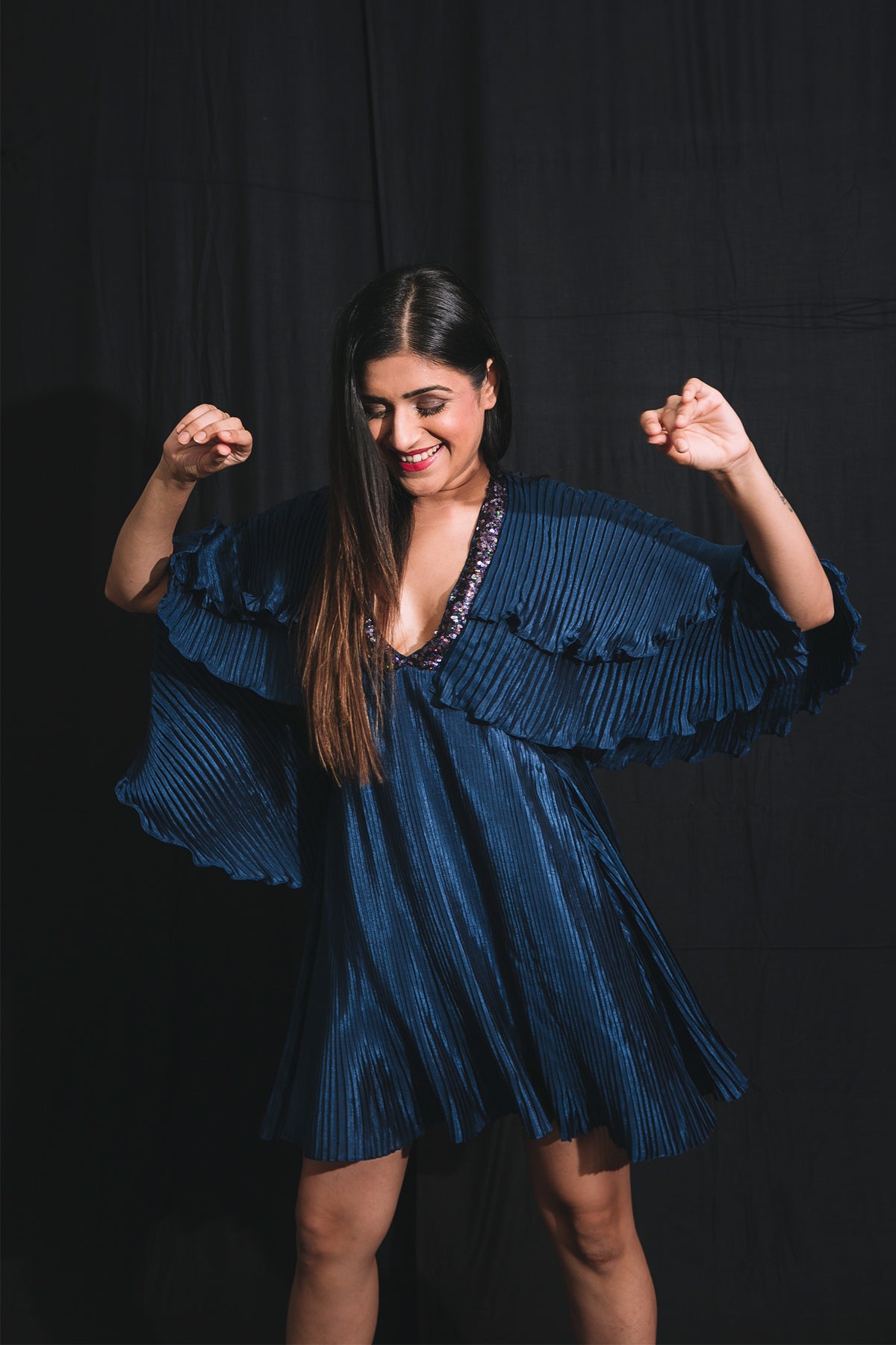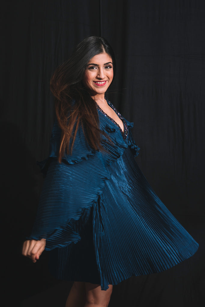 Short dress with exaggerat ed sleeves.