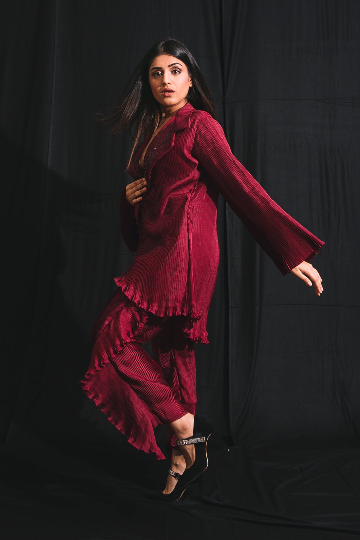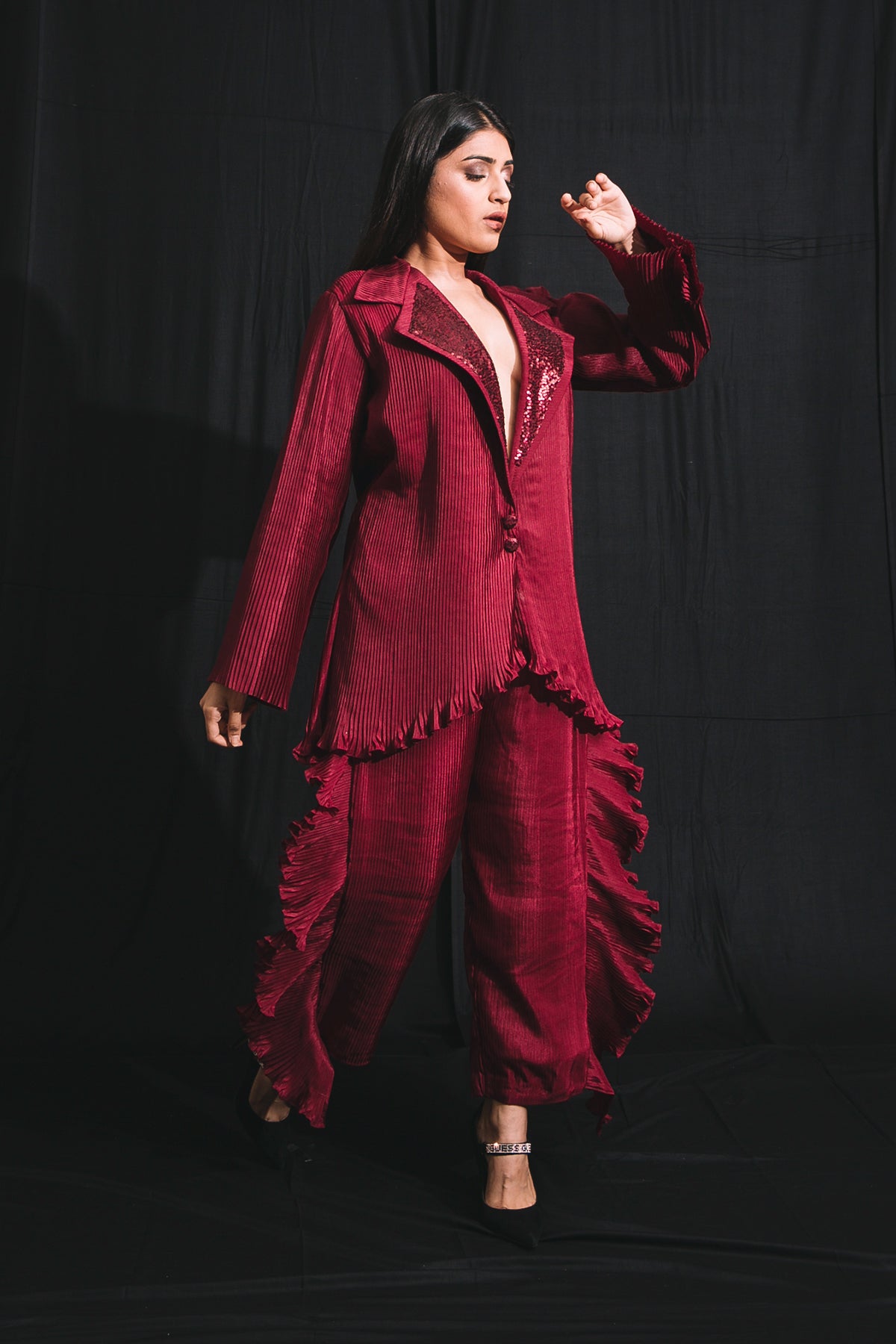 Boss lady. Panelled Coat with Frill pants make you own the place.