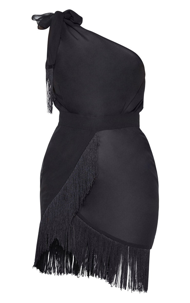 Update your holiday look with this sultry beach dress, featuring a black mesh fabric with an asymmetric design and fringe detailing. We love this worn over a black bikini for ultimate poolside glam.