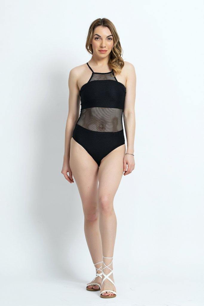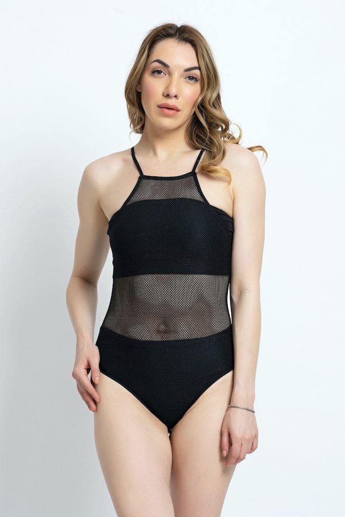 Trending pattern: Sheer net neckline, halter neck swim dress. An all-time favorite for every beach girl is the Mesh Bandeaukini. It is a two-piece swimsuit which has a style fashioned for every body shape.