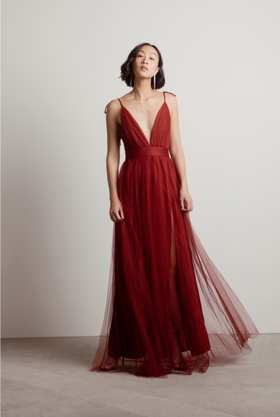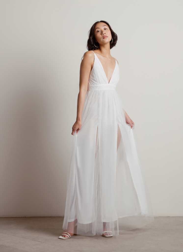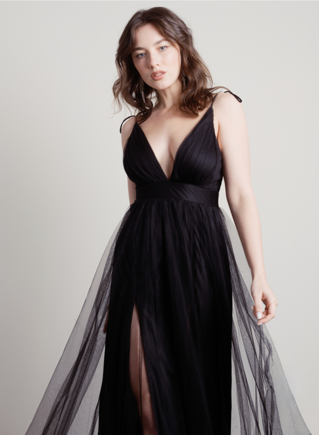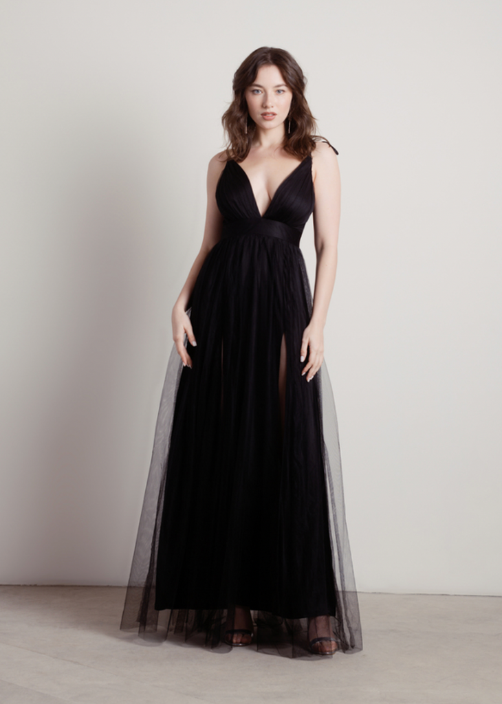 Get your groove on with a Slay the Night Dress. This tulle maxi dress features a high slit and a deep-v neckline. Pair it with high heeled strap sandals. Accessorize with dangling earrings.