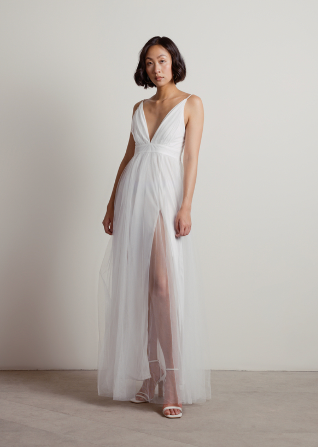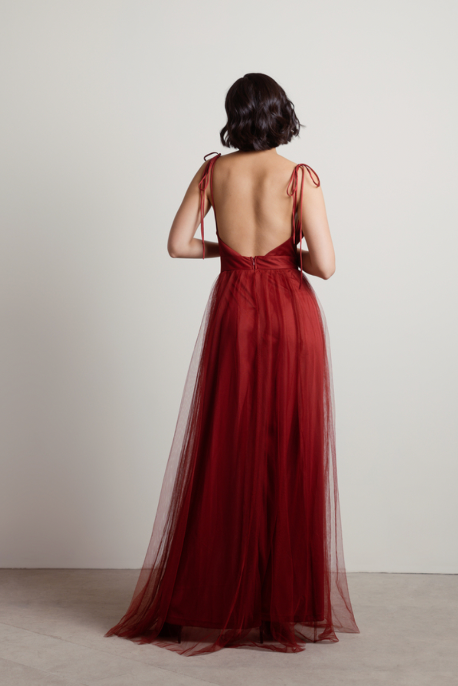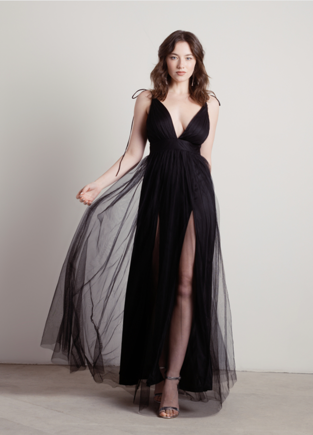 Get your groove on with a Slay the Night Dress. This tulle maxi dress features a high slit and a deep-v neckline. Pair it with high heeled strap sandals. Accessorize with dangling earrings.