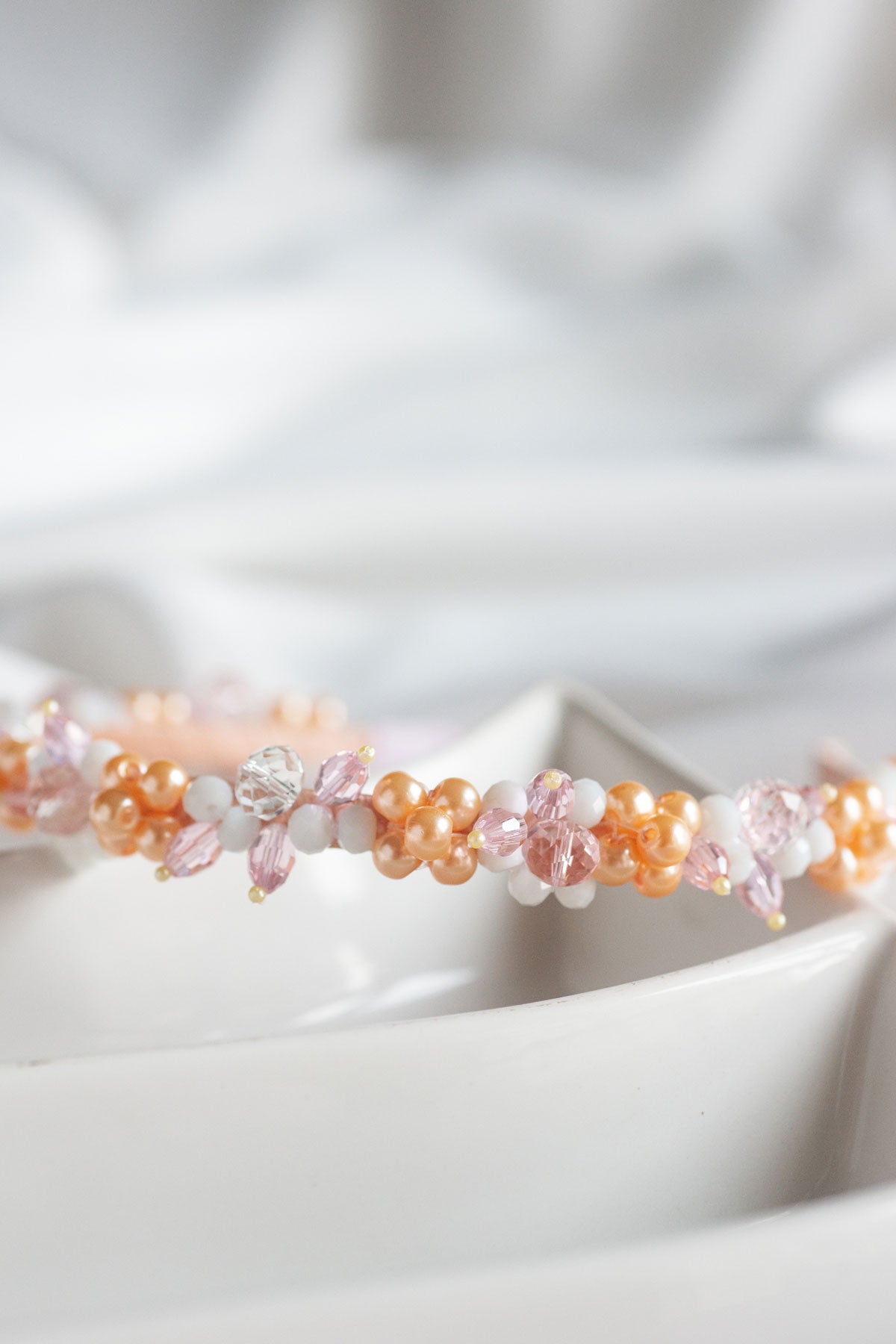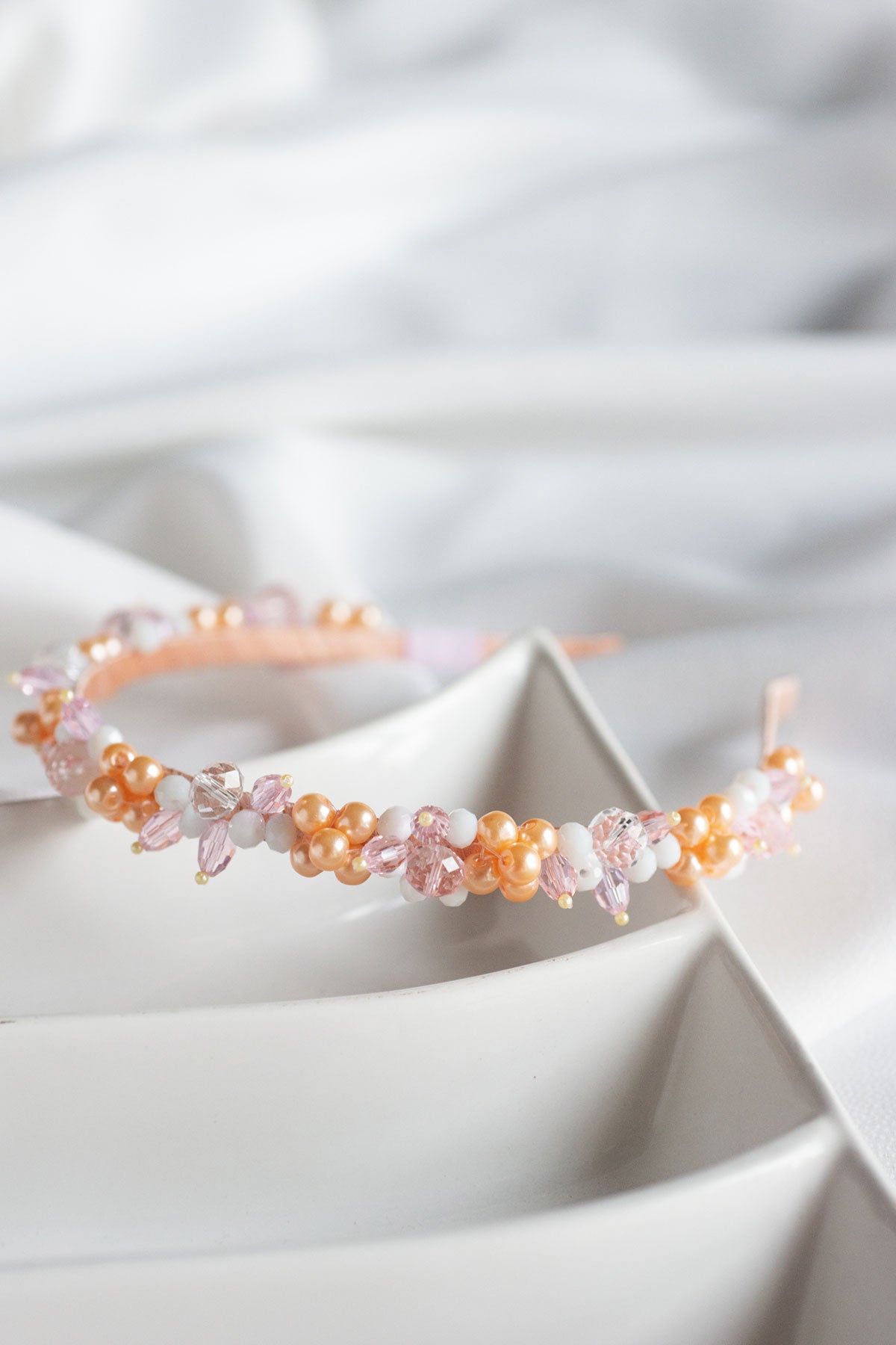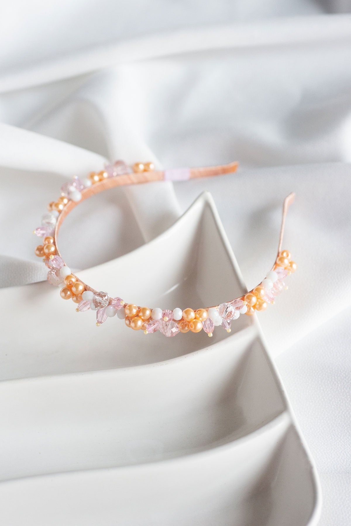 Light Pink and Peach form a complementary contrast in this Pearl and Crystal hairband. Evoke the power of soft femme as it sits on your crown.