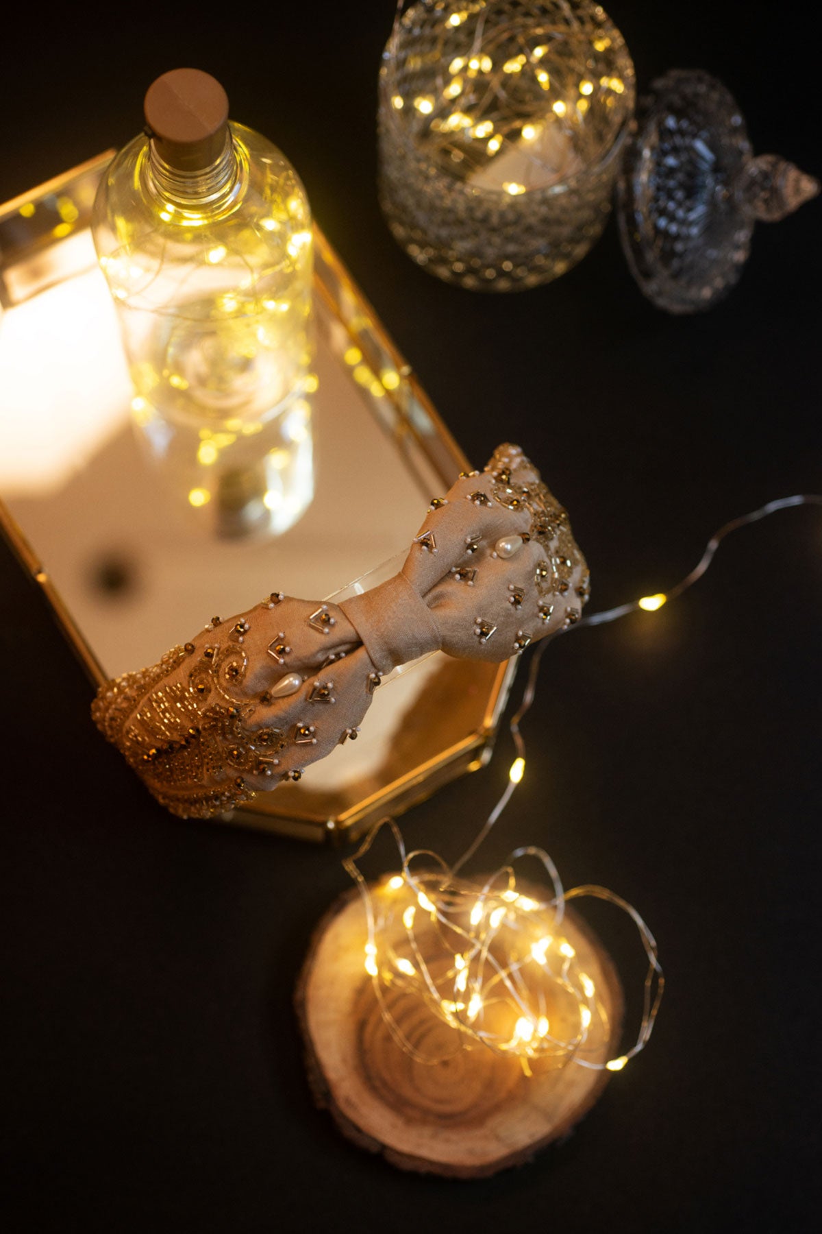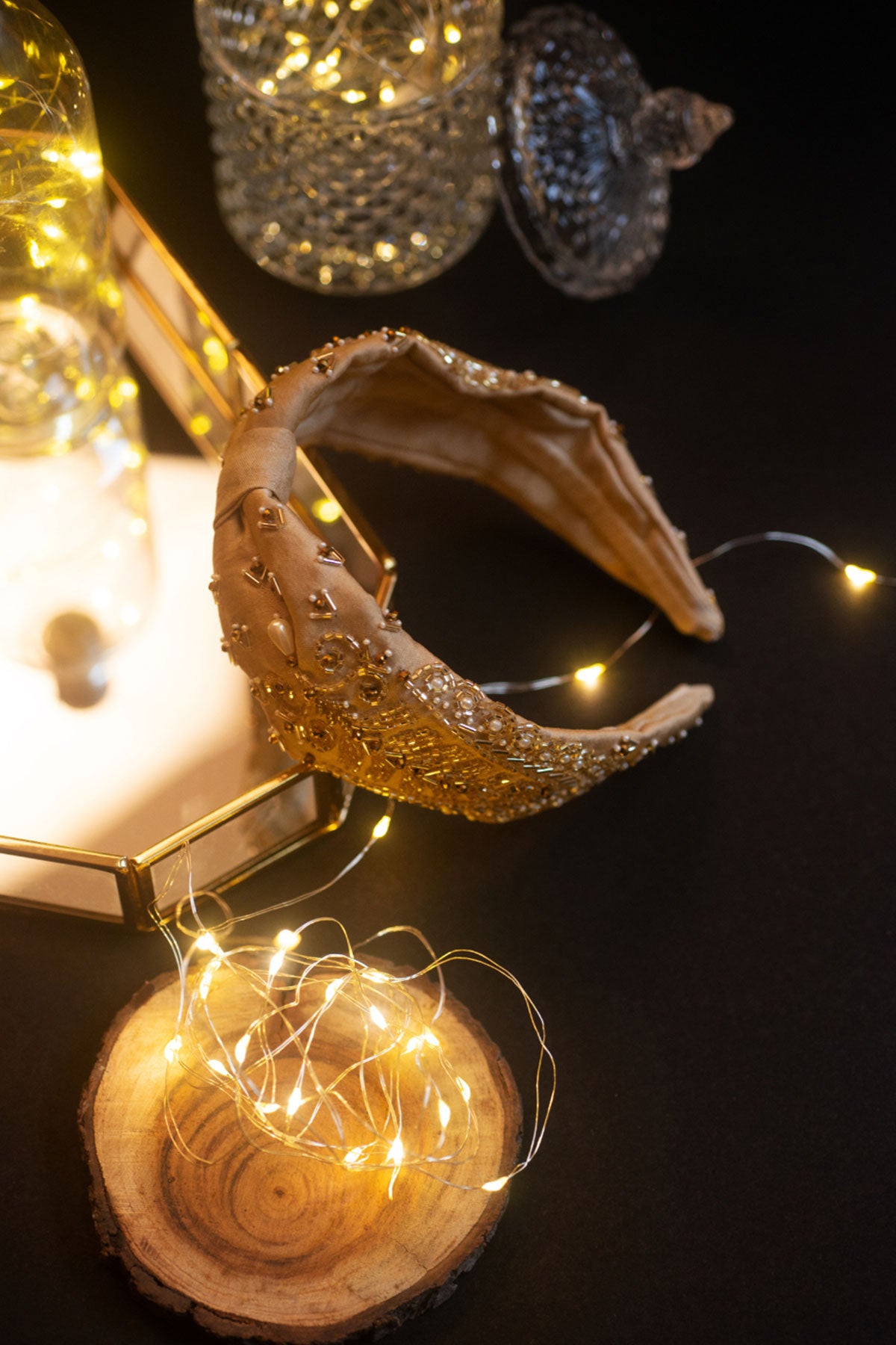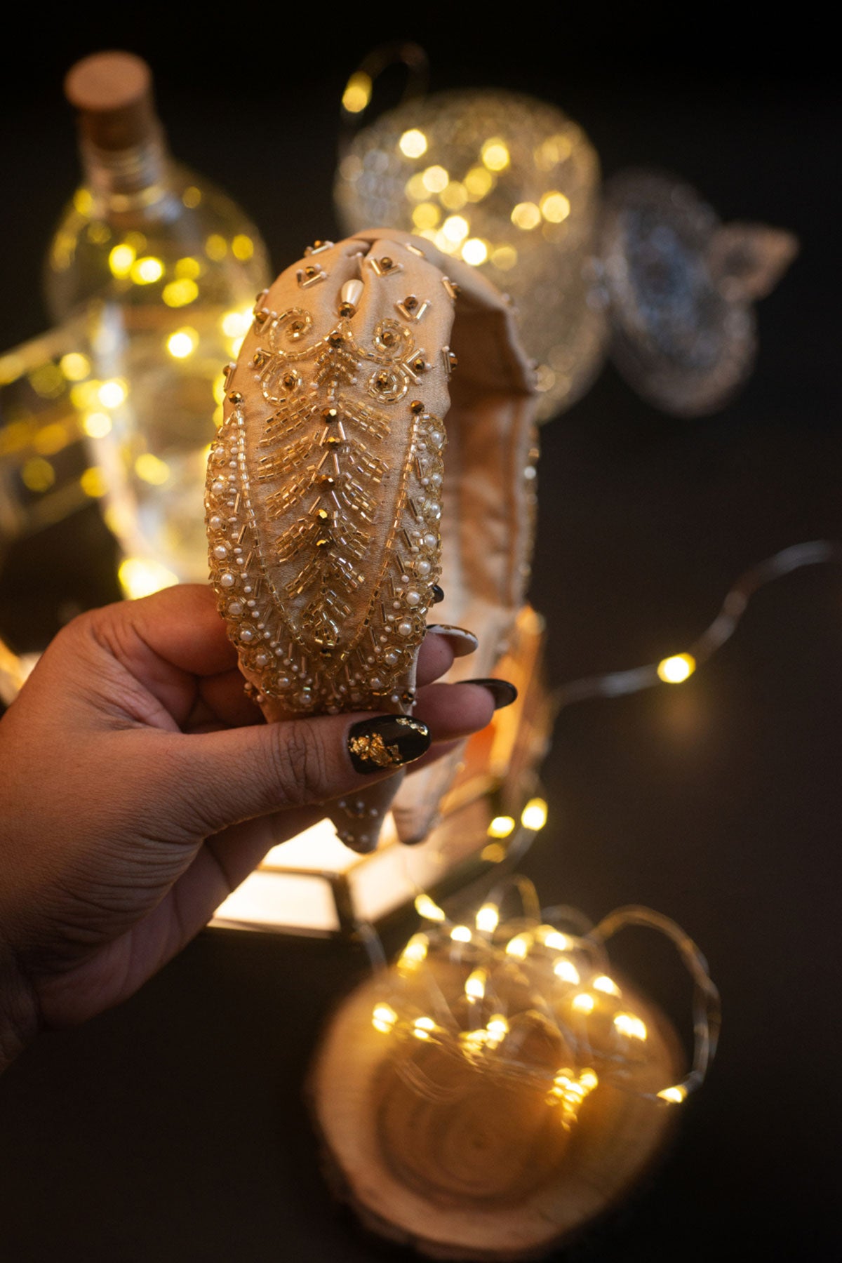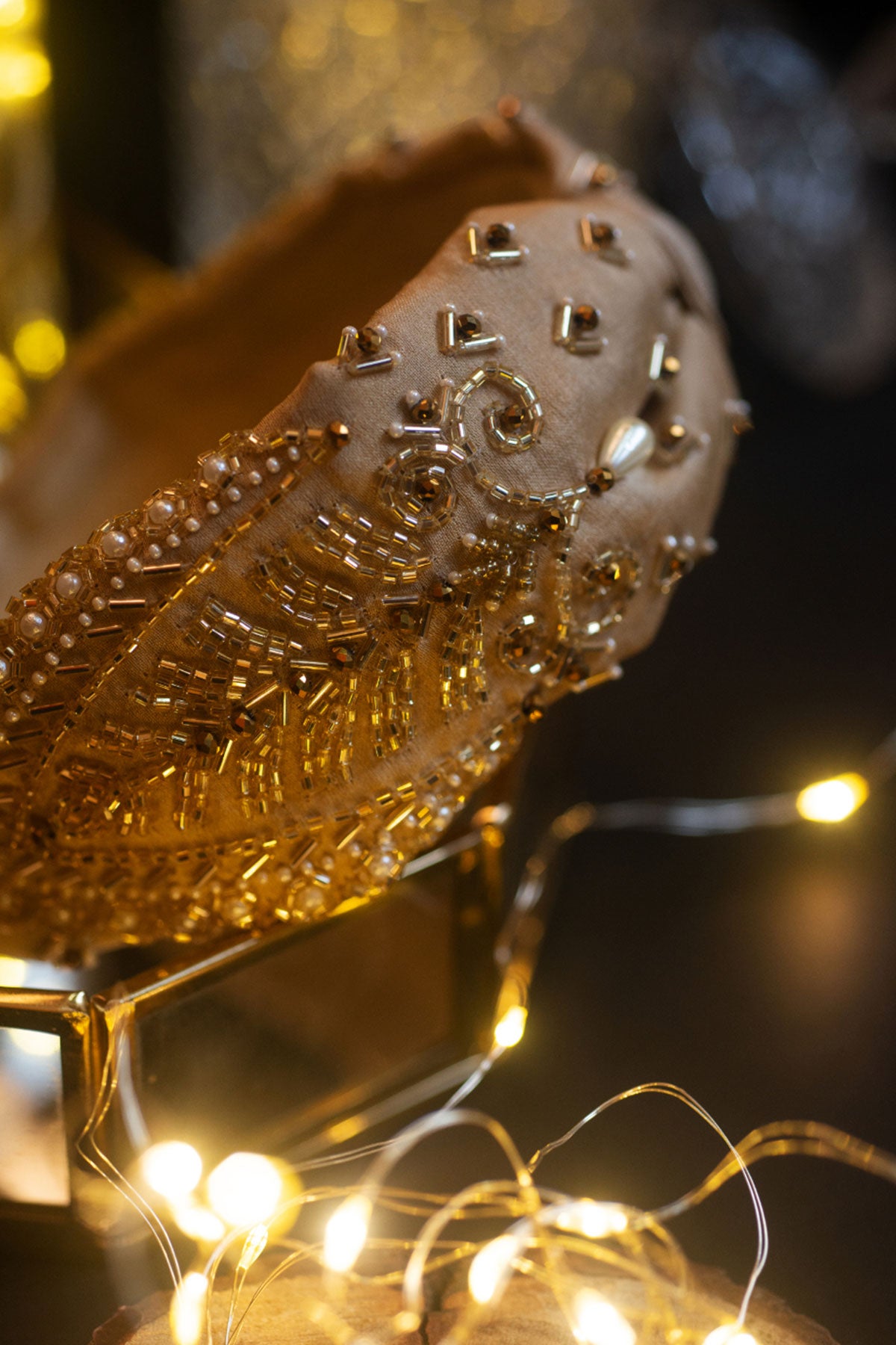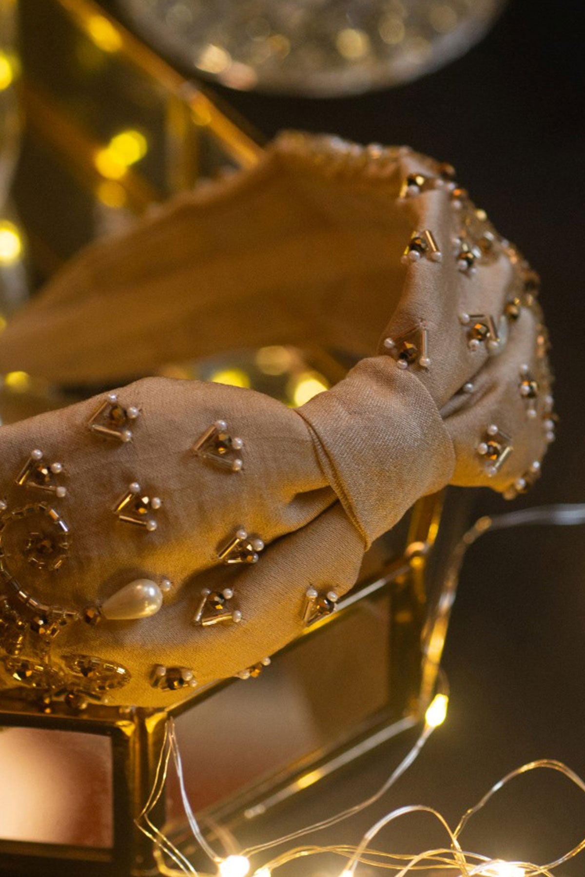 Stay somber and grounded with this Beige Headband with an exotic Pearl and sequin design decorated with Gold-leaf ornaments. Every accessory at Choko is handmade with love. A little care in their maintenance goes a long way in preserving their longevity.