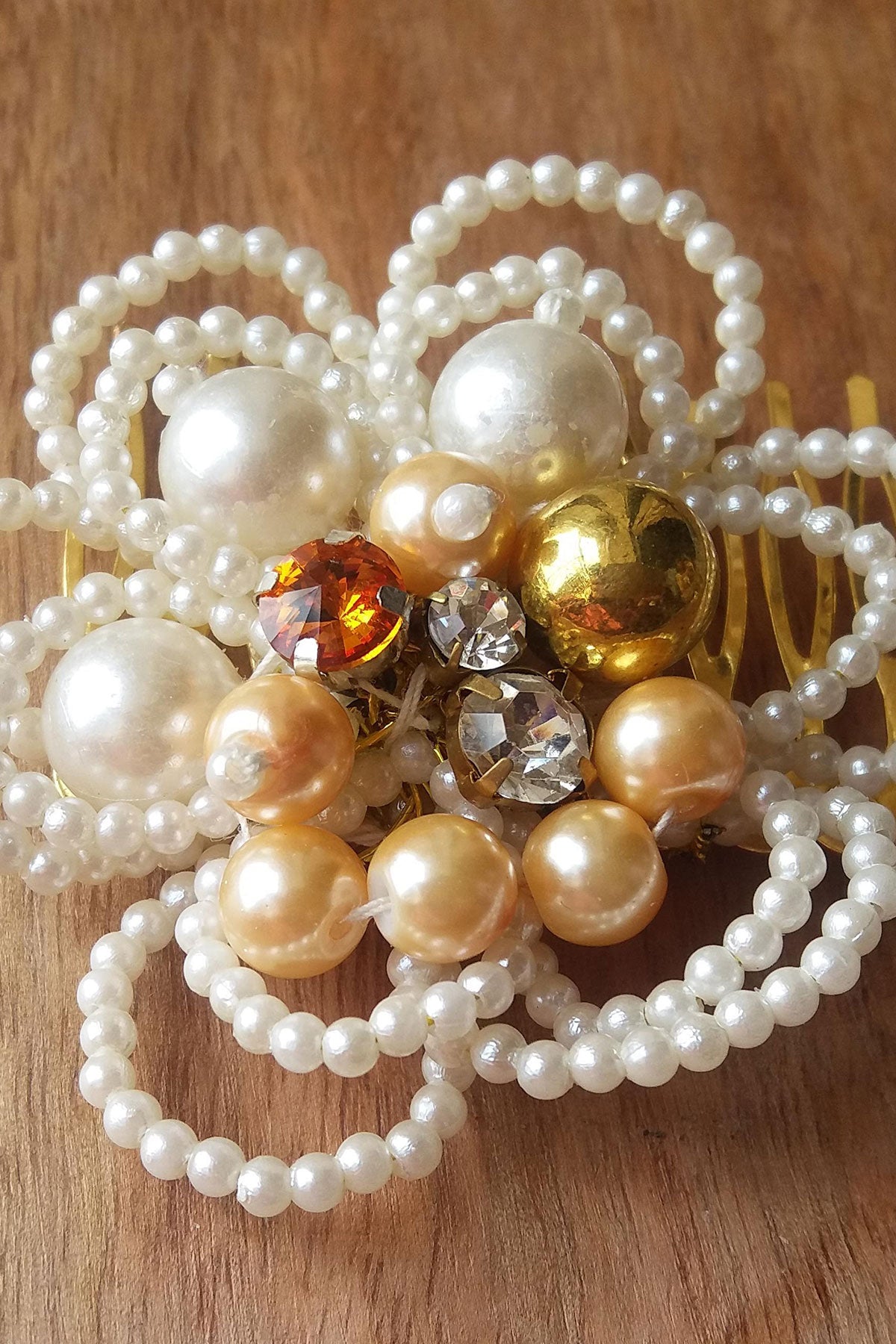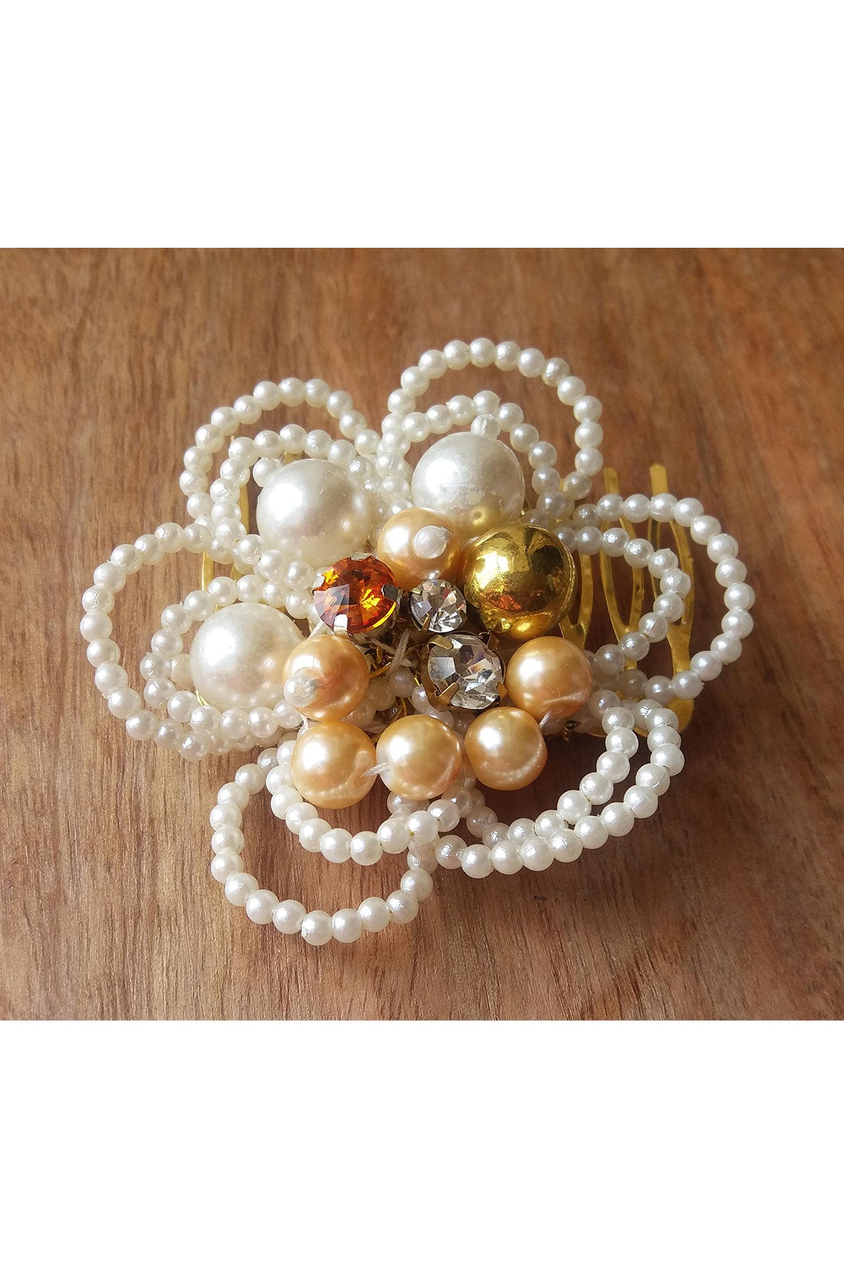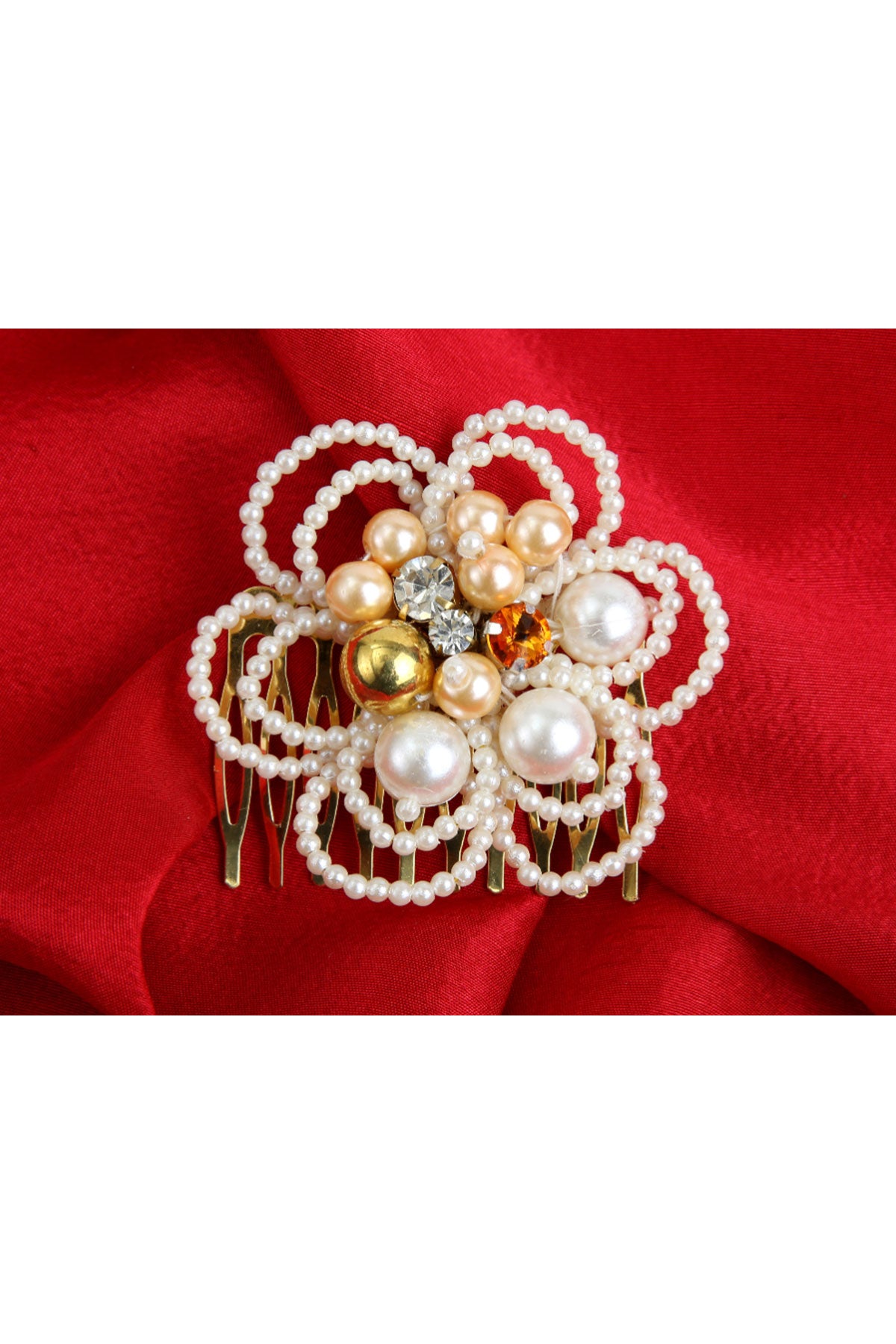 Multi-coloured large Pearls and diamonds surrounded by finely twined White Pearls form a designer hair comb. Nothing flaunts elegance better than some gorgeous Pearls.
