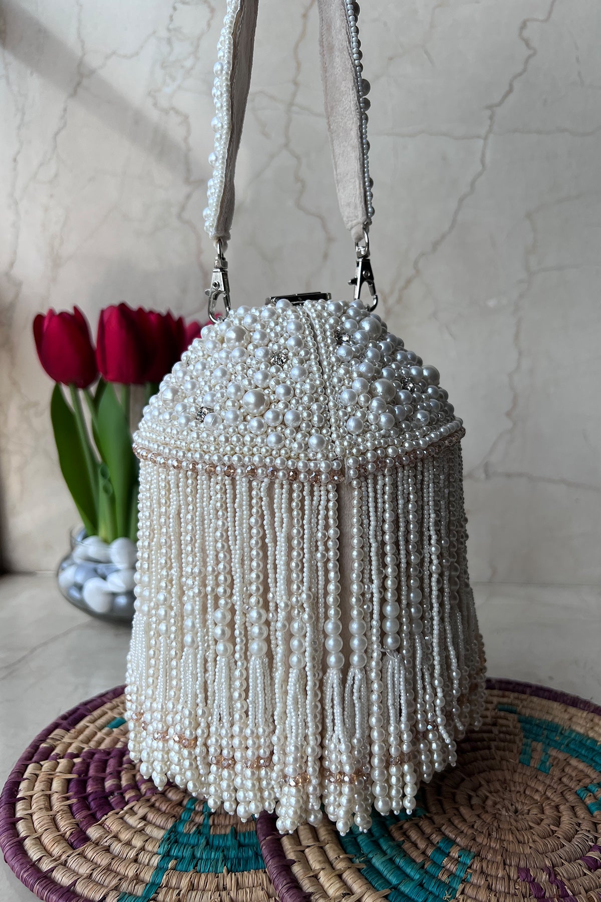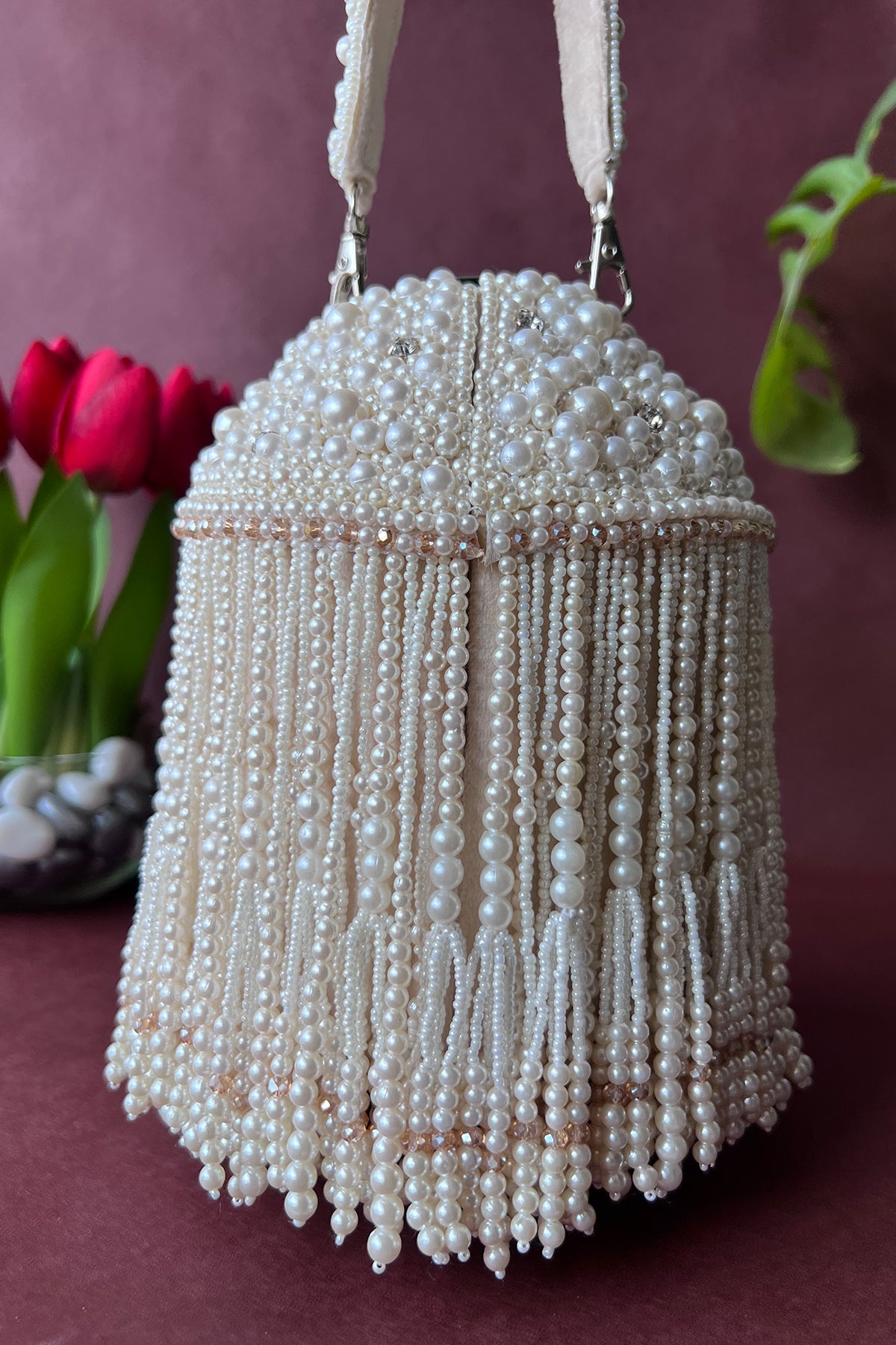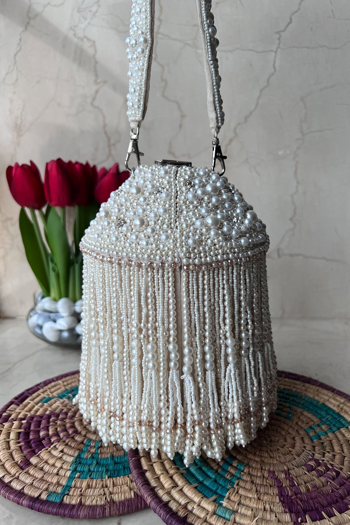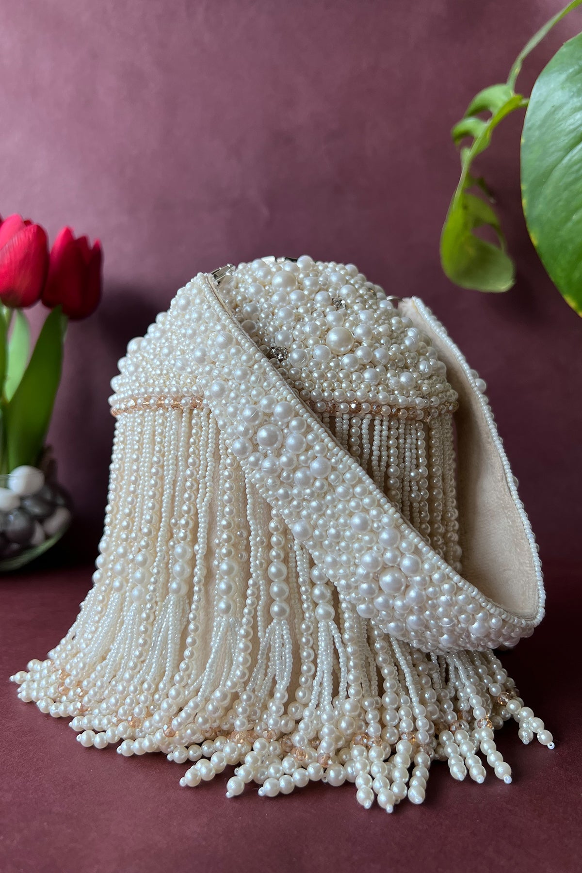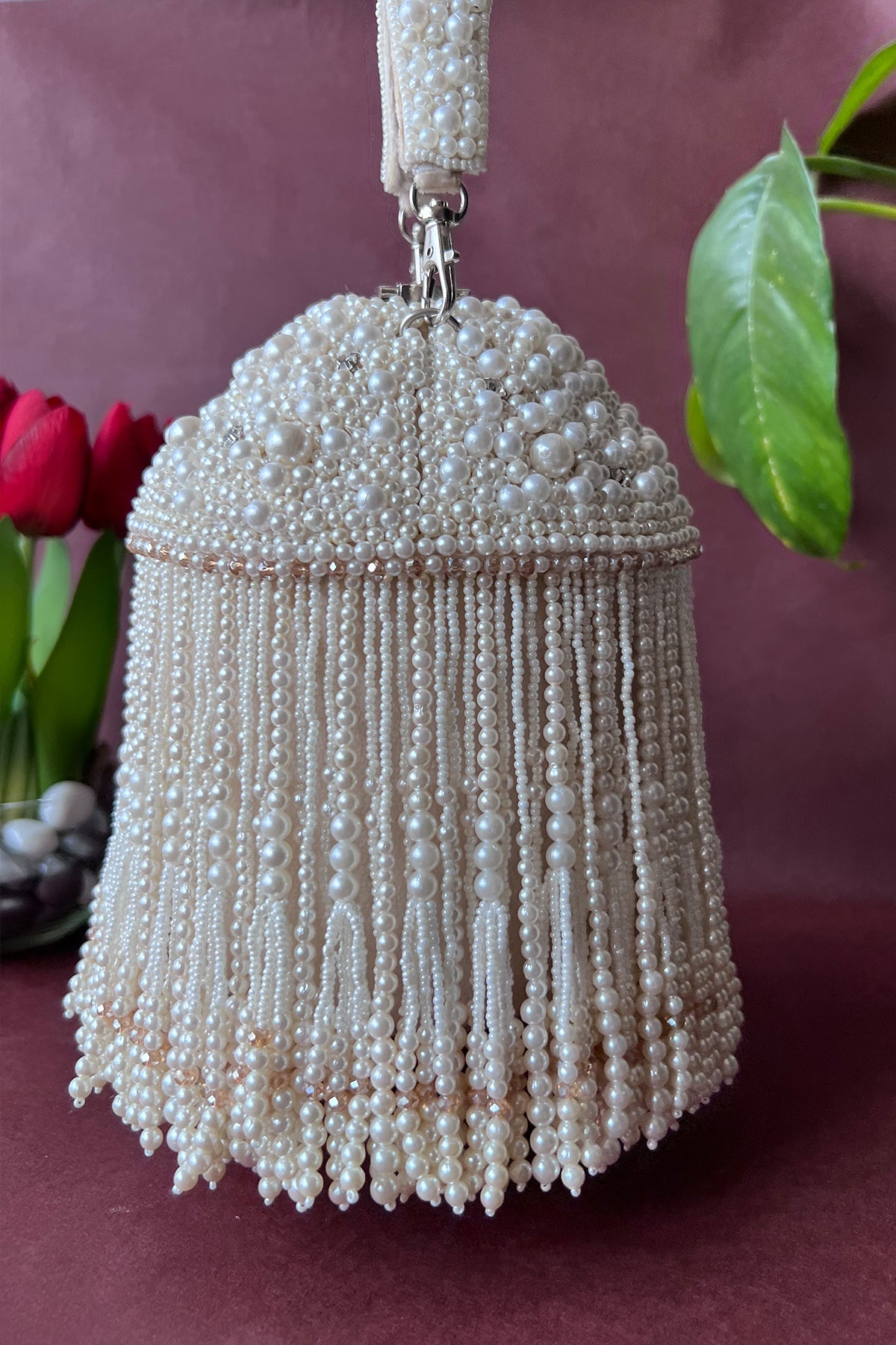 An incredible off white potli decorated with pearls n tassels all over and a little lock on the top, making it a convenient and fashionable addition to any outfit.