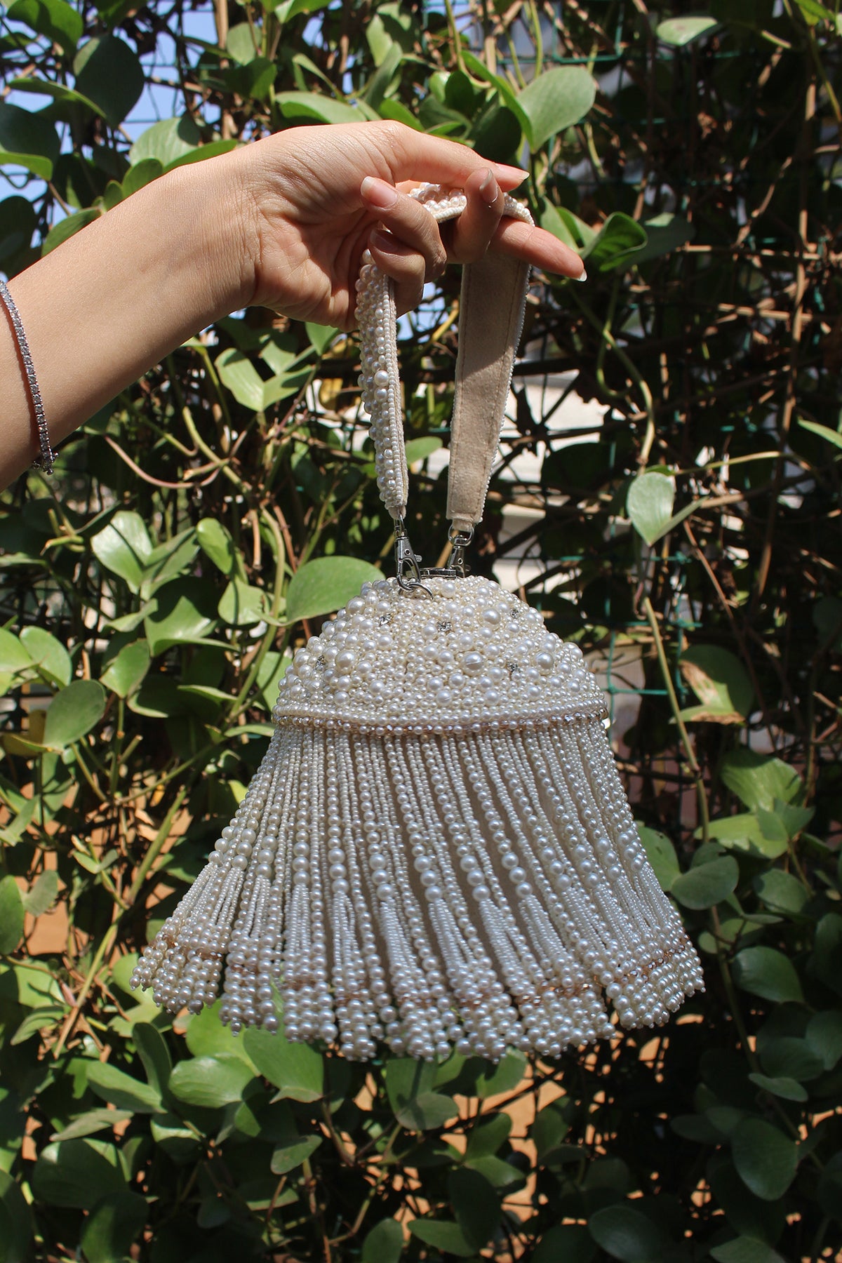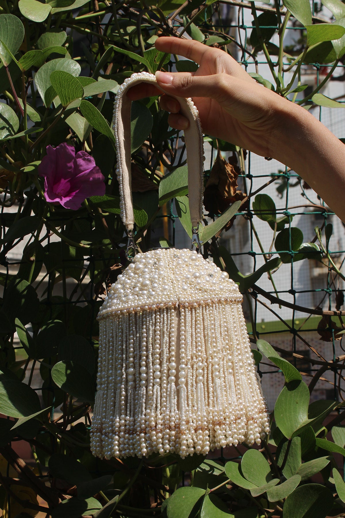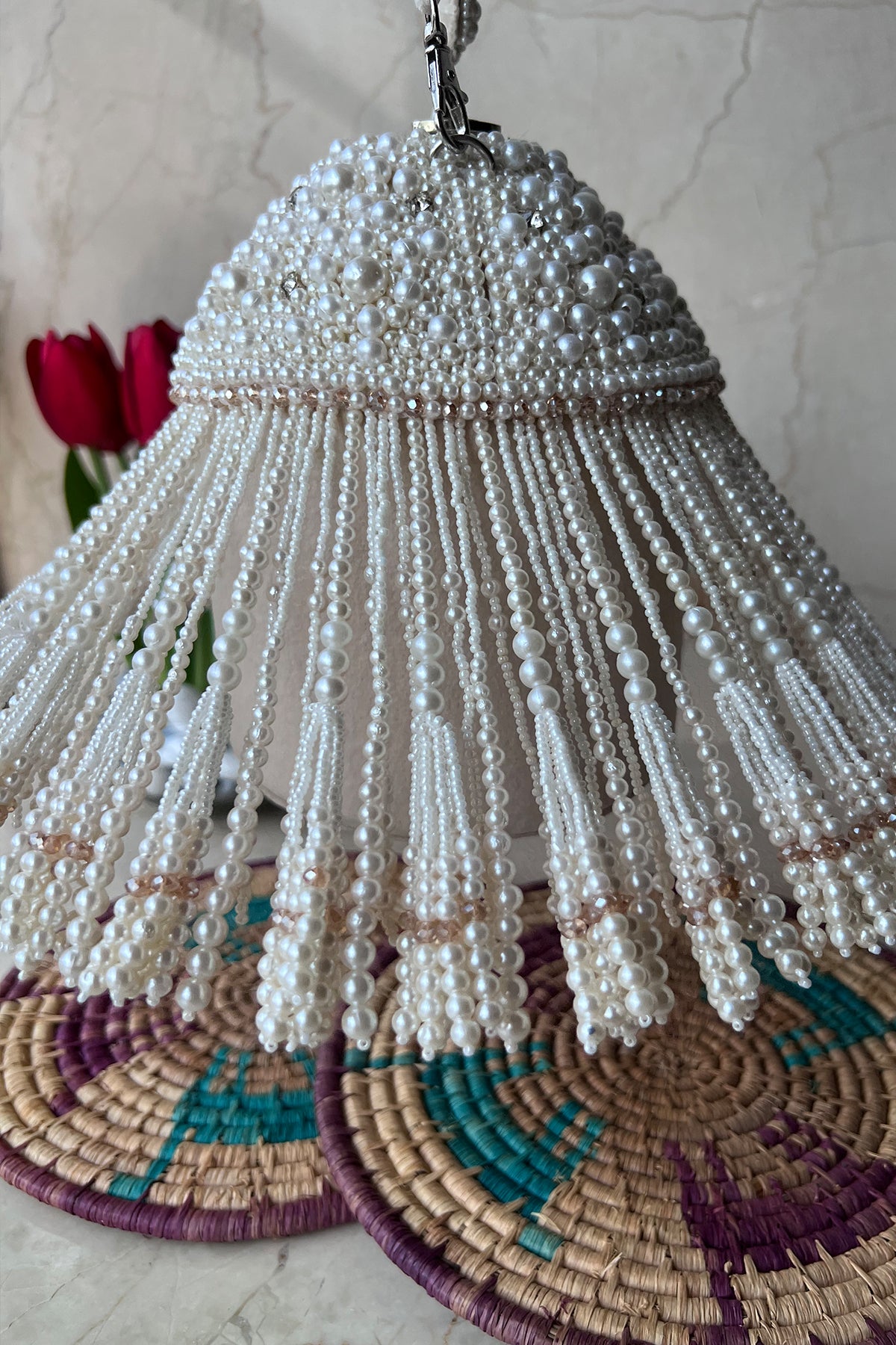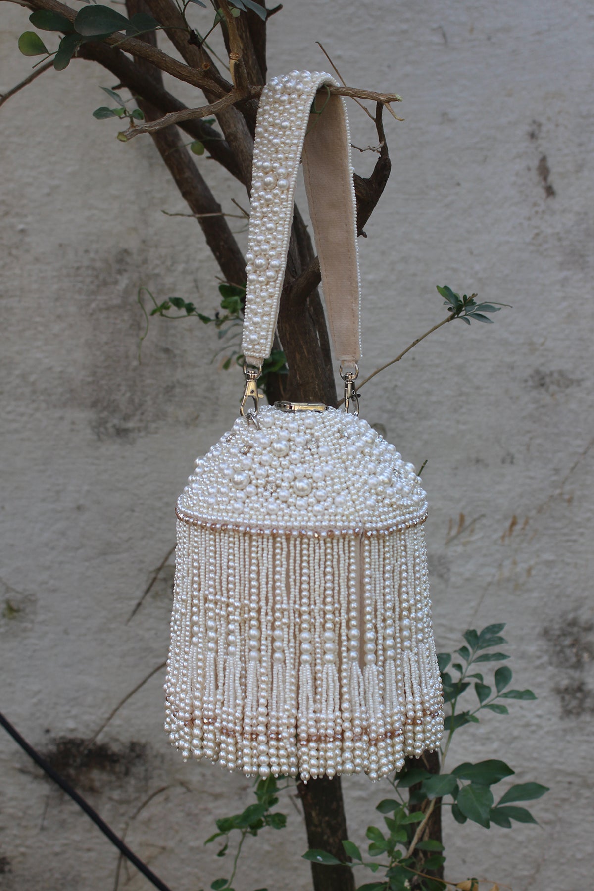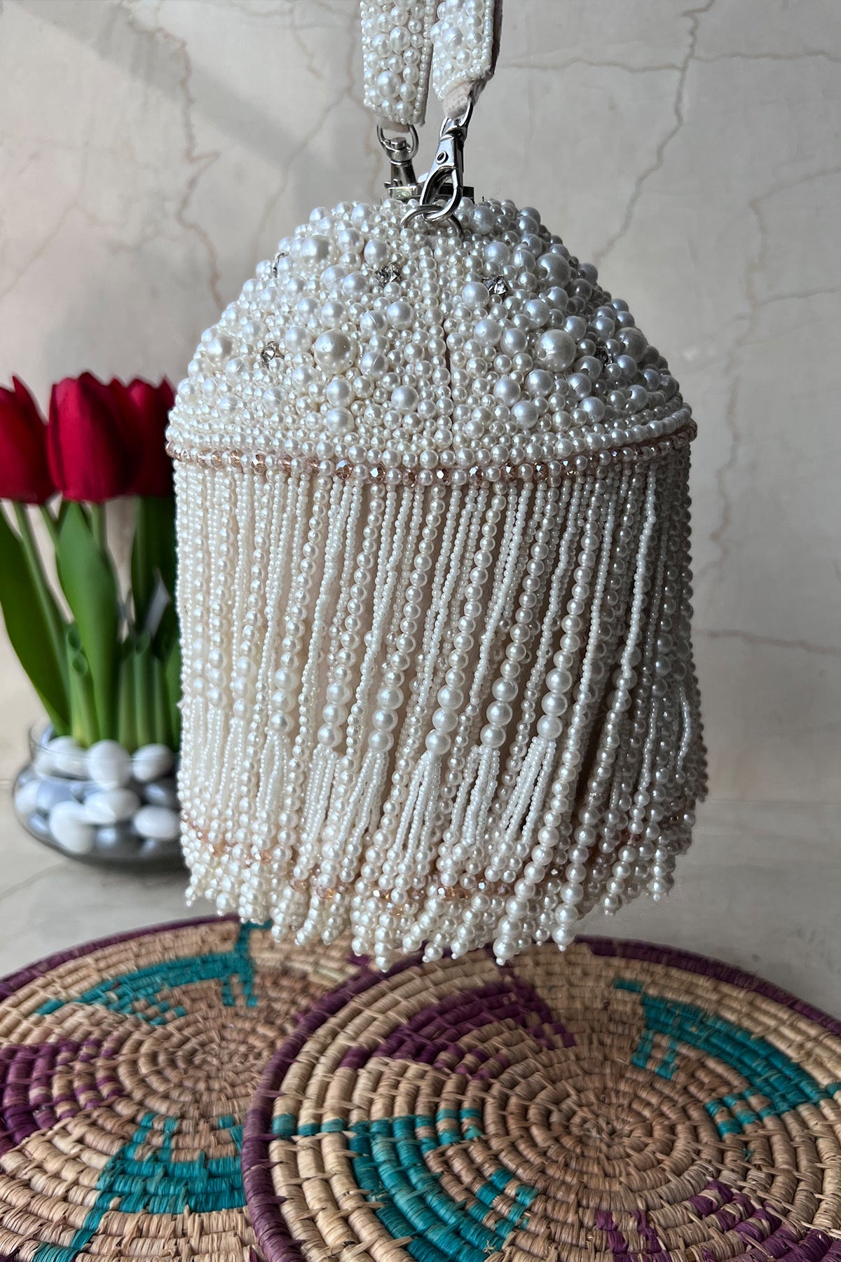 An incredible off white potli decorated with pearls n tassels all over and a little lock on the top, making it a convenient and fashionable addition to any outfit.