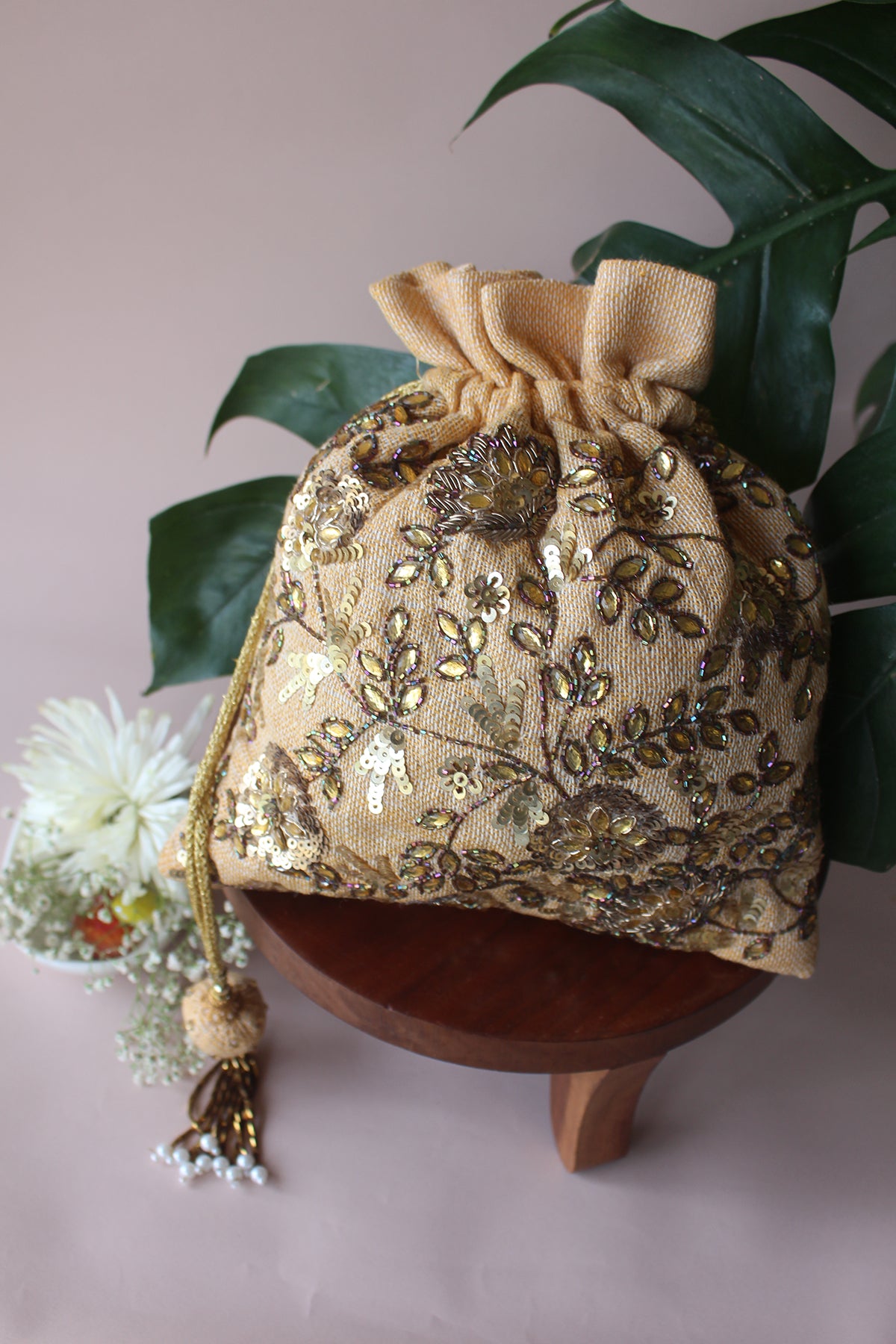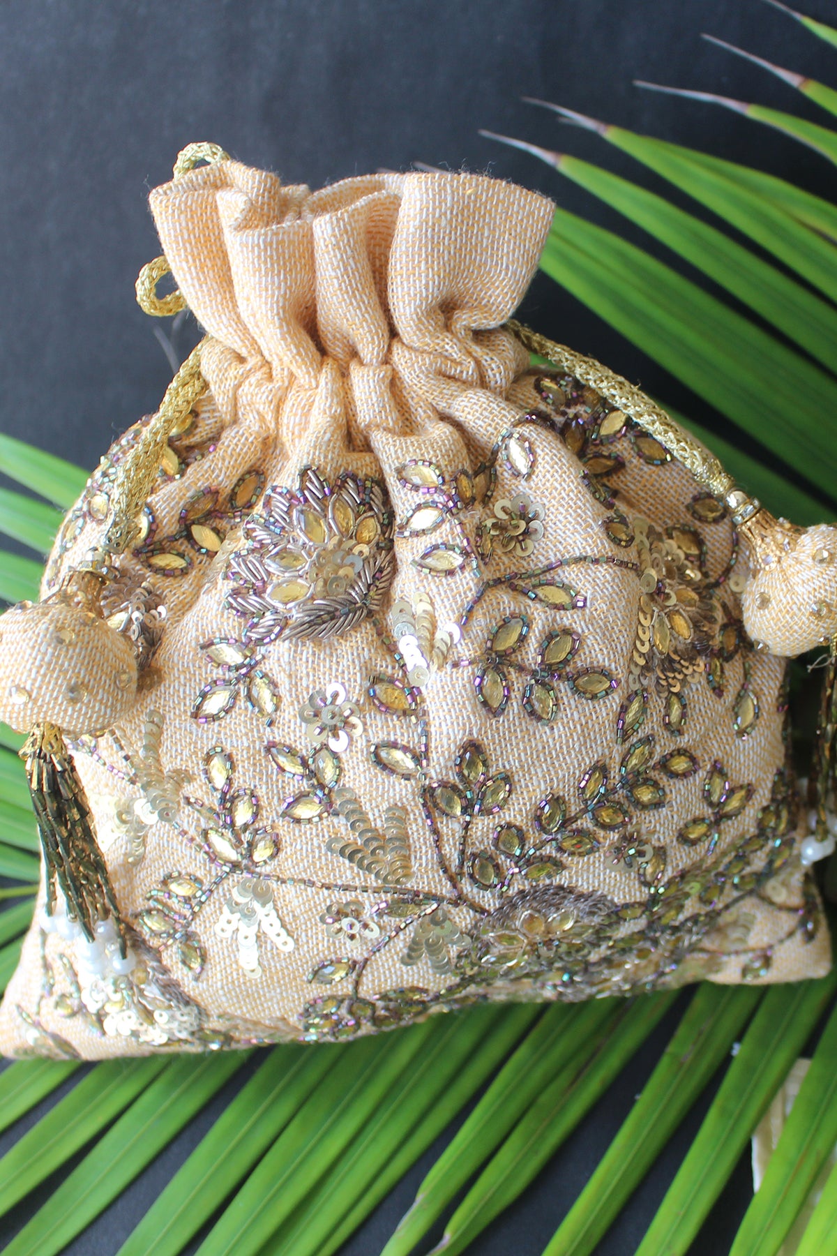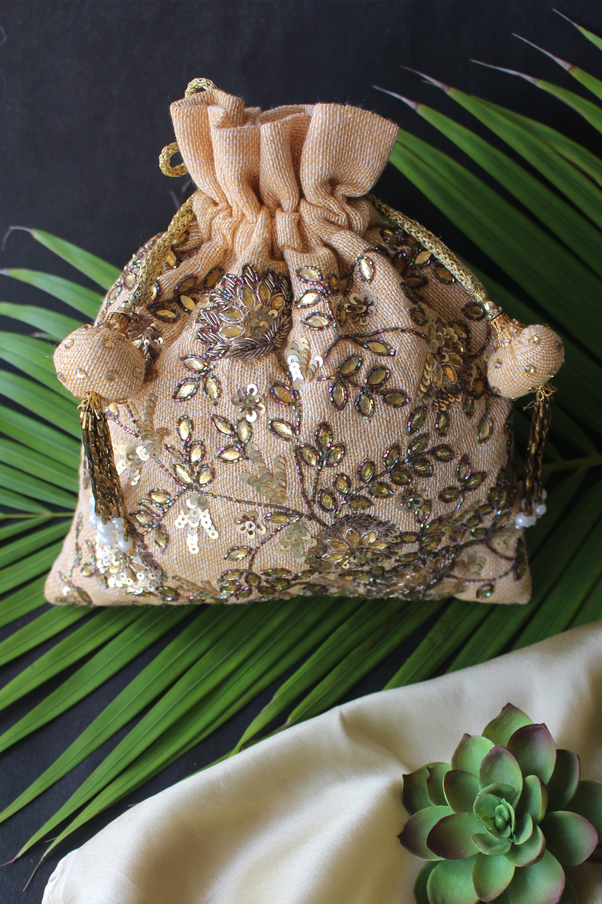 Nude jute potli with minimal and elegant Gota work in a champagne finish