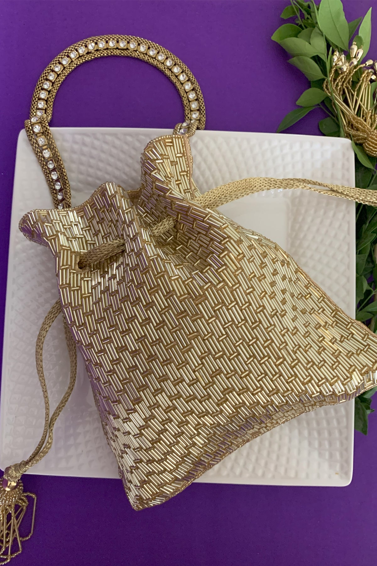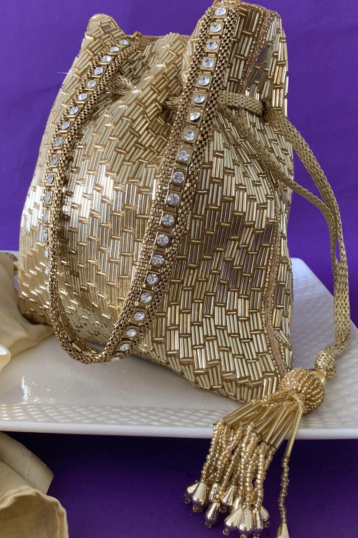 Light Gold saali work potli. The potli comes with a removable metallic handle which is encrusted with stone work. A chain is provided to enable you to wear the potli on your shoulder and be handsfree. Work on both sides.
