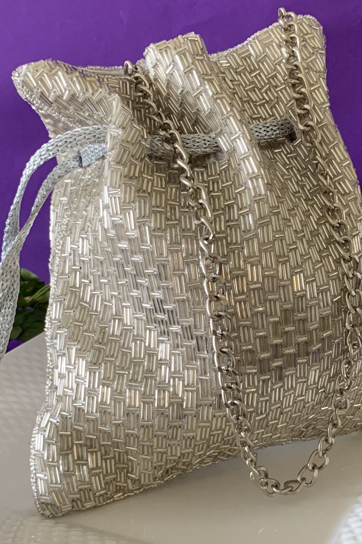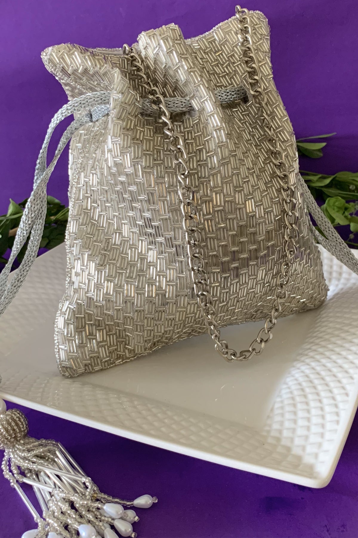 Silver saali work potli. The potli comes with a removable metallic handle which is encrusted with stone work. A chain is provided to enable you to wear the potli on your shoulder and be handsfree. Work on both sides.