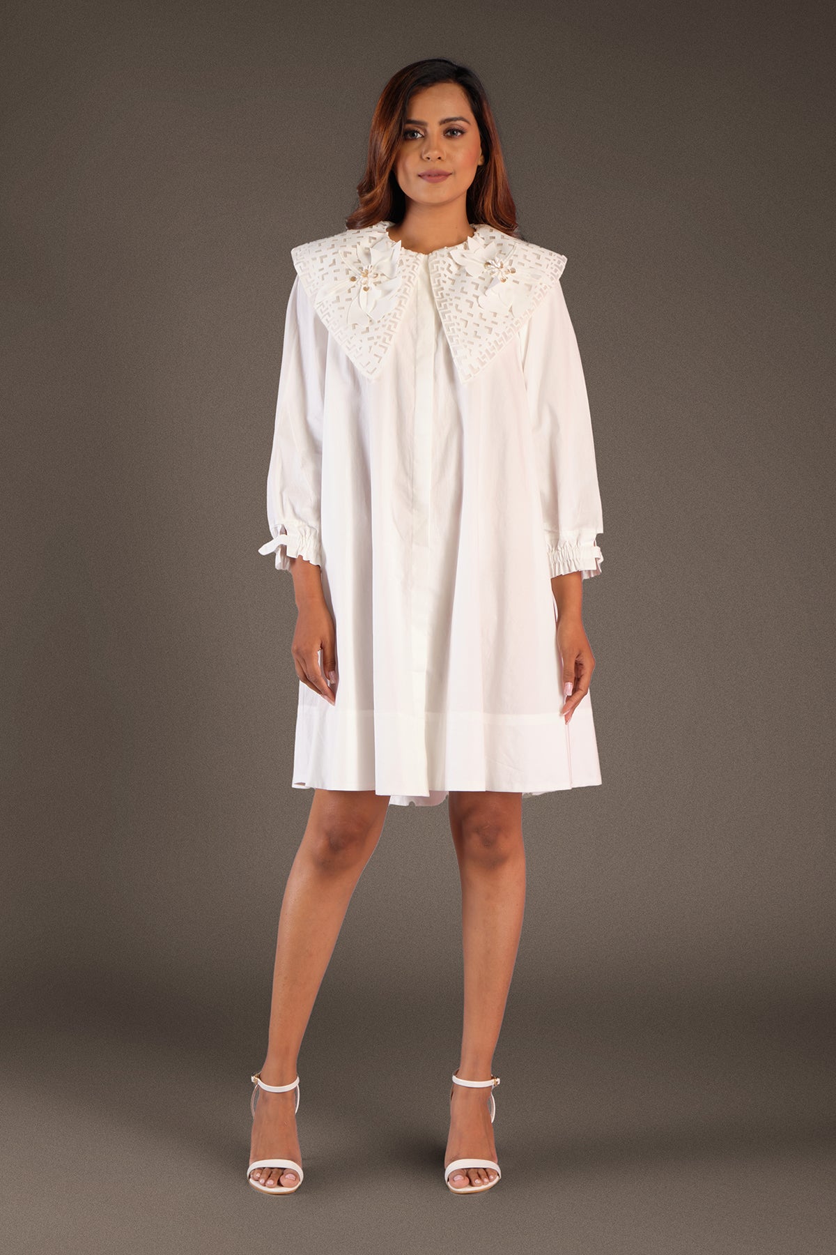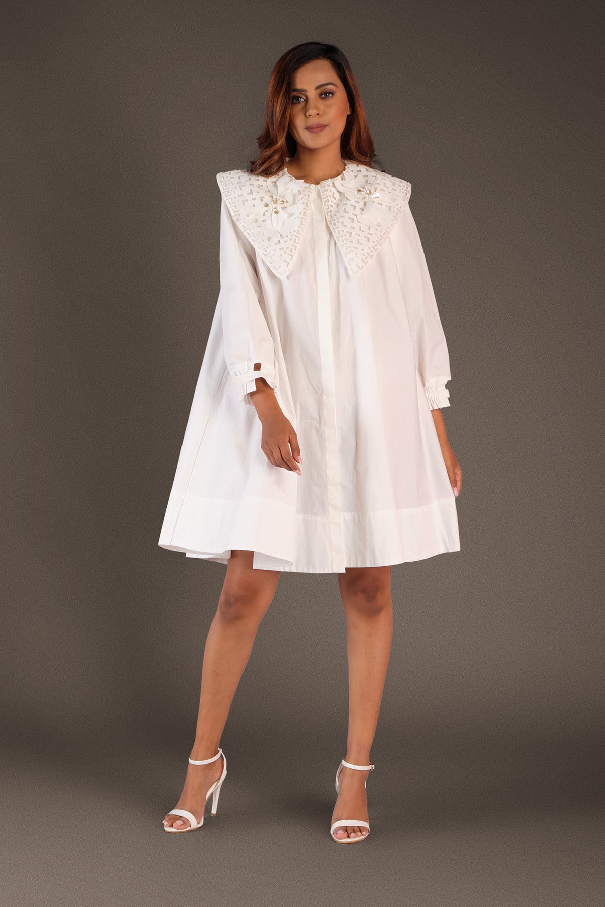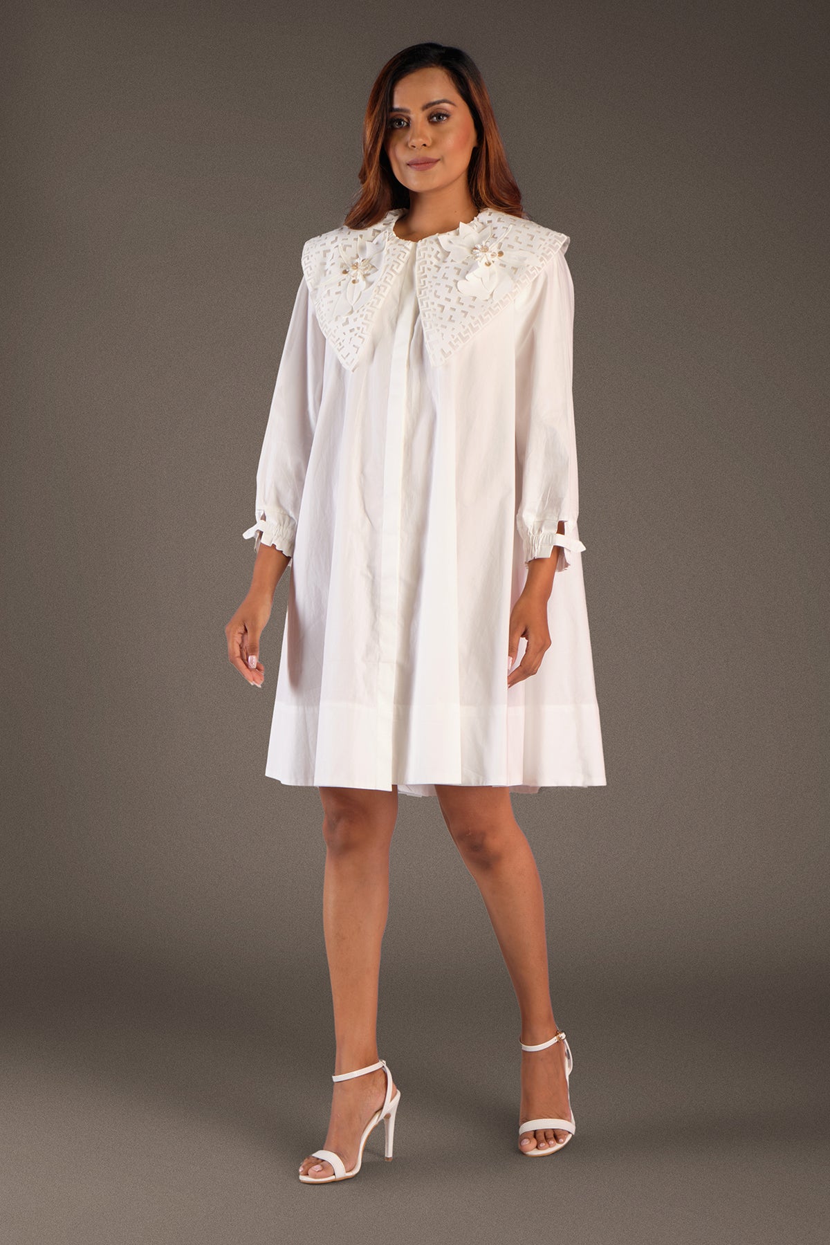 A-line cotton dress with cutwork collar & flower applique work.