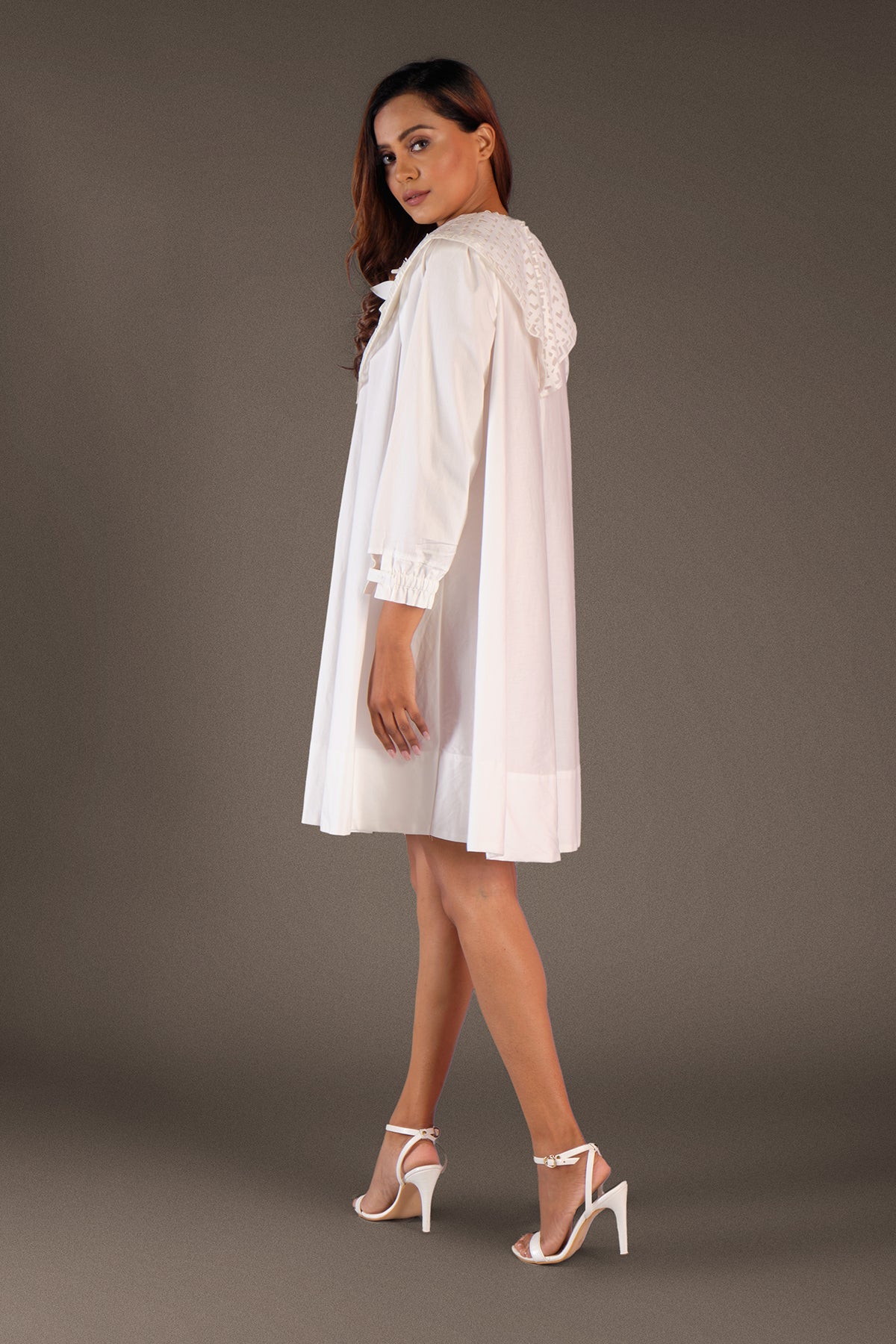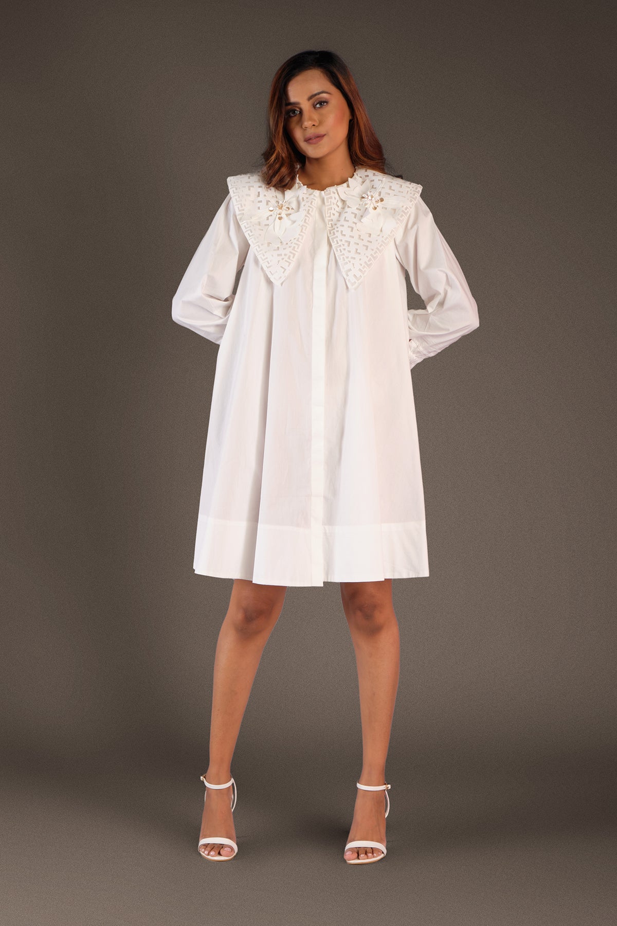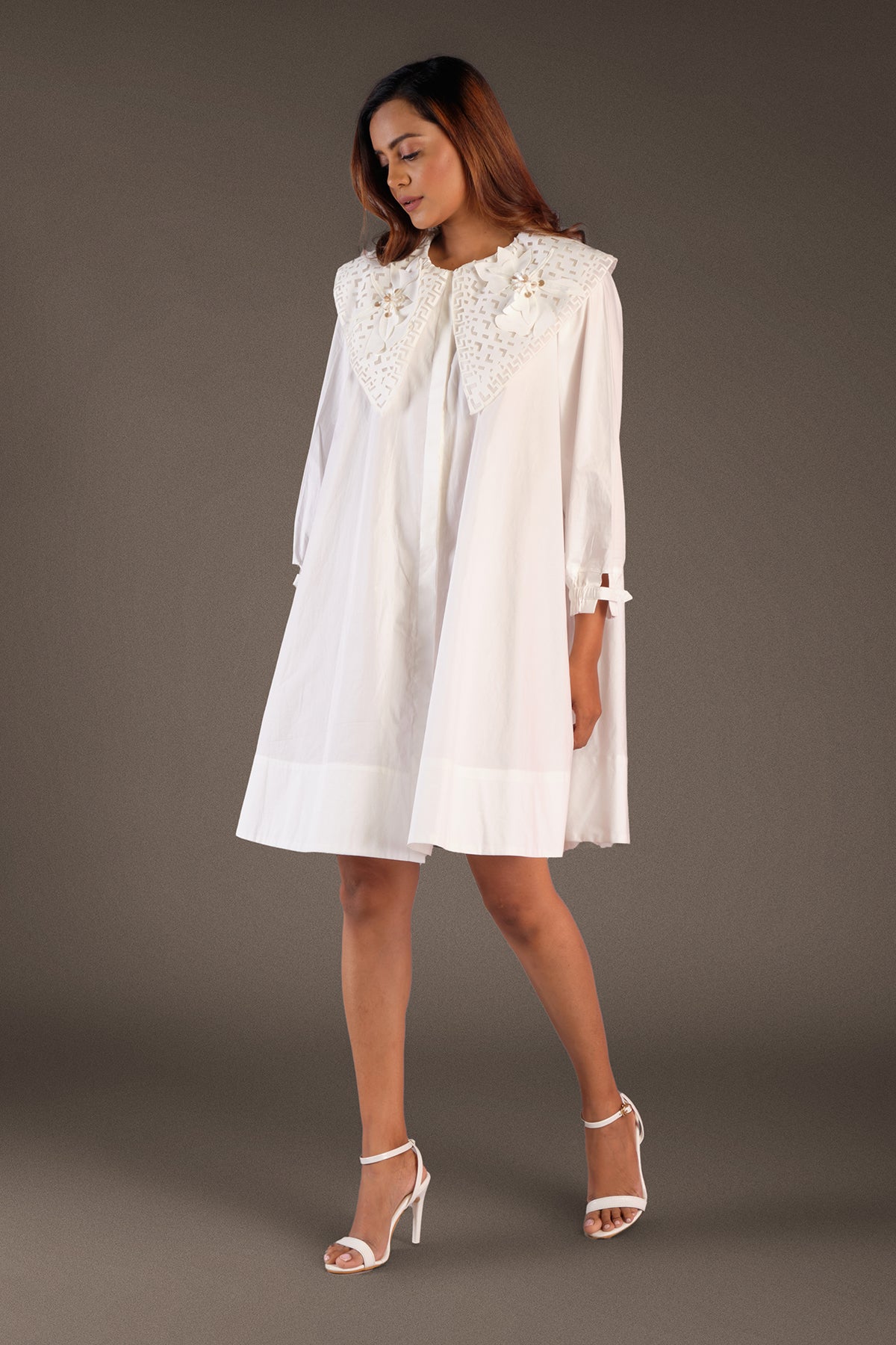 A-line cotton dress with cutwork collar & flower applique work.