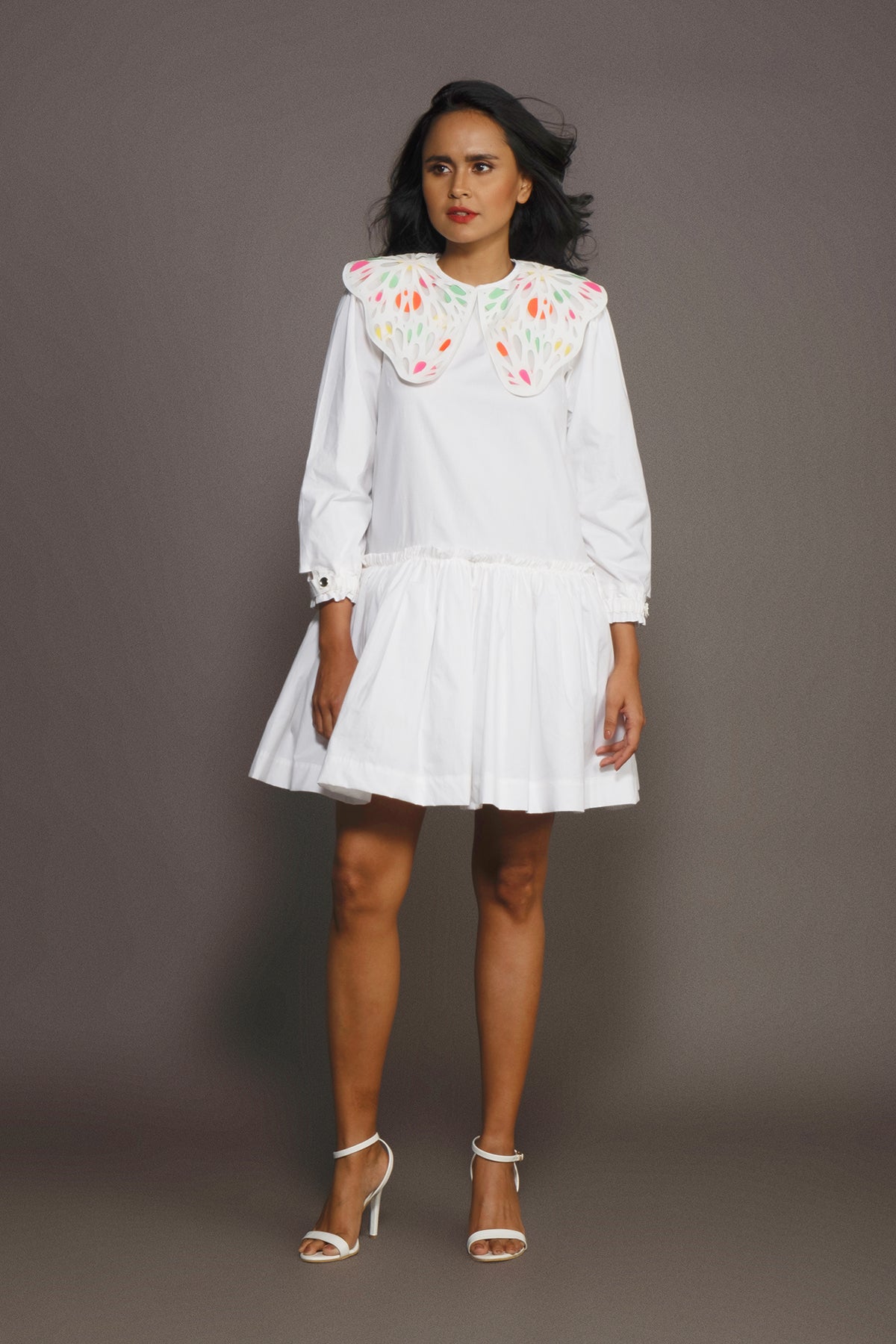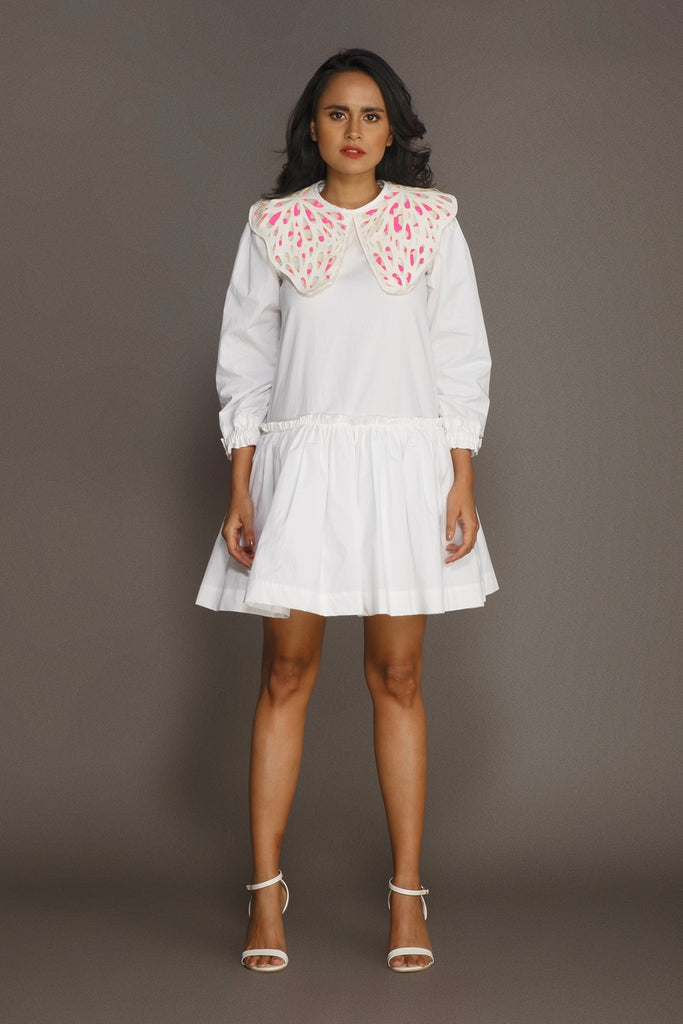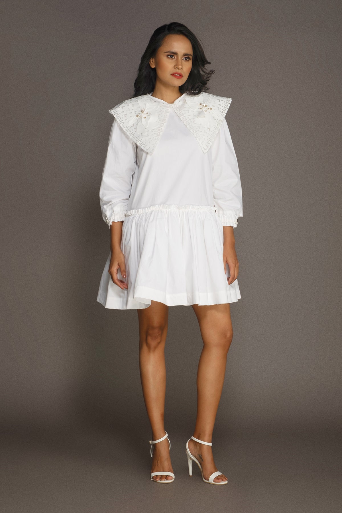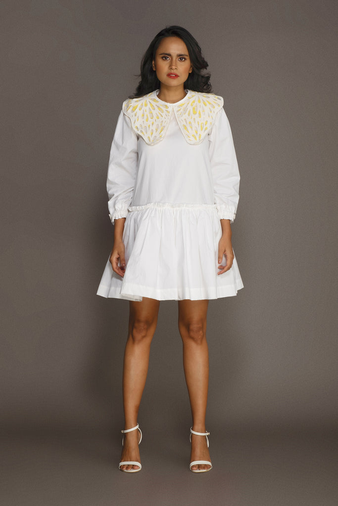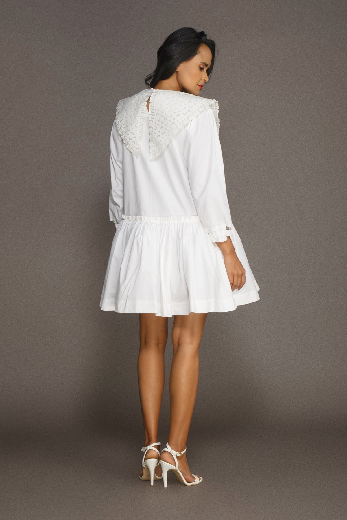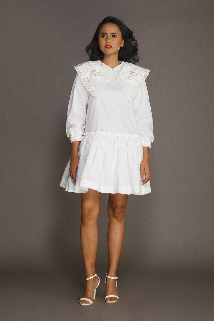 Cotton dress with puff sleeves and frill at the bottom comes with detachable cutwork collar.