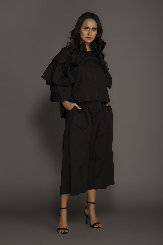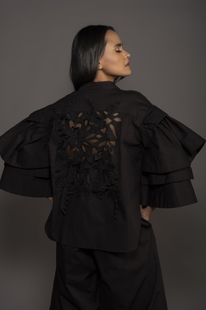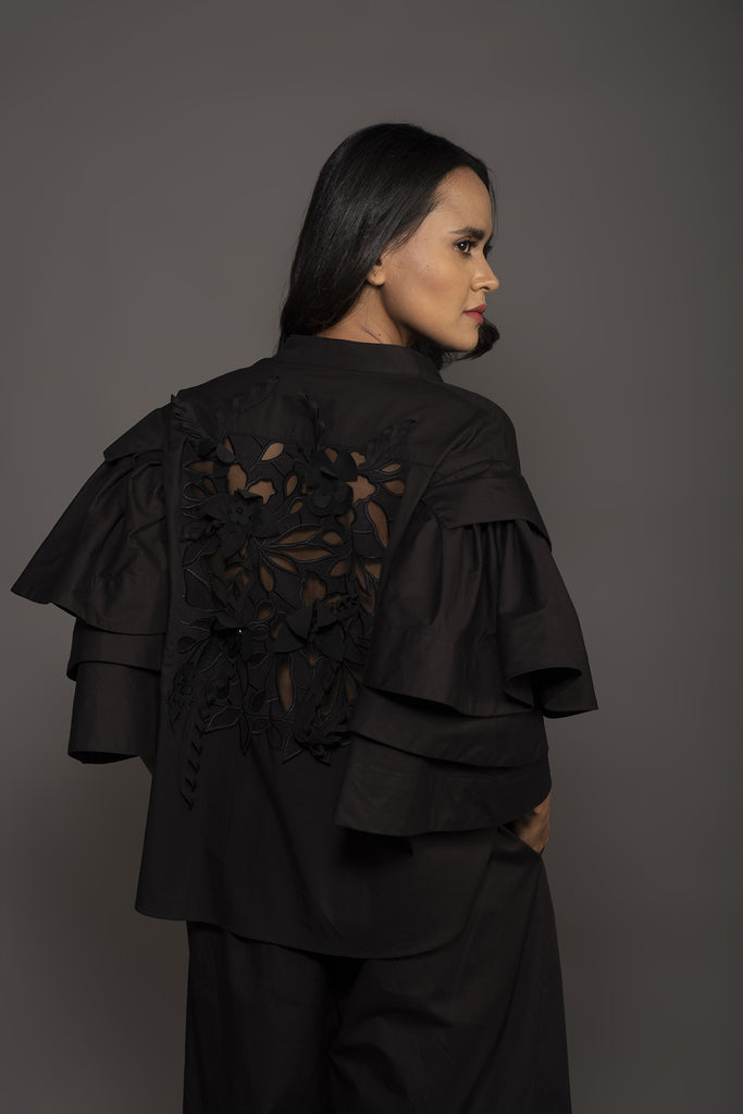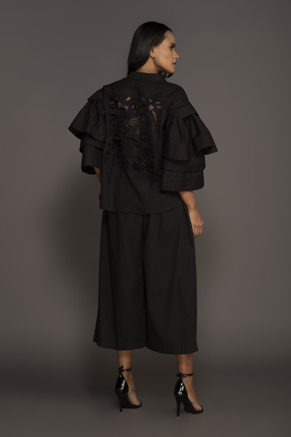 Cotton Layered sleeve top & pants co-ord set with embroidery & flower applique work at back.