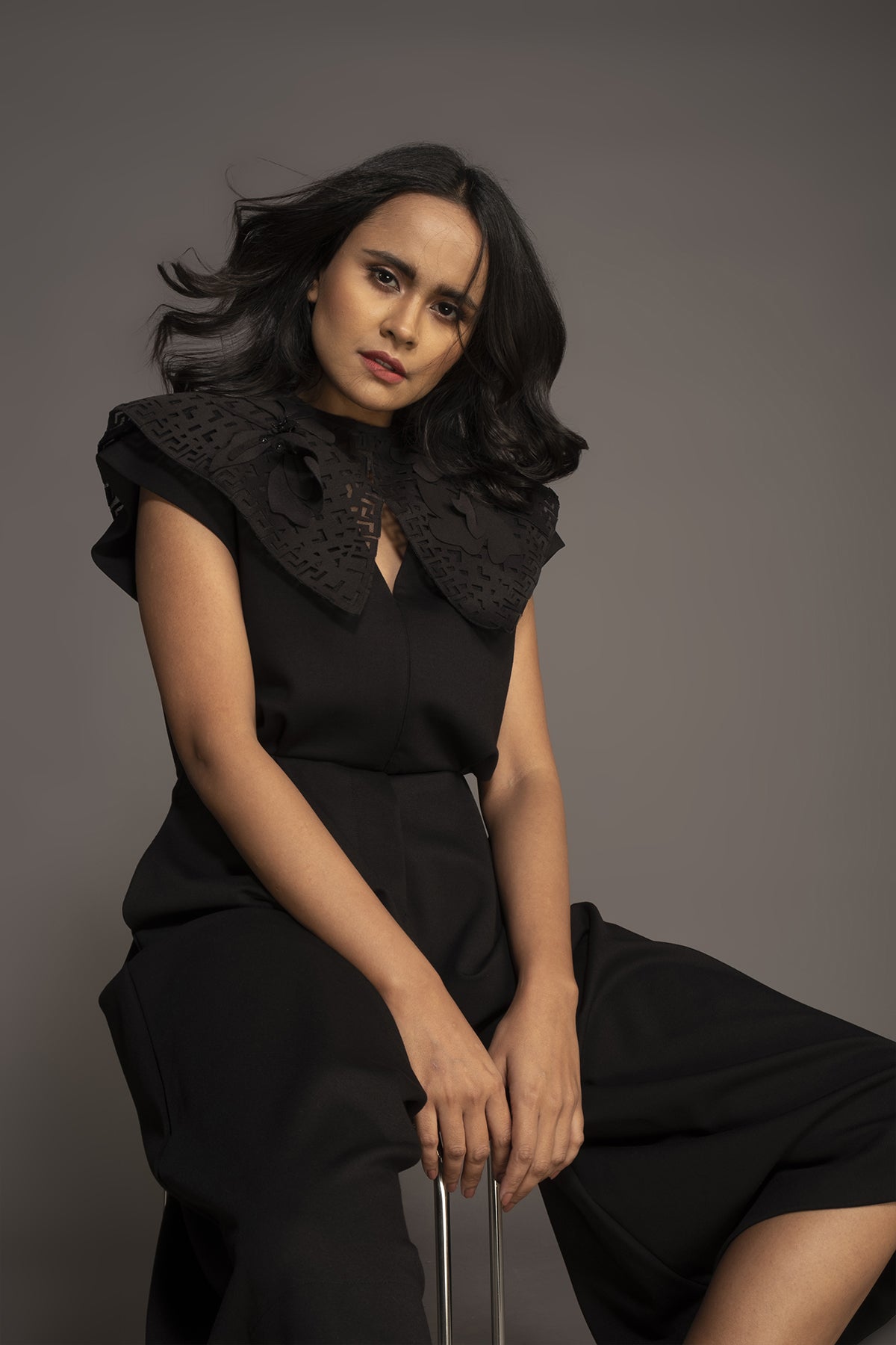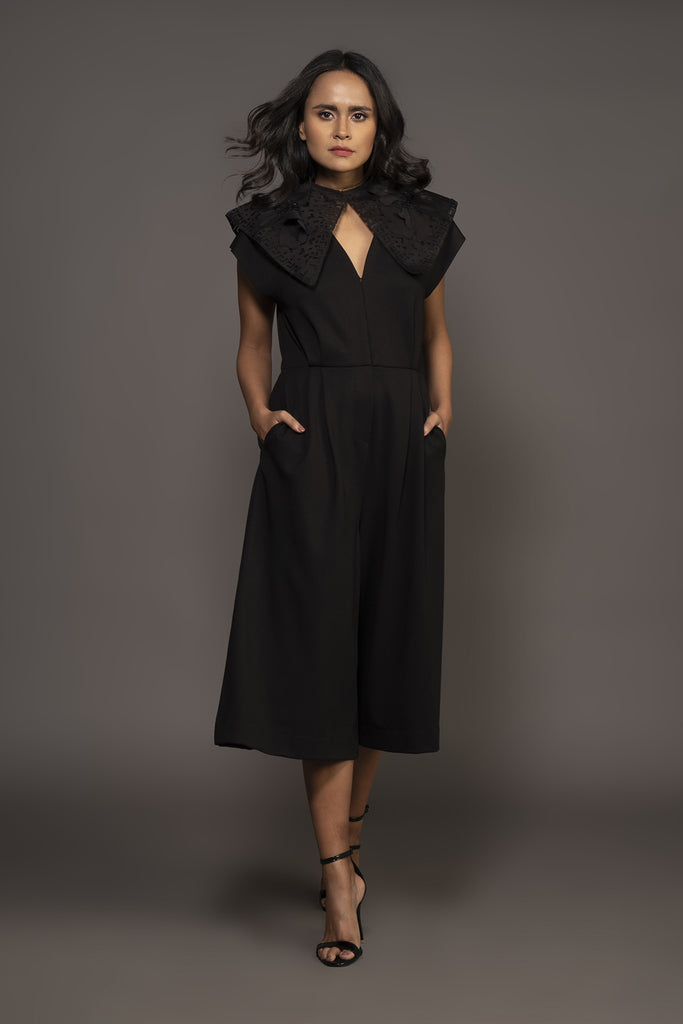 Loose Fit roma jumpsuit with detachable cutwork collar.
