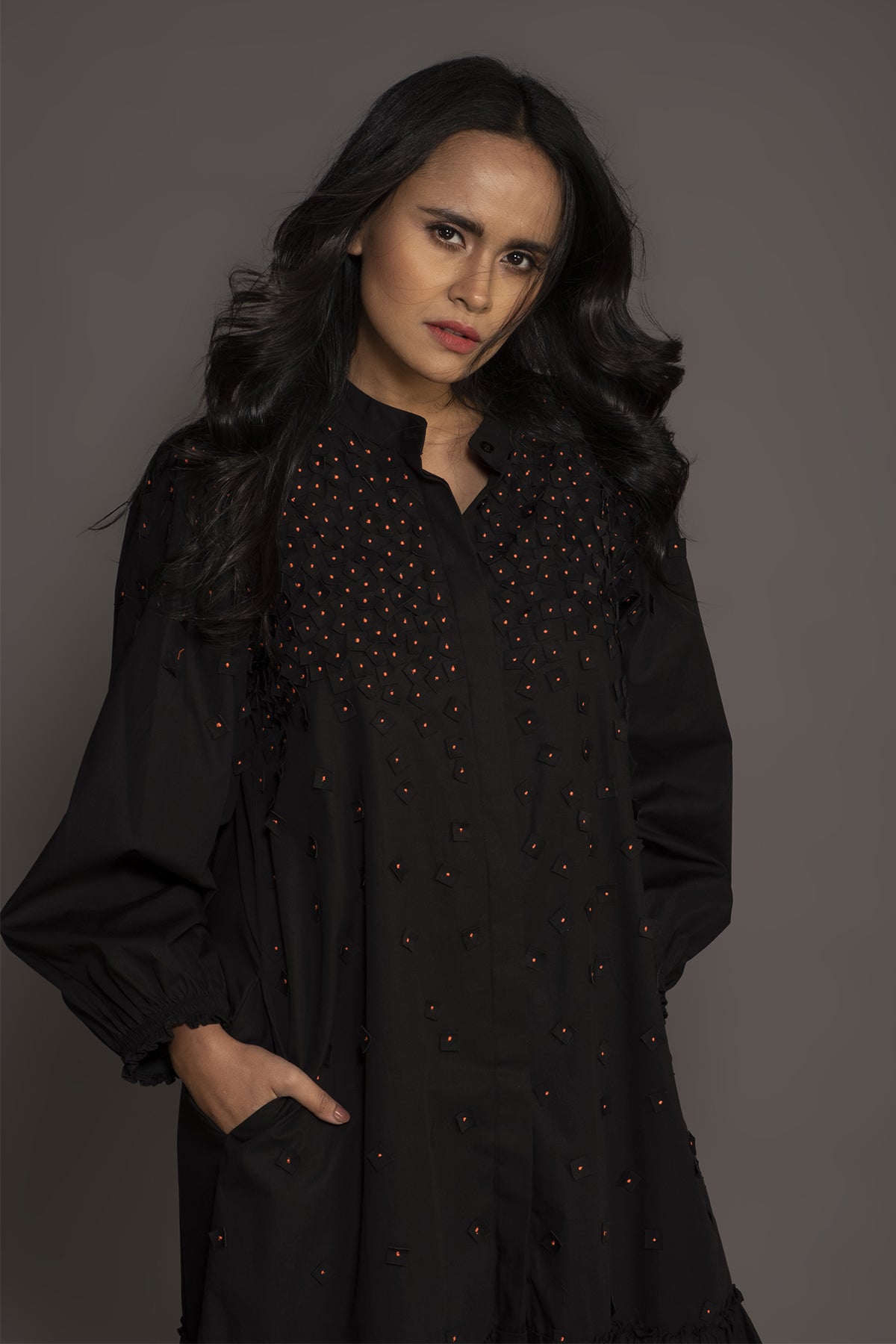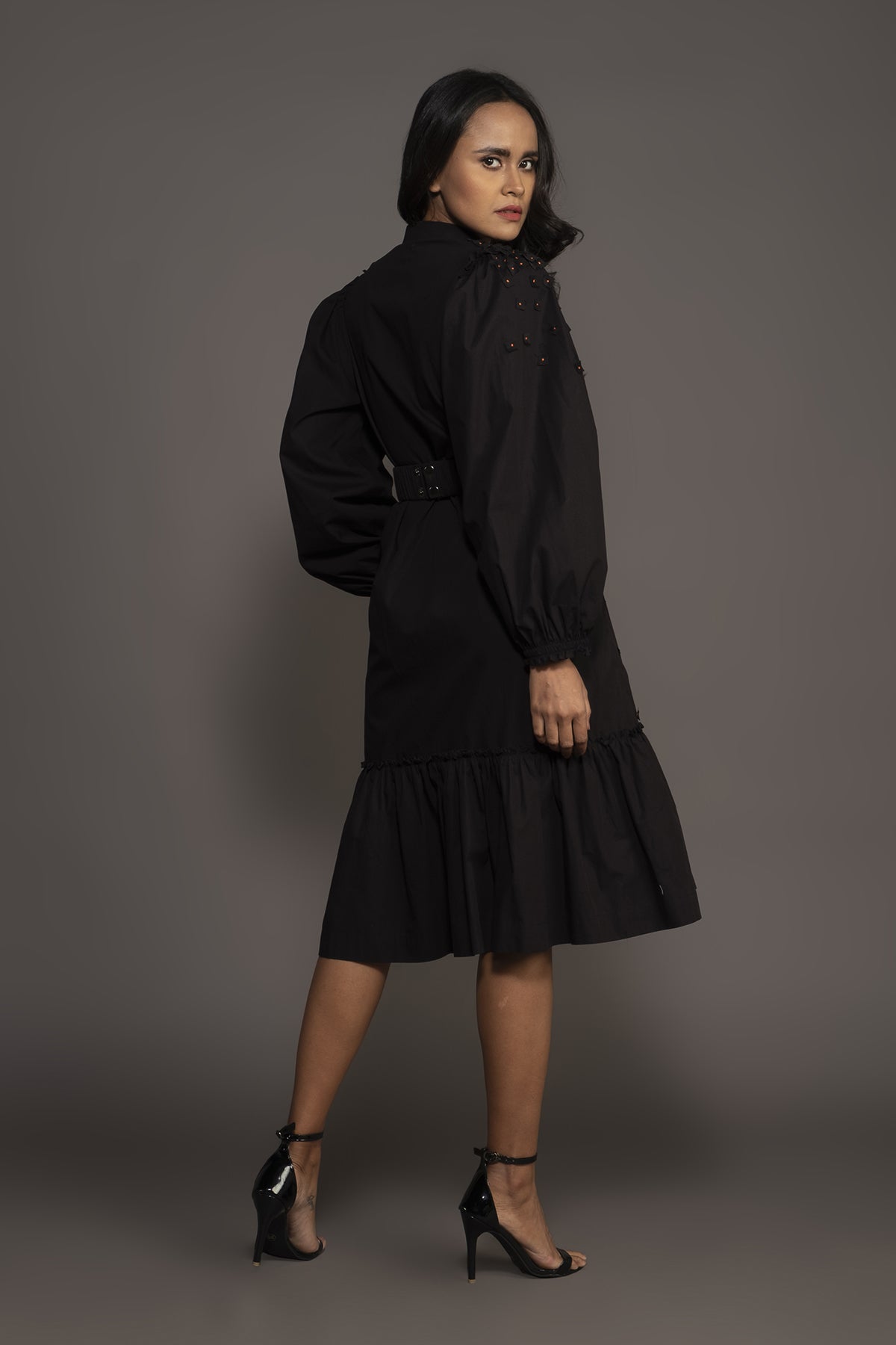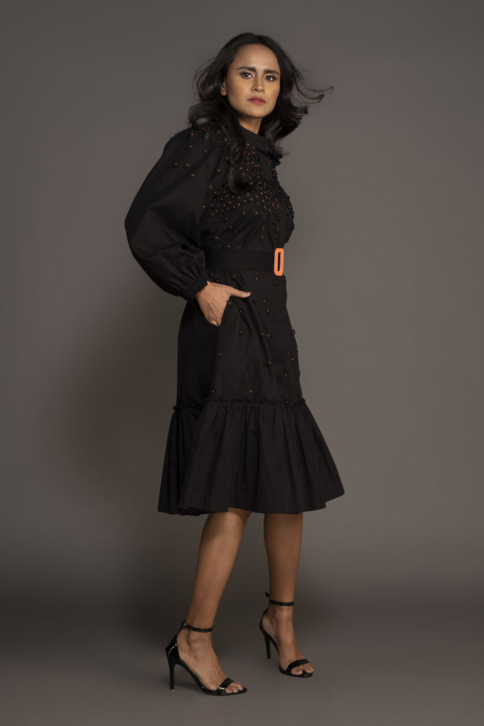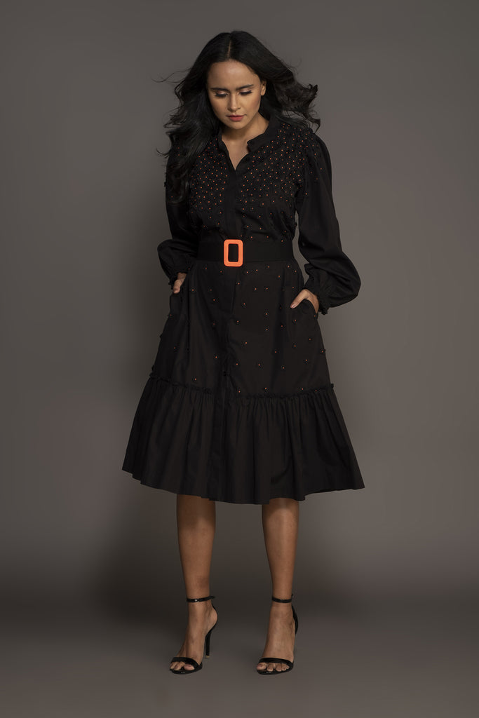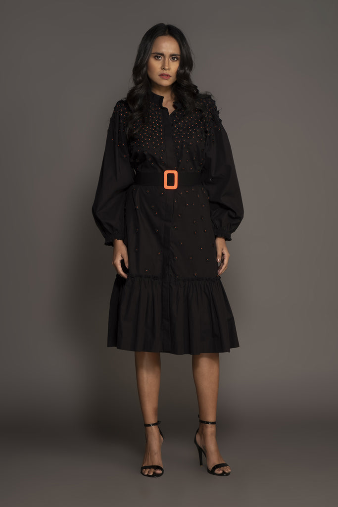 Neon embroidery Shirt dress with puff sleeves & ruffles at the bottom comes with neon orange buckle belt.DOES NOT COME WITH A BELT.