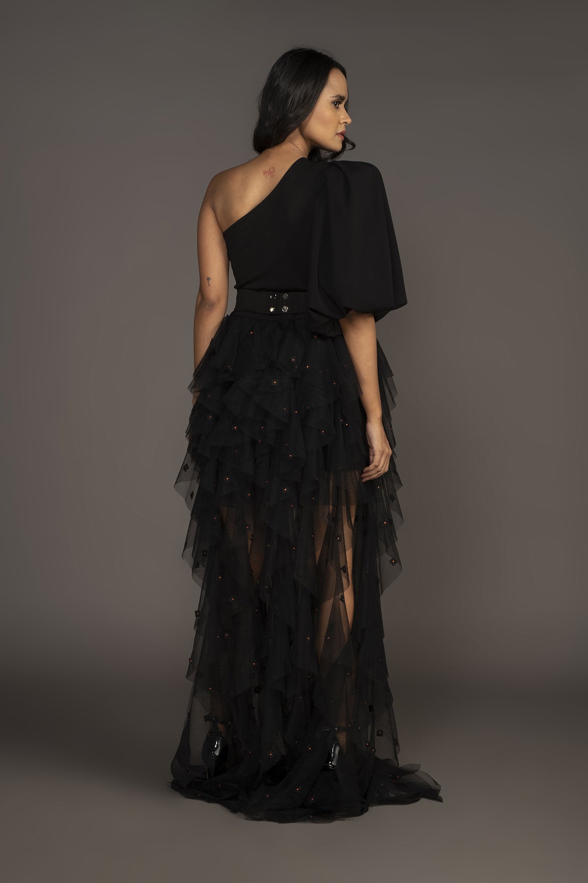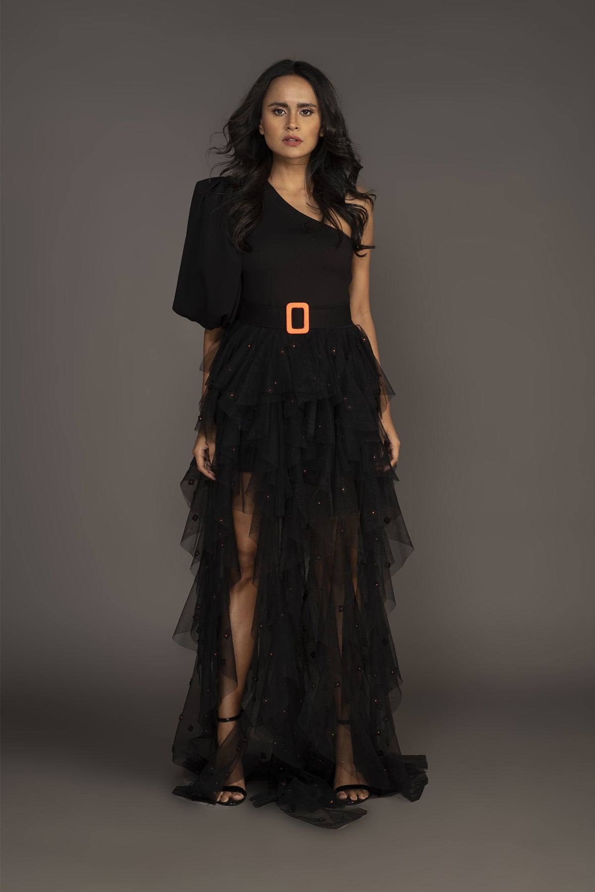 One shoulder bodysuit with ruffled skirt with neon cutwork detailing & attached inner comes with a belt.