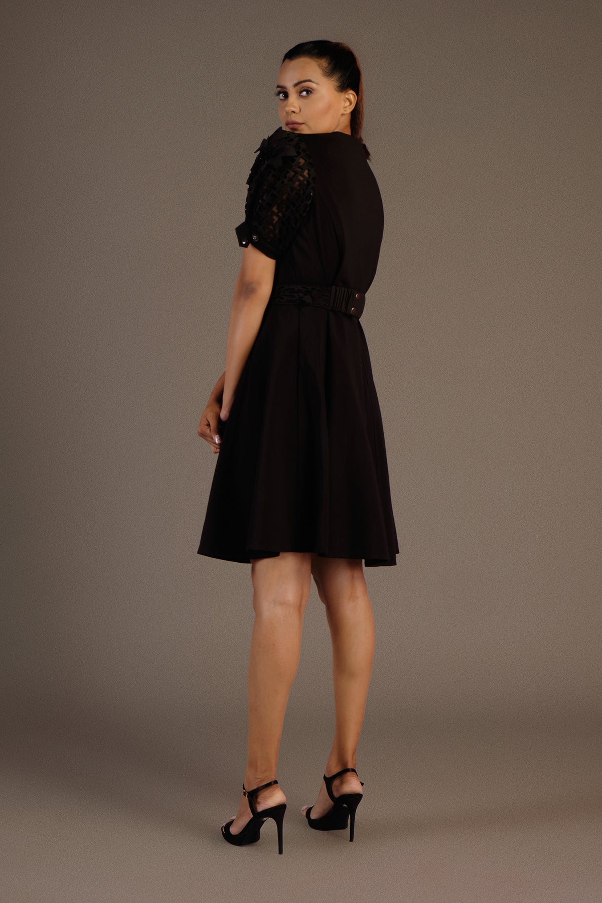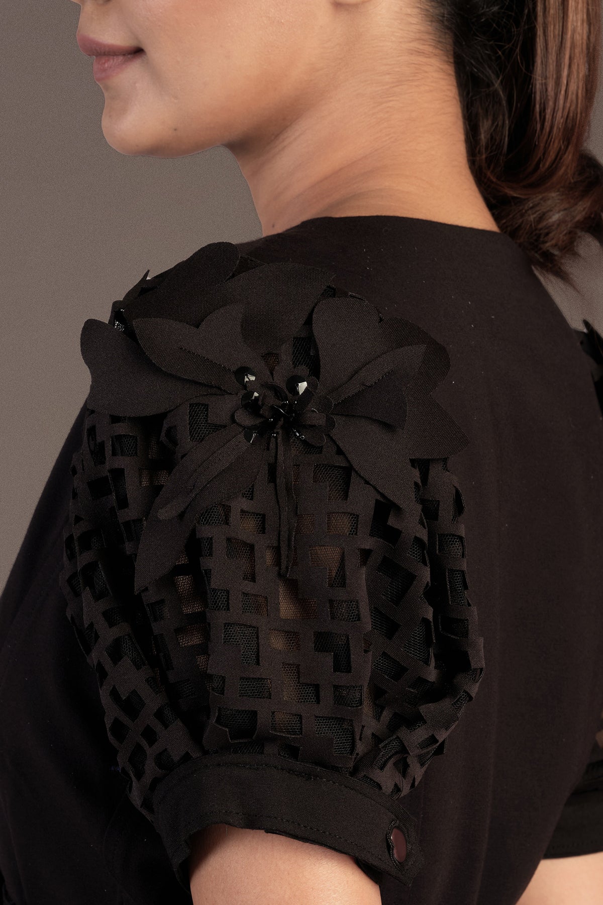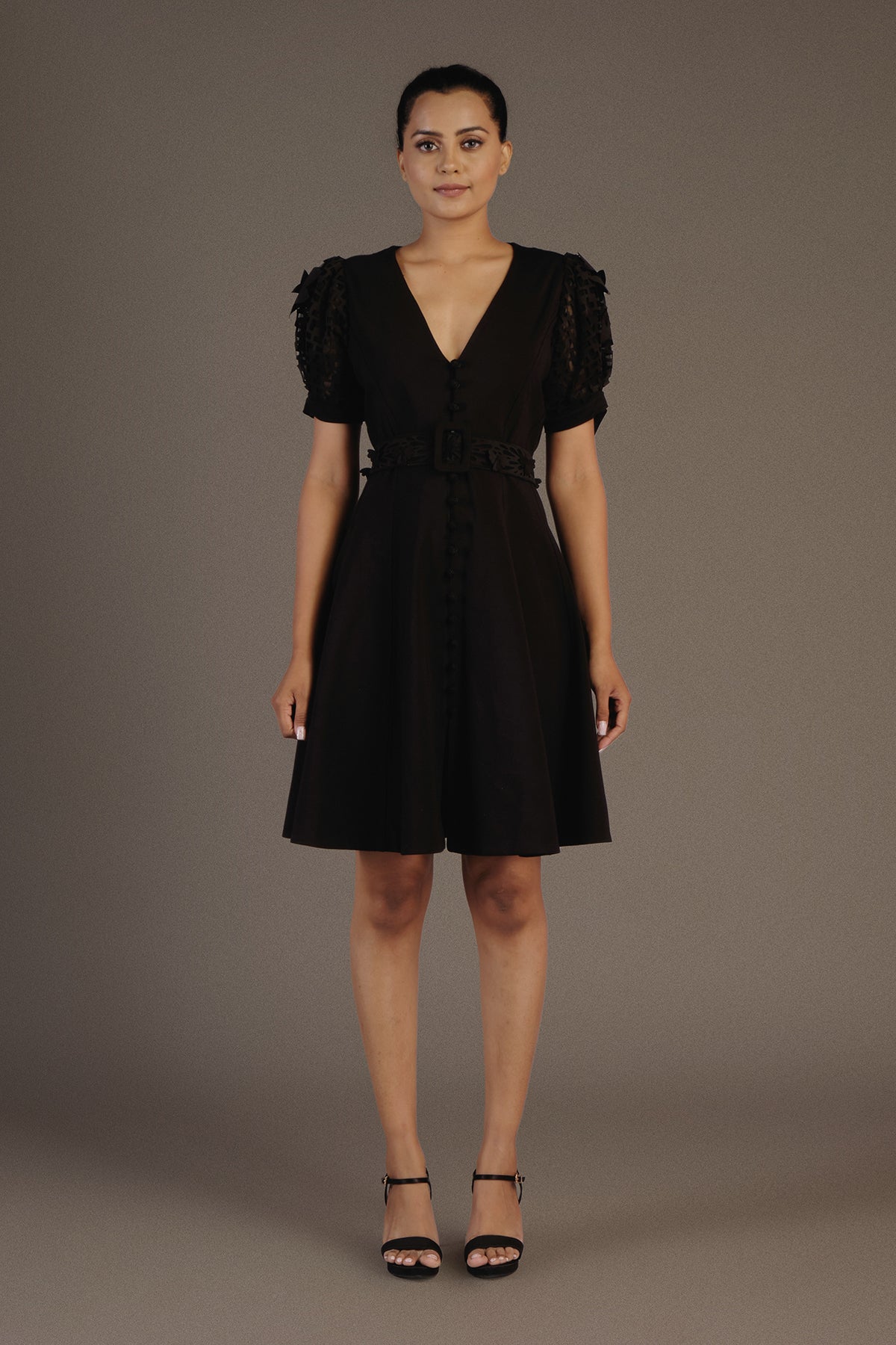 Panelled roma dress with loop buttons and flower applique work on cutwork sleeves.