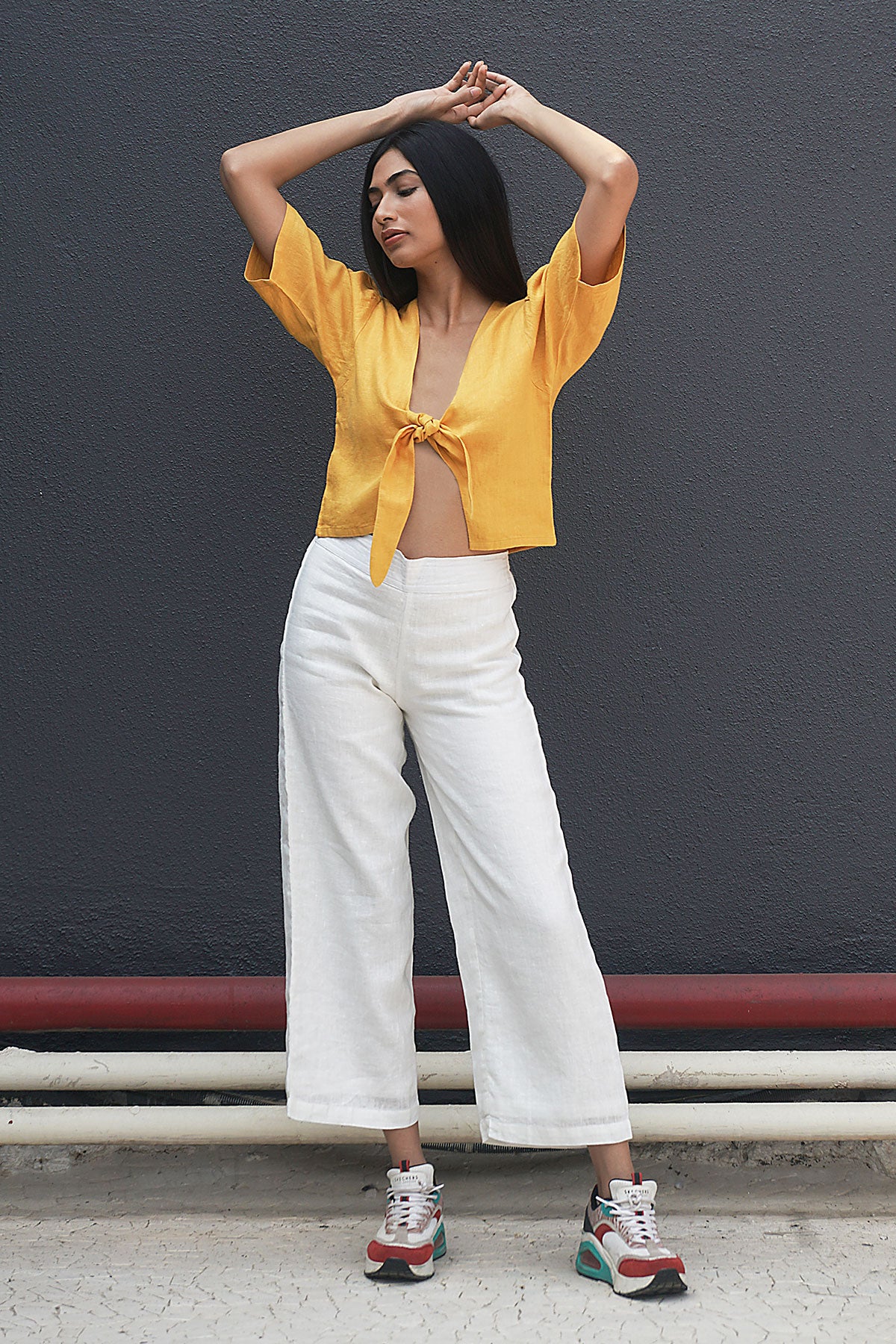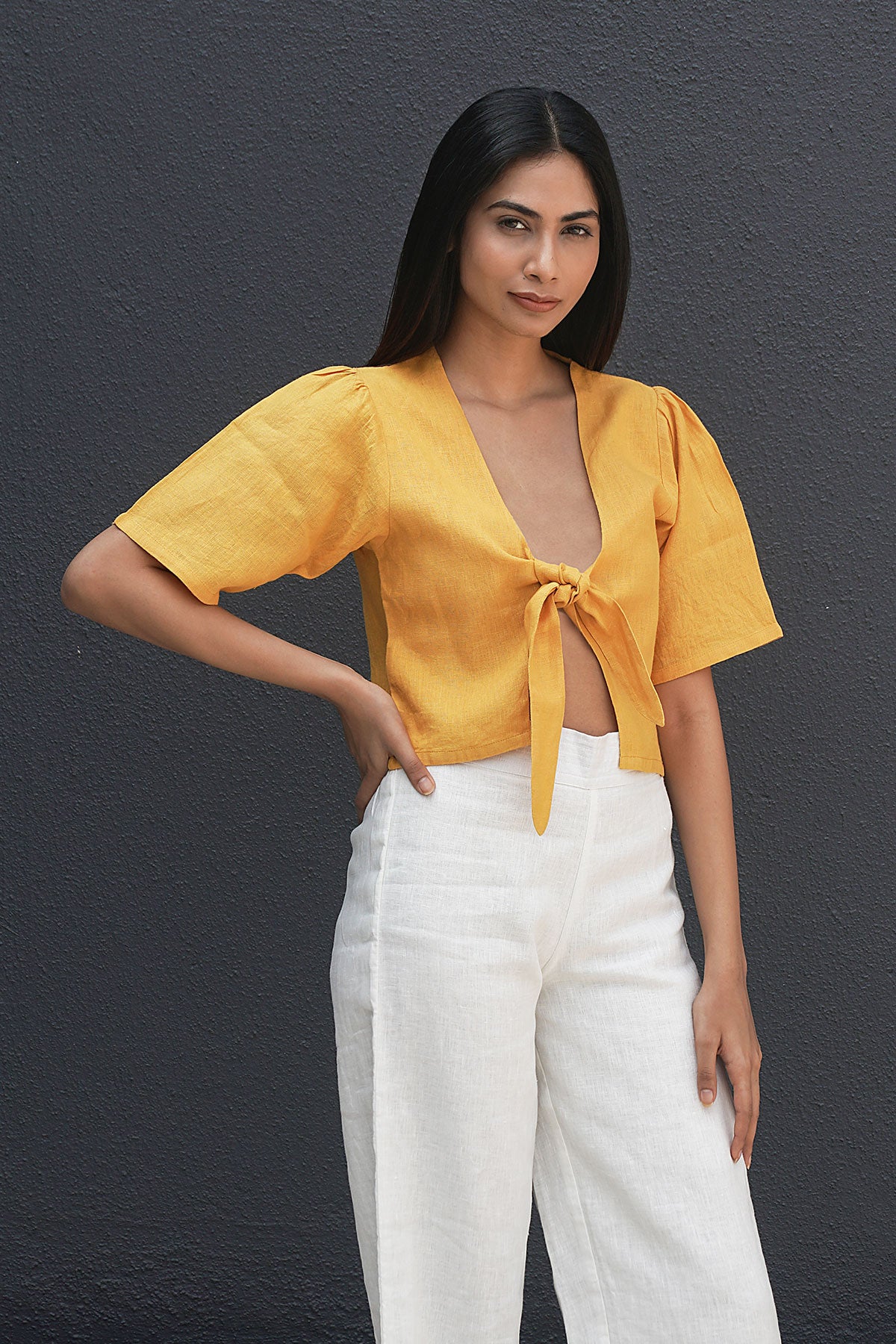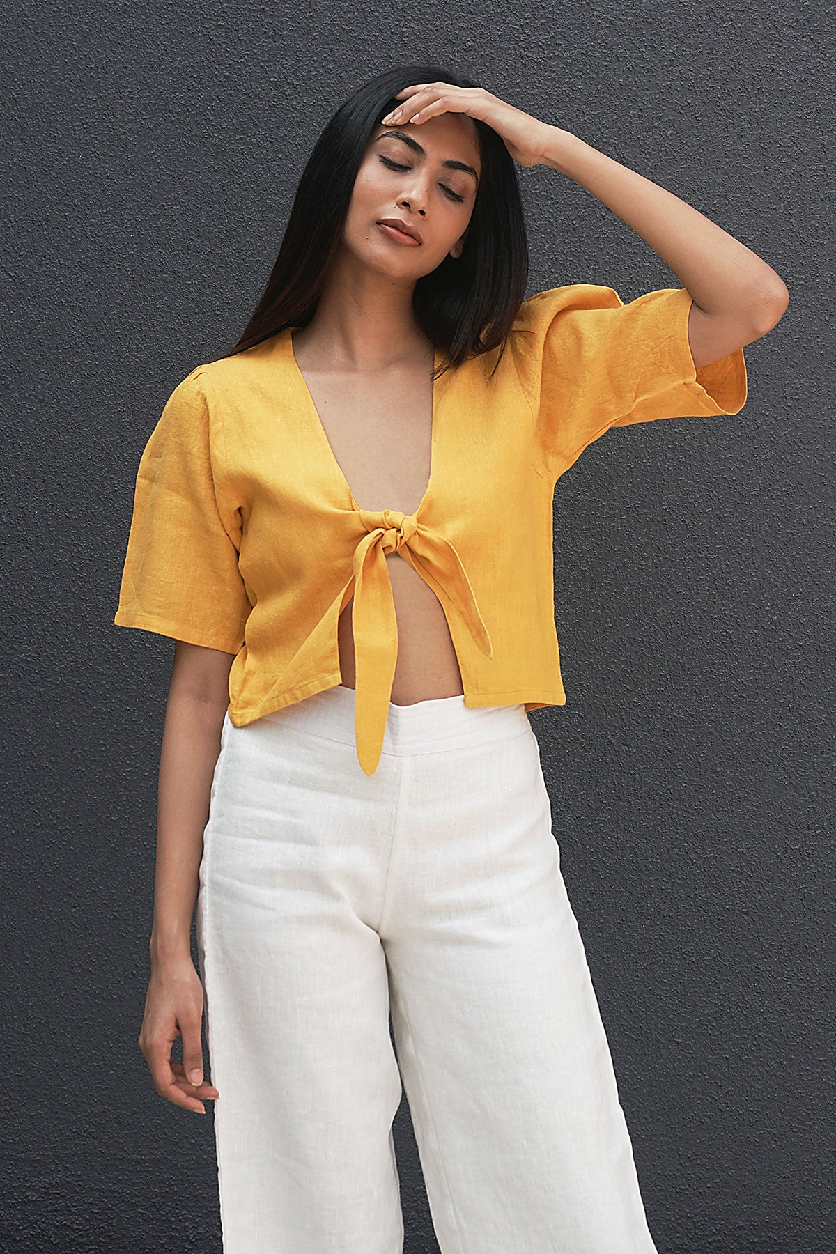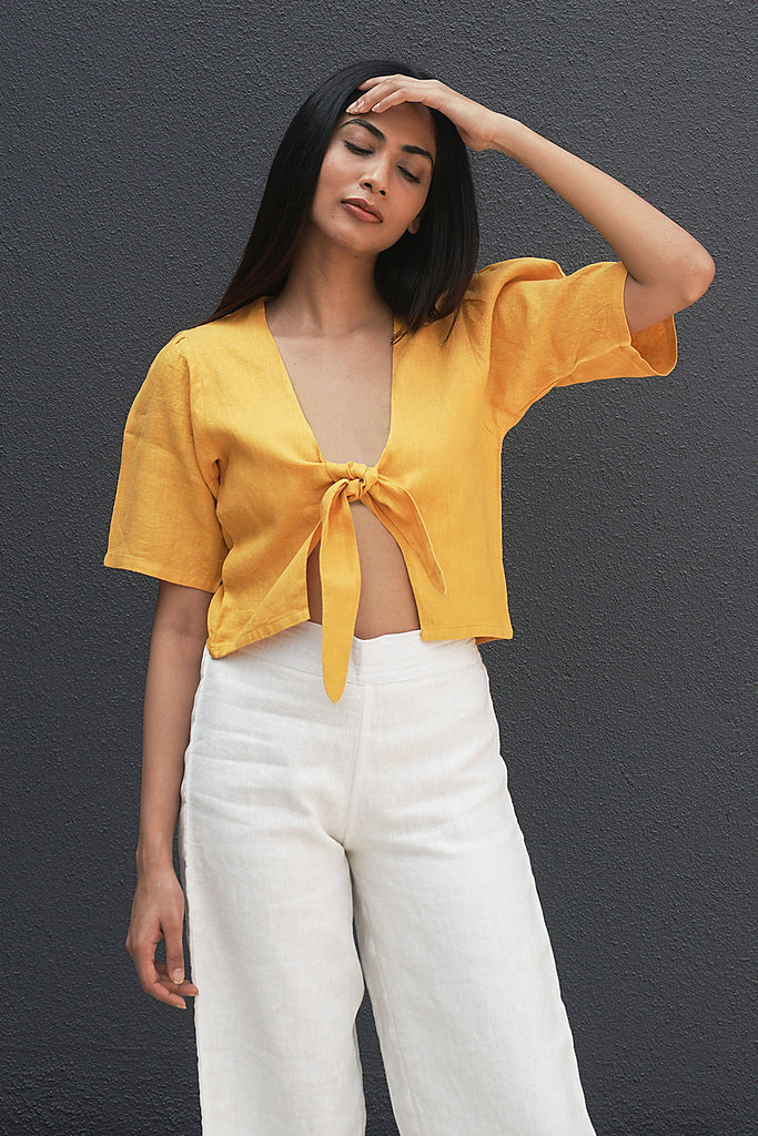 Honey Mustard Yellow Organic Linen Front Tie Brassica Top