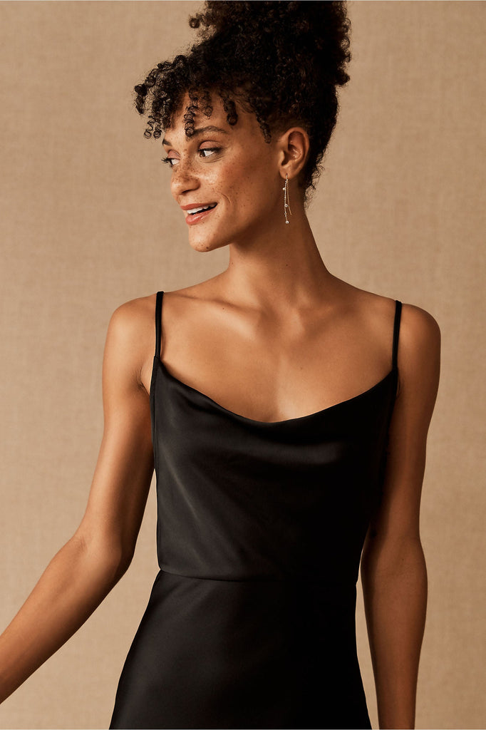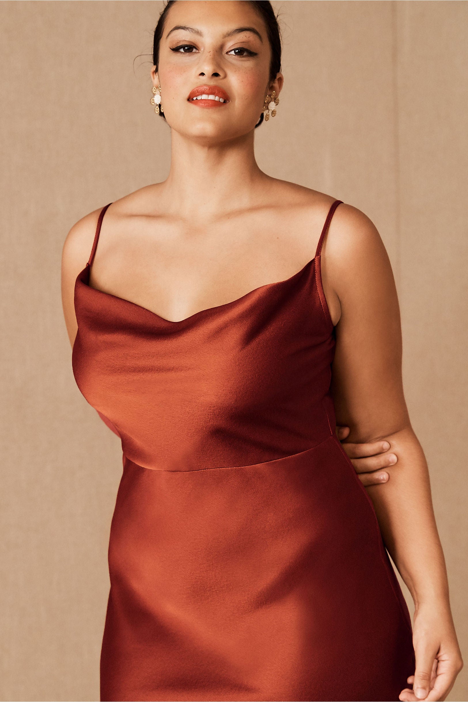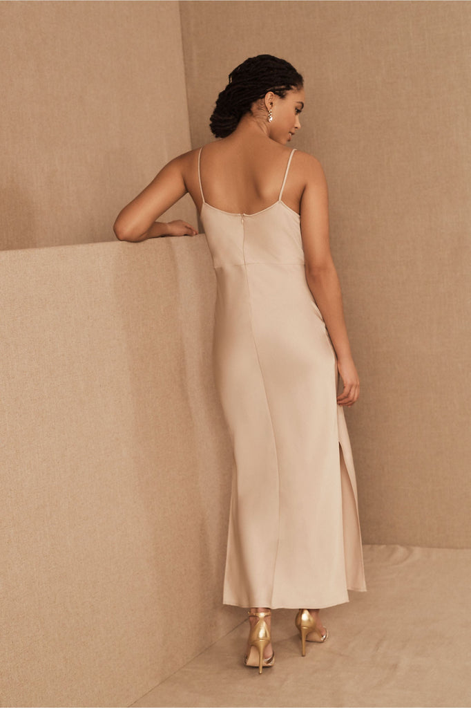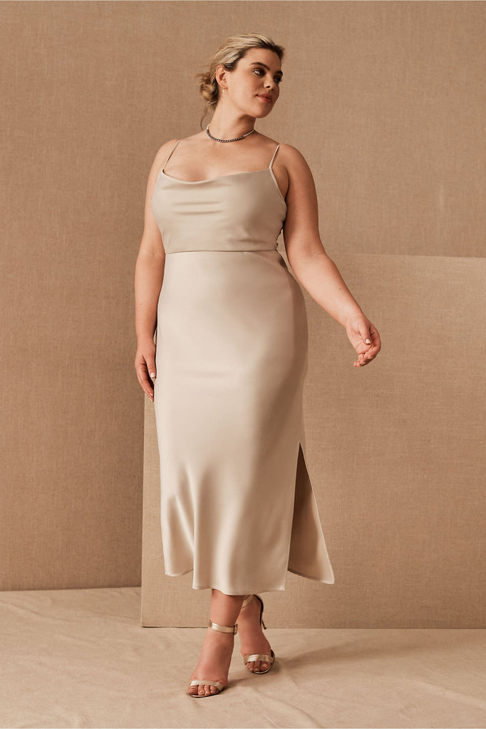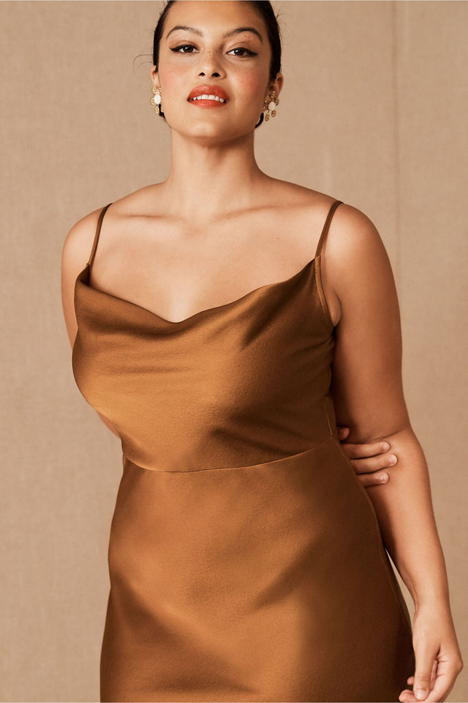An elegantly draped cowl neckline completes this silky slip dress with a modern midi silhouette. Back zip