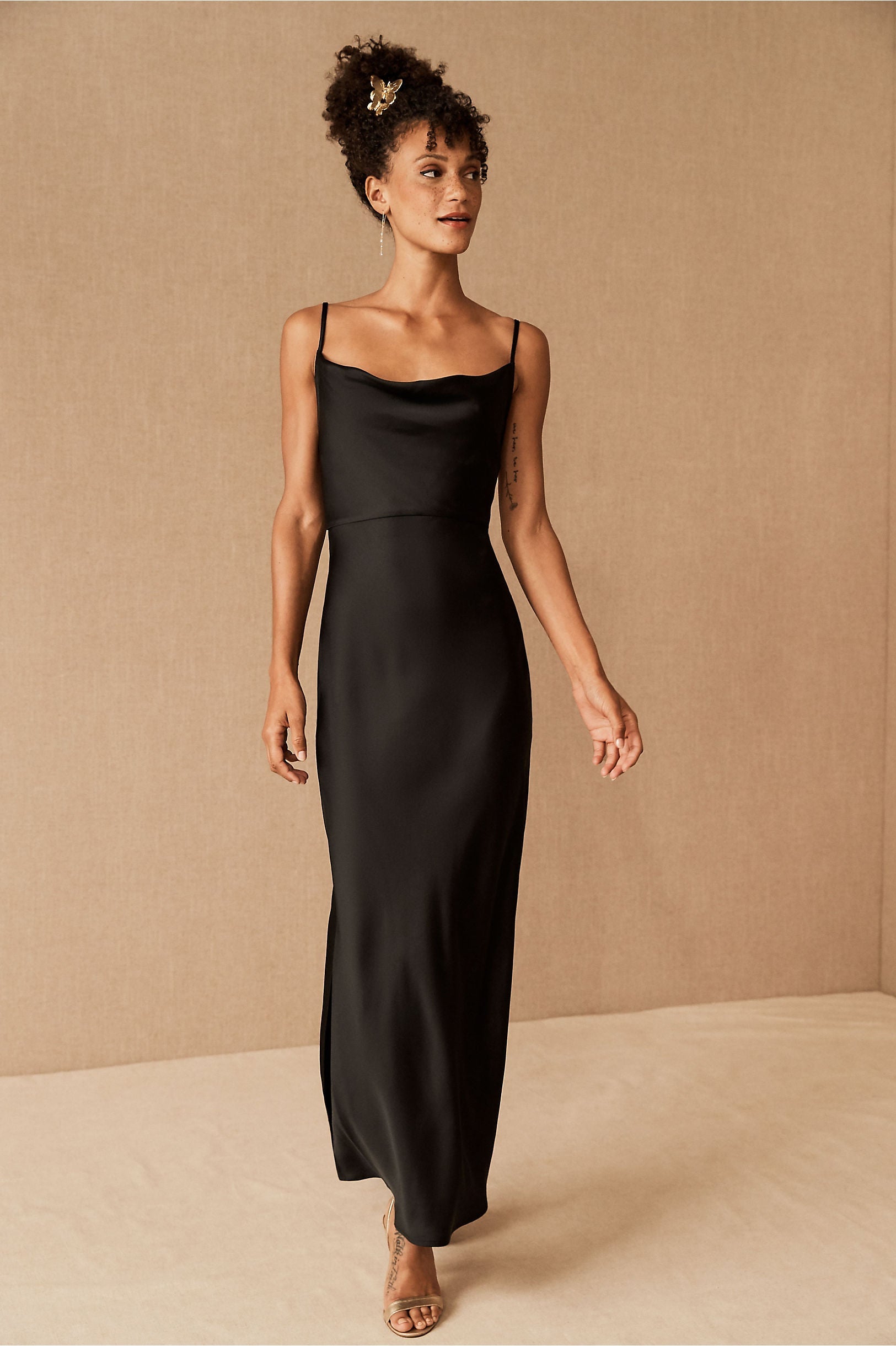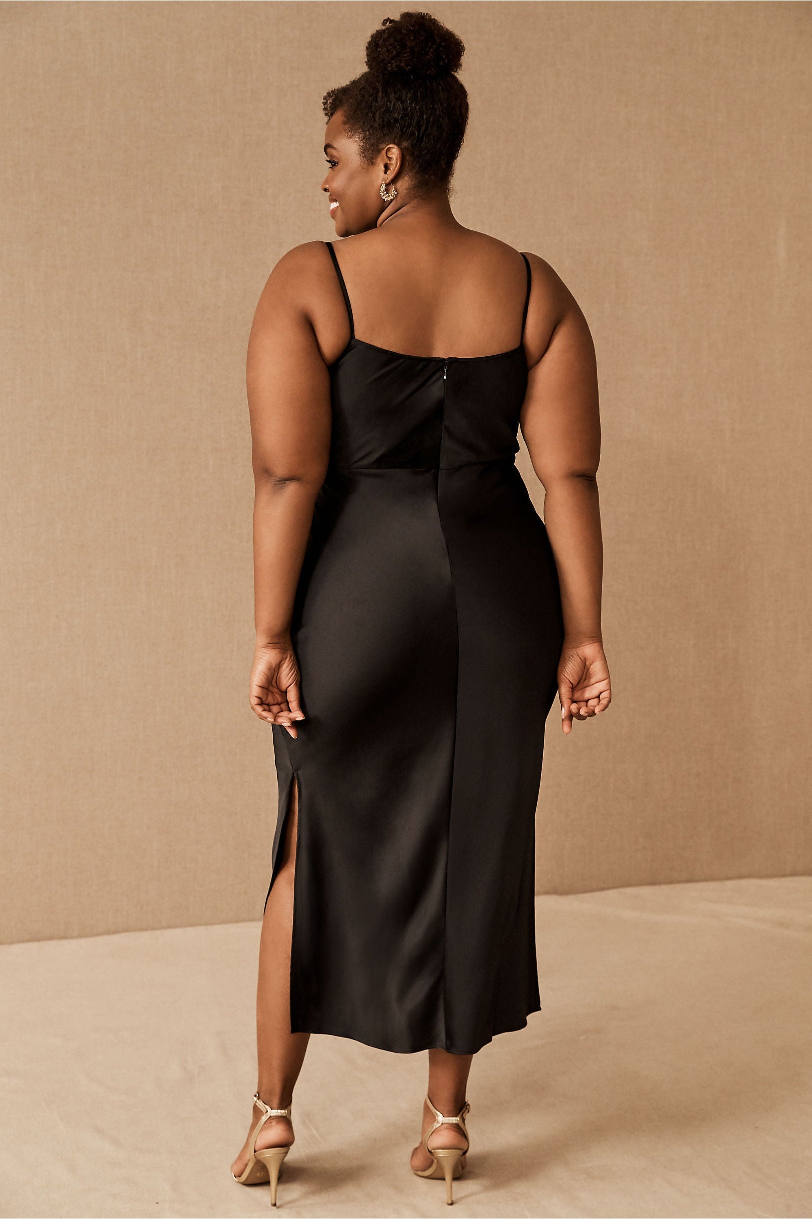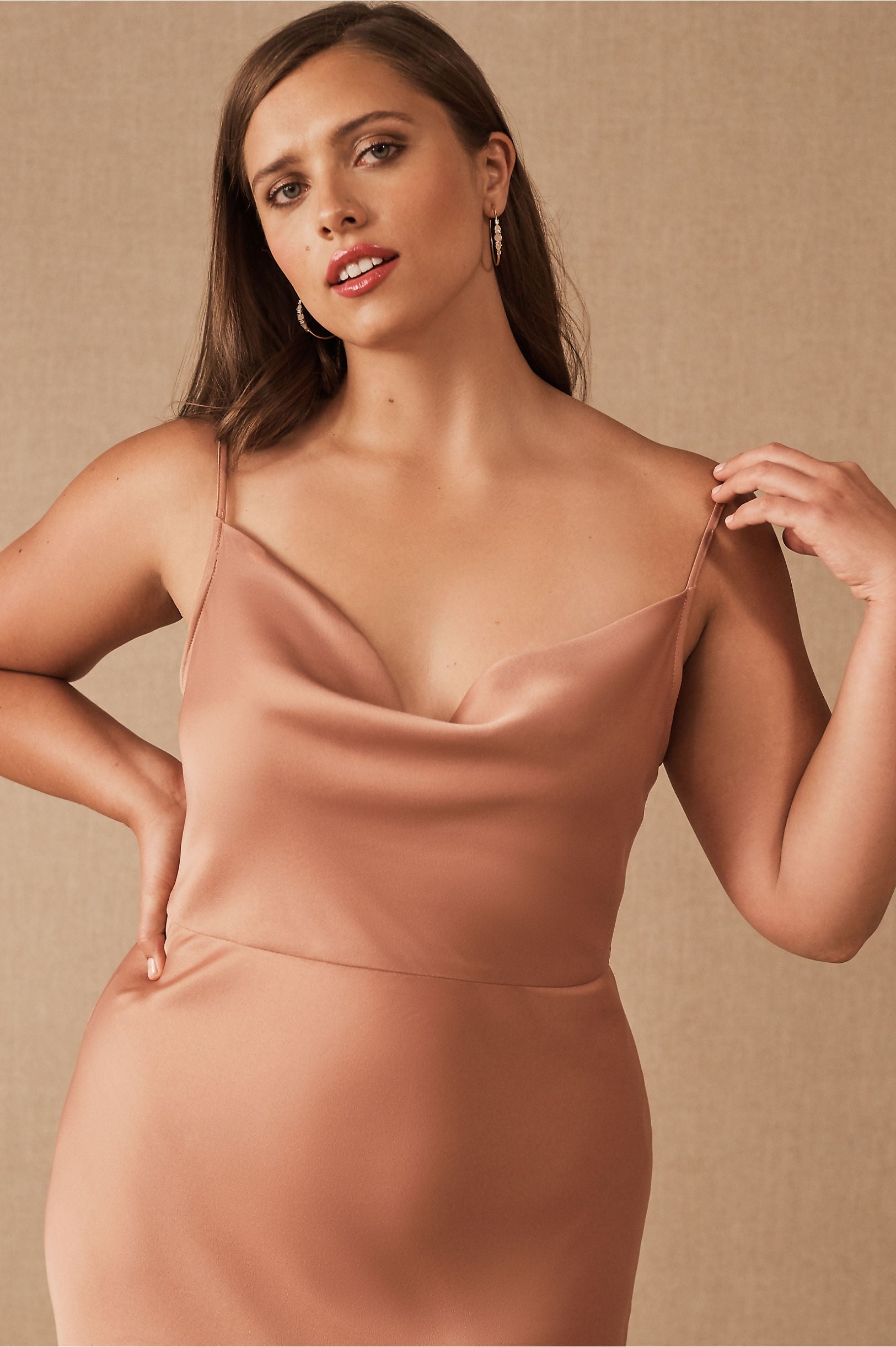 An elegantly draped cowl neckline completes this silky slip dress with a modern midi silhouette. Back zip