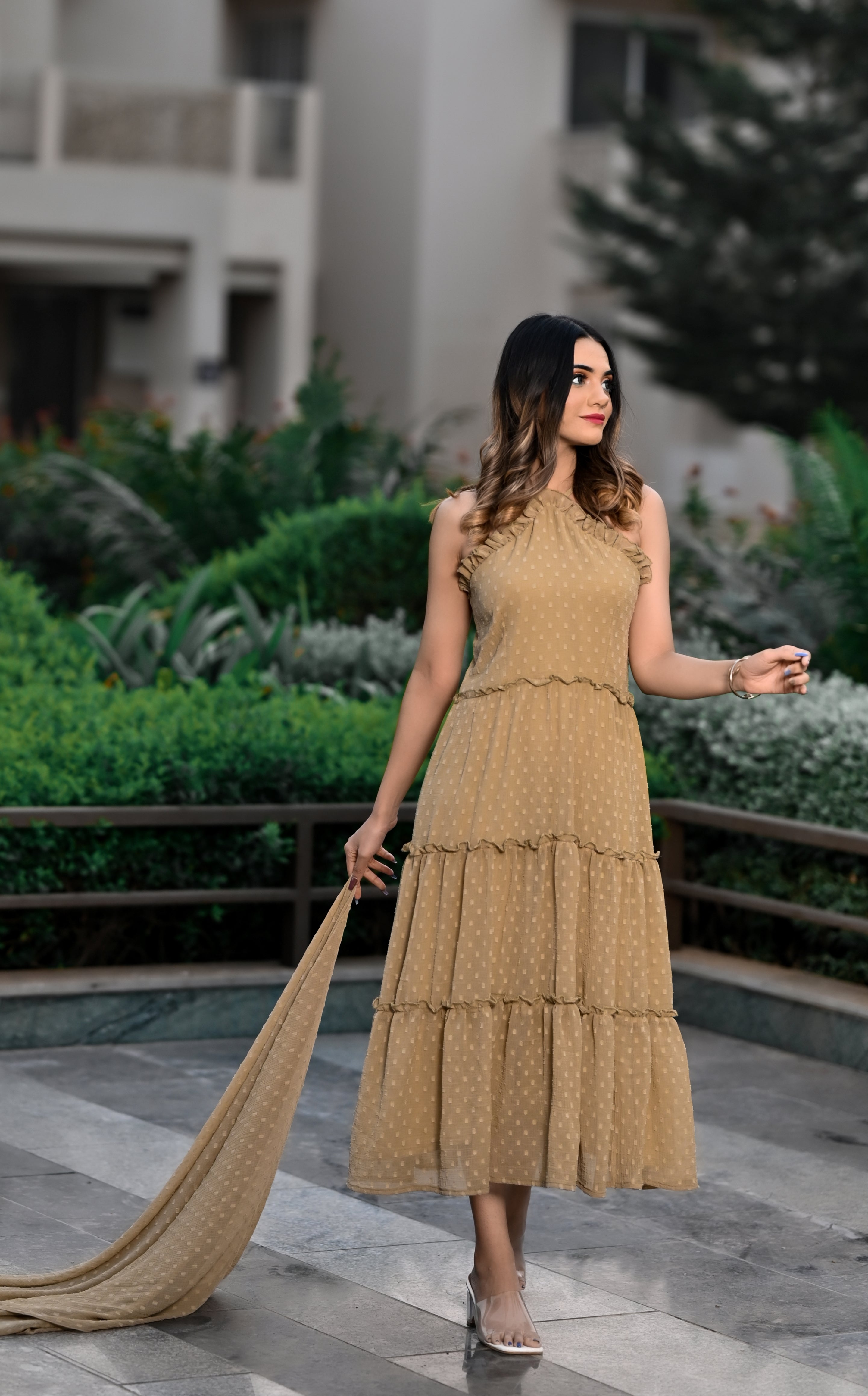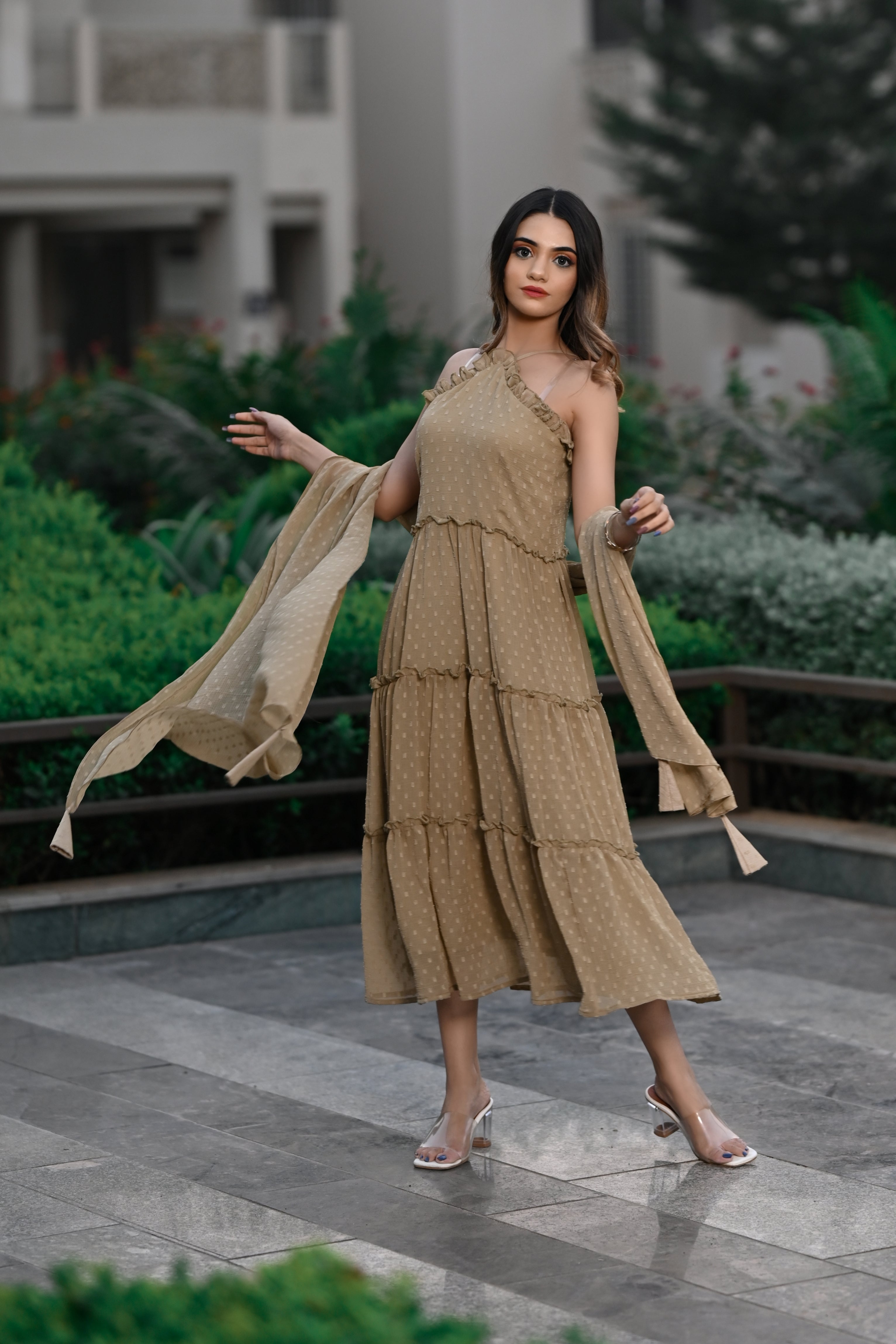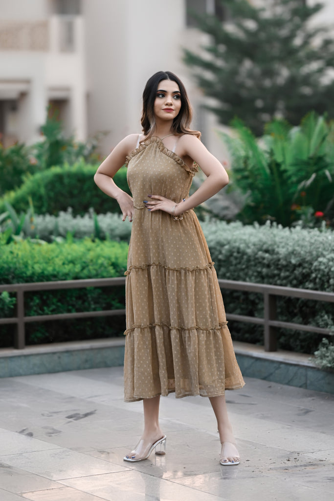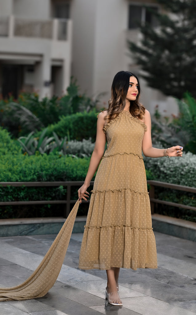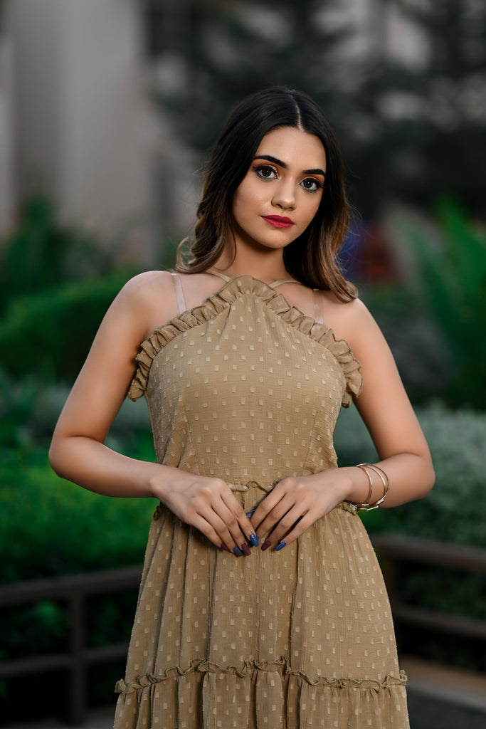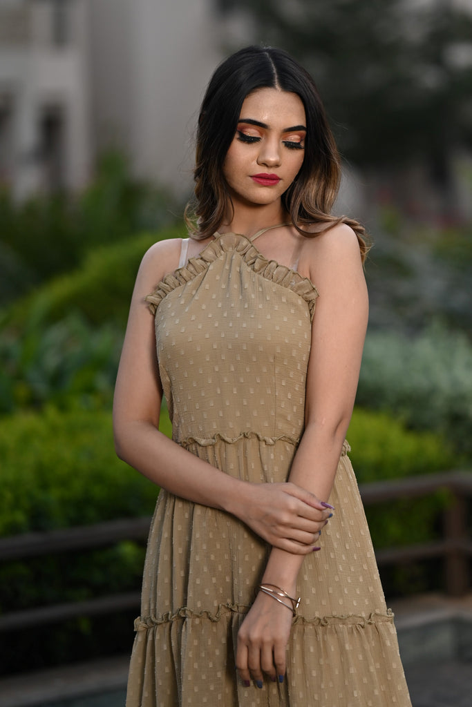 Steal hearts in this stunning, sleeveless,halter neck tier dress. This dress is perfect for parties and date nights. This is comfortable, breathable,and made up of very soft and sheer chiffon butta fabric with slight wrinkling. Shop now online from MANNMANI.