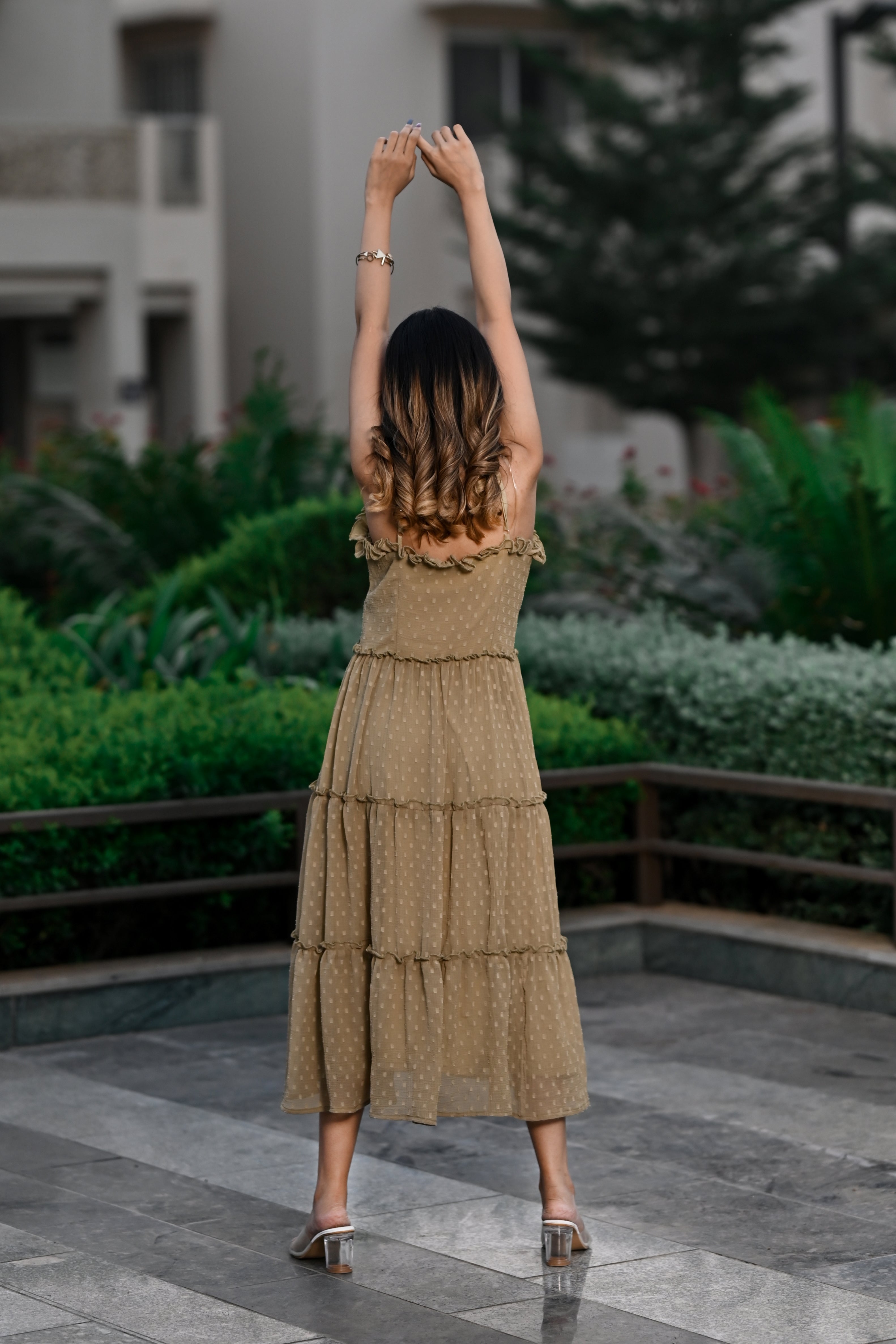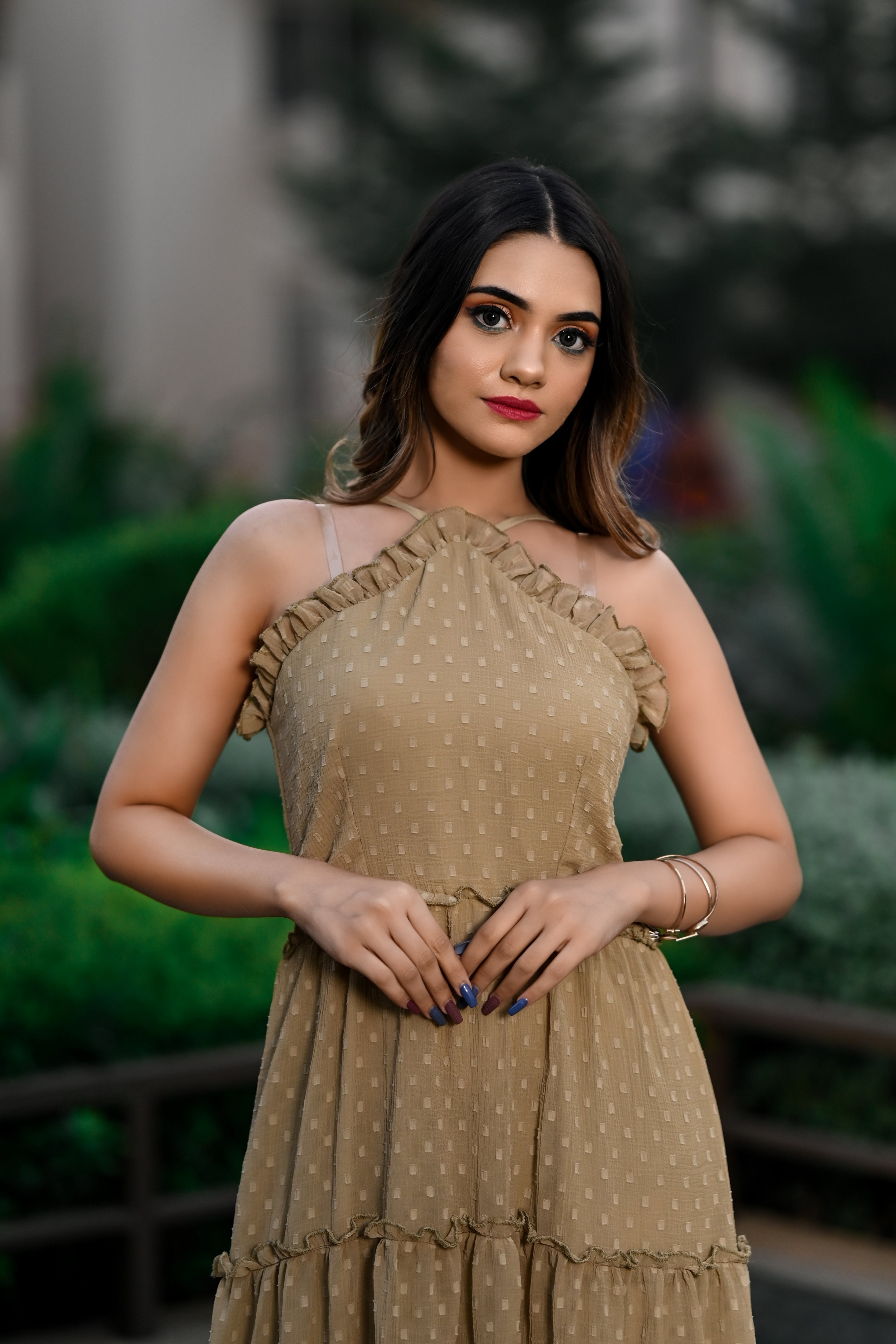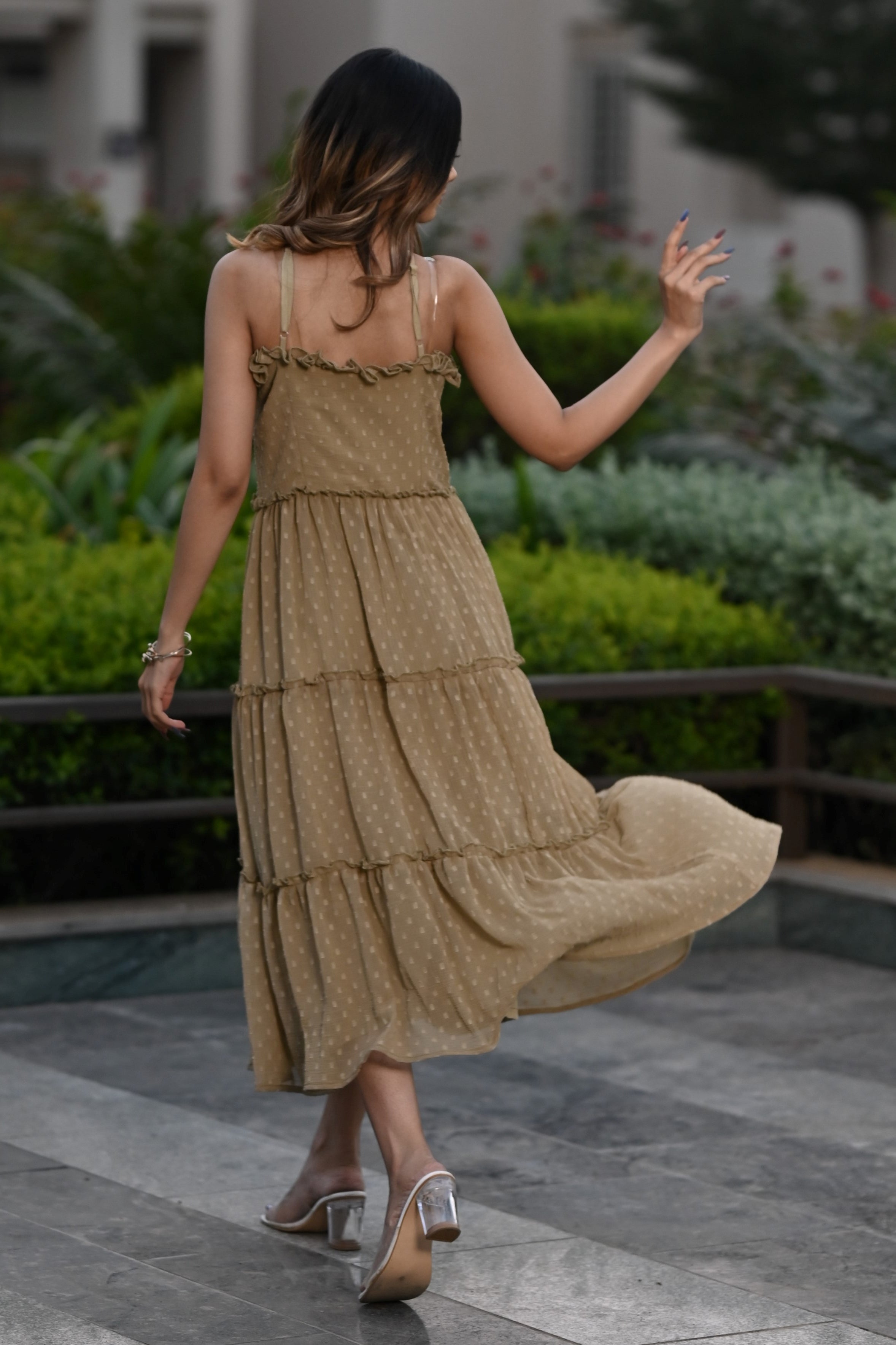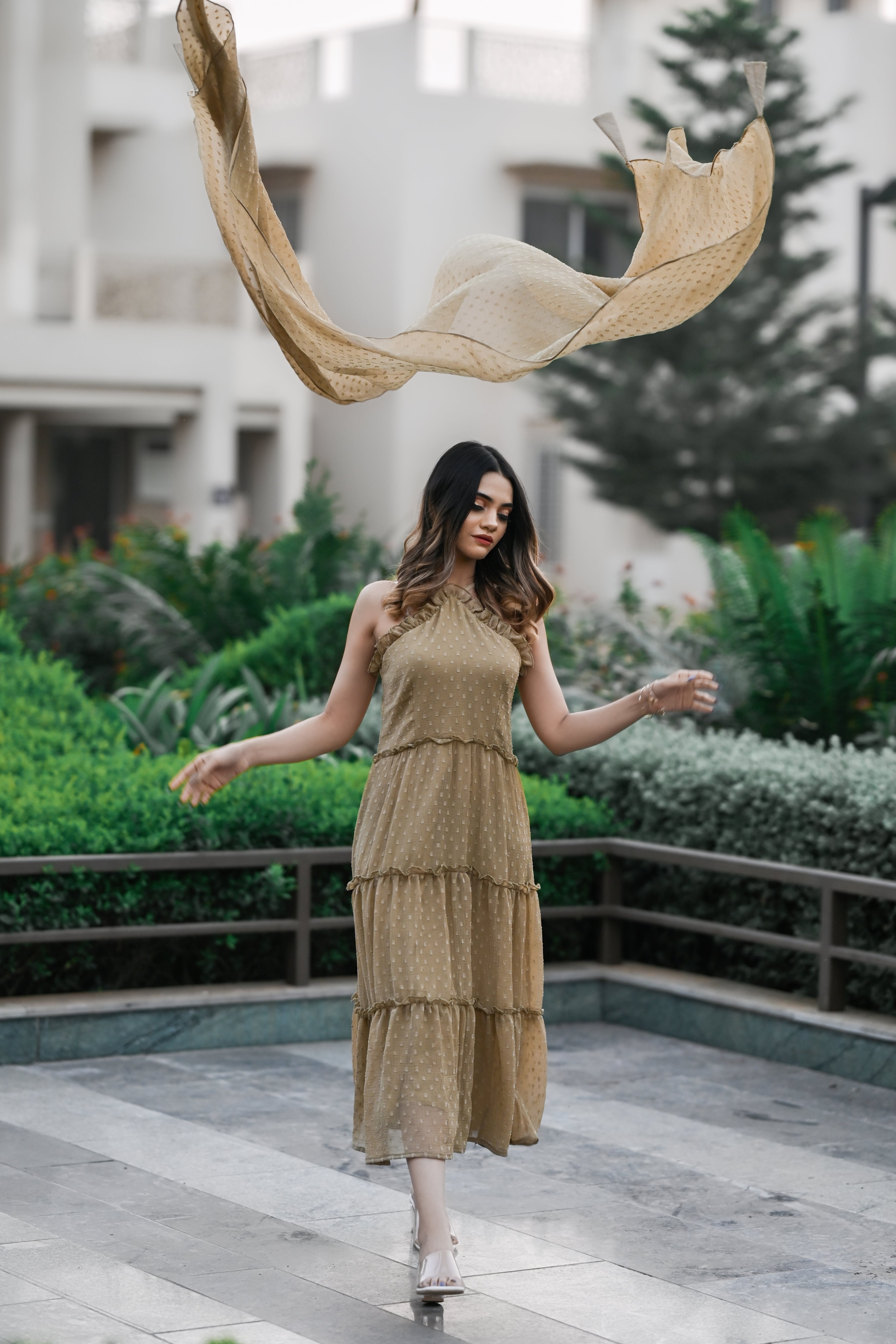 Steal hearts in this stunning, sleeveless,halter neck tier dress. This dress is perfect for parties and date nights. This is comfortable, breathable,and made up of very soft and sheer chiffon butta fabric with slight wrinkling. Shop now online from MANNMANI.