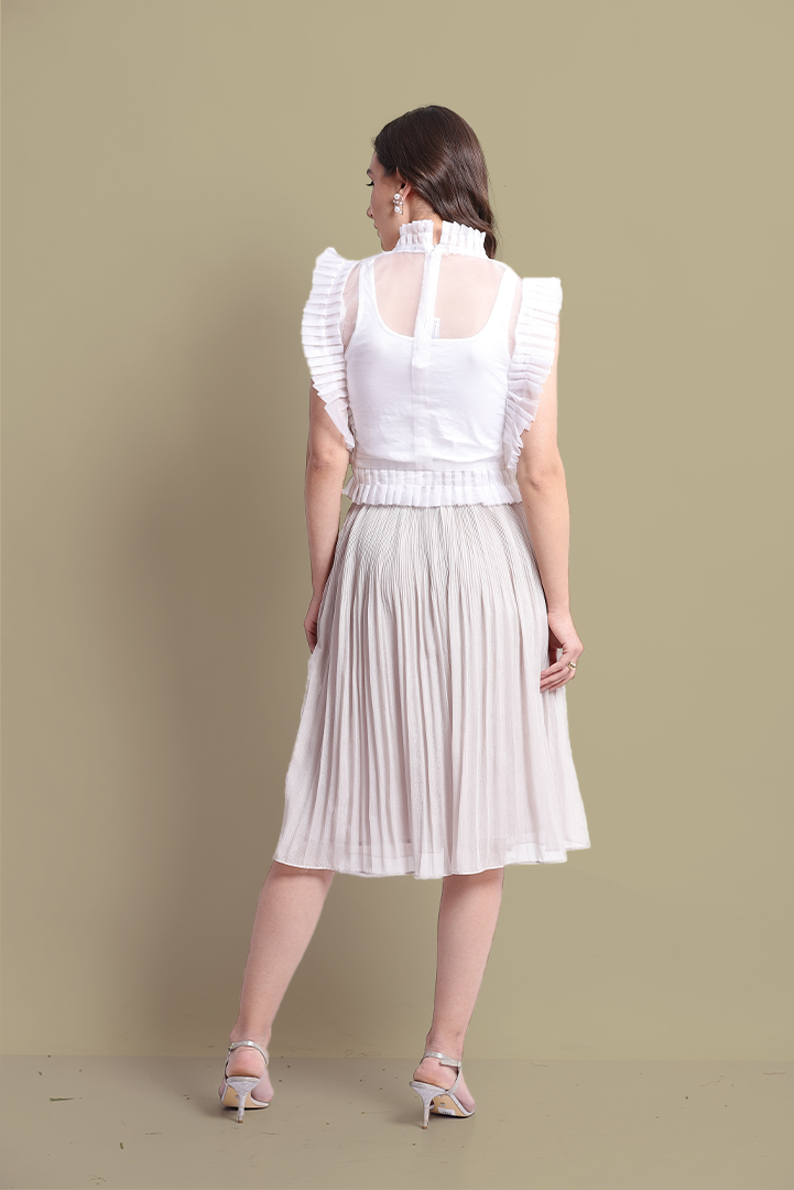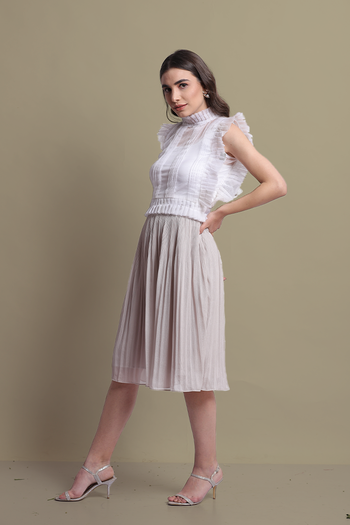 Versatile see through organza top with pin tucks in front. Pleated edges adding volume to the top. Zip fastening at the back for comfort fit. Can be styled in multiple ways.