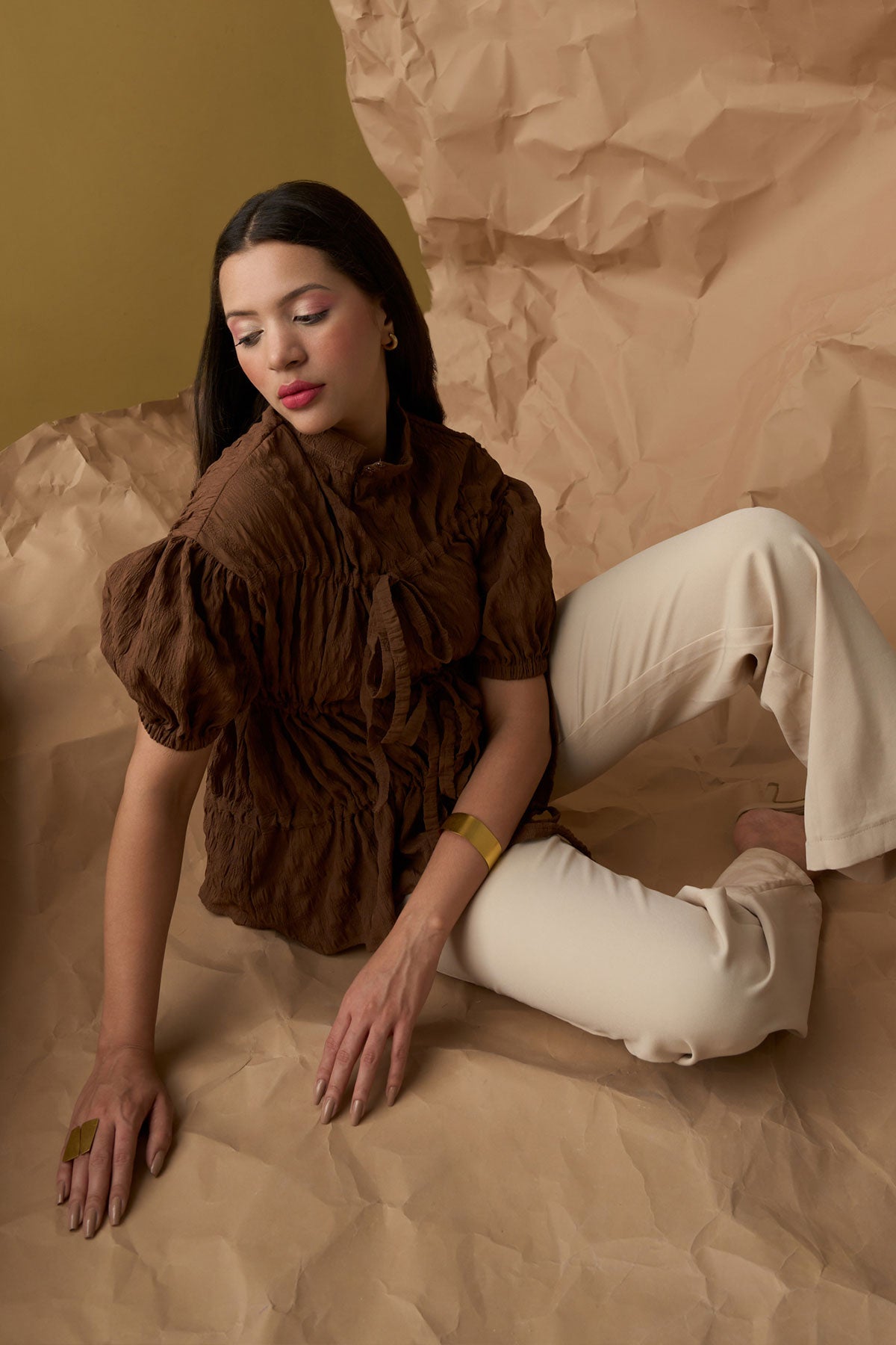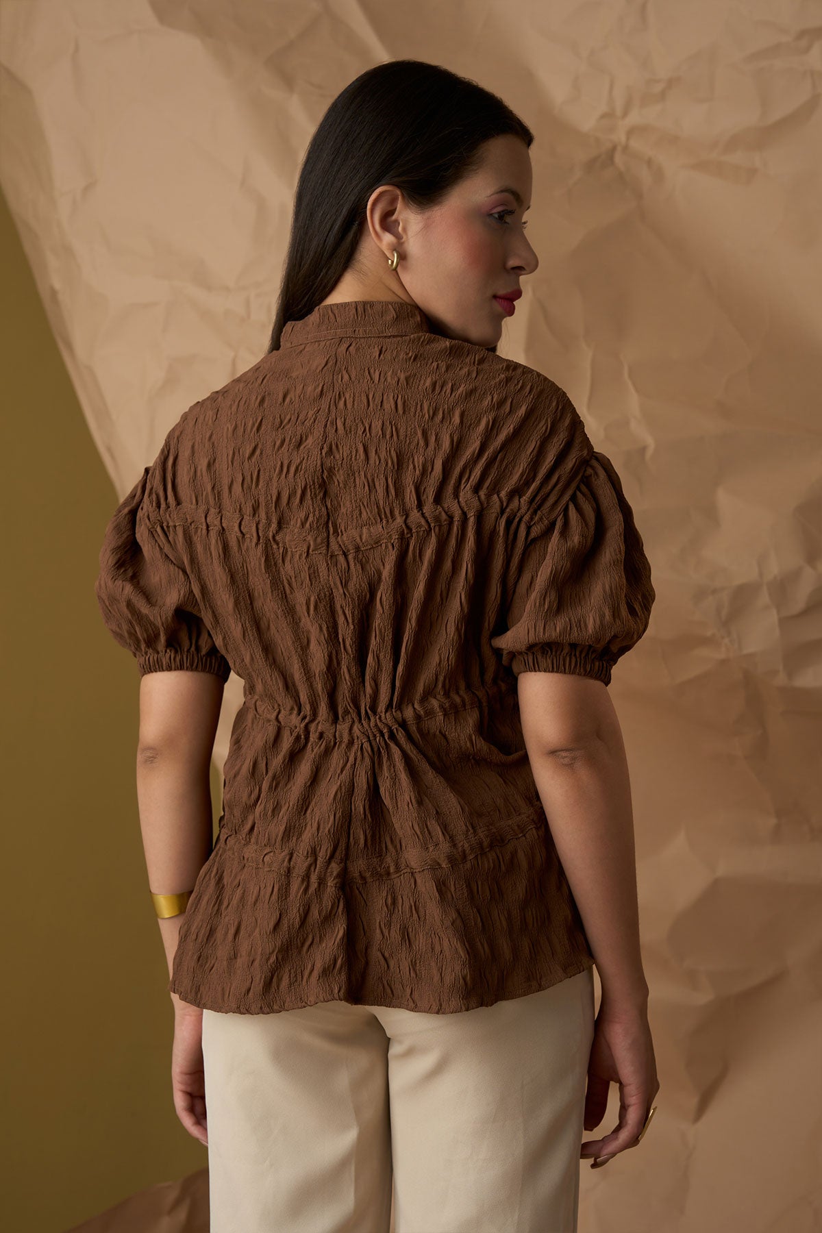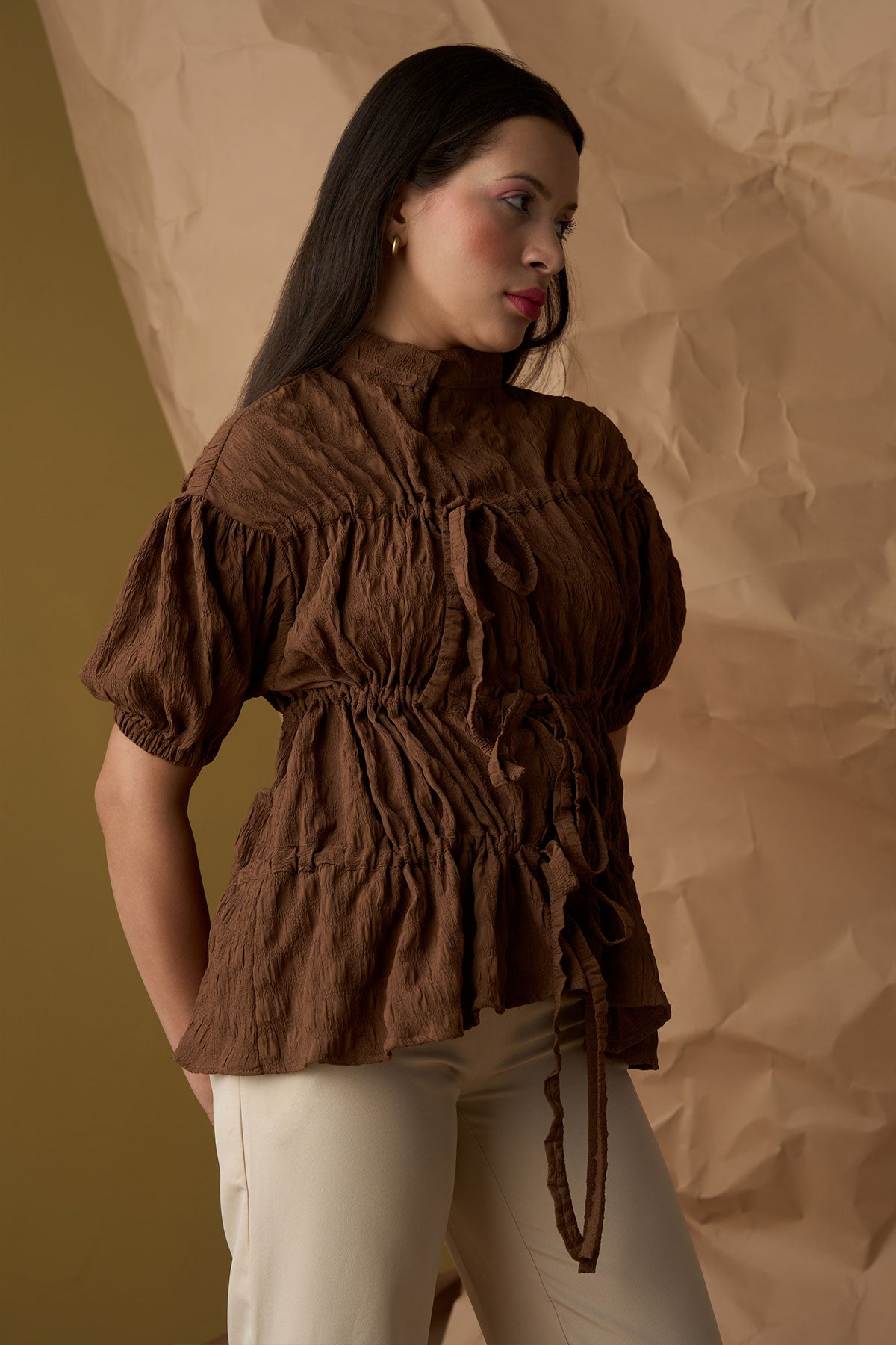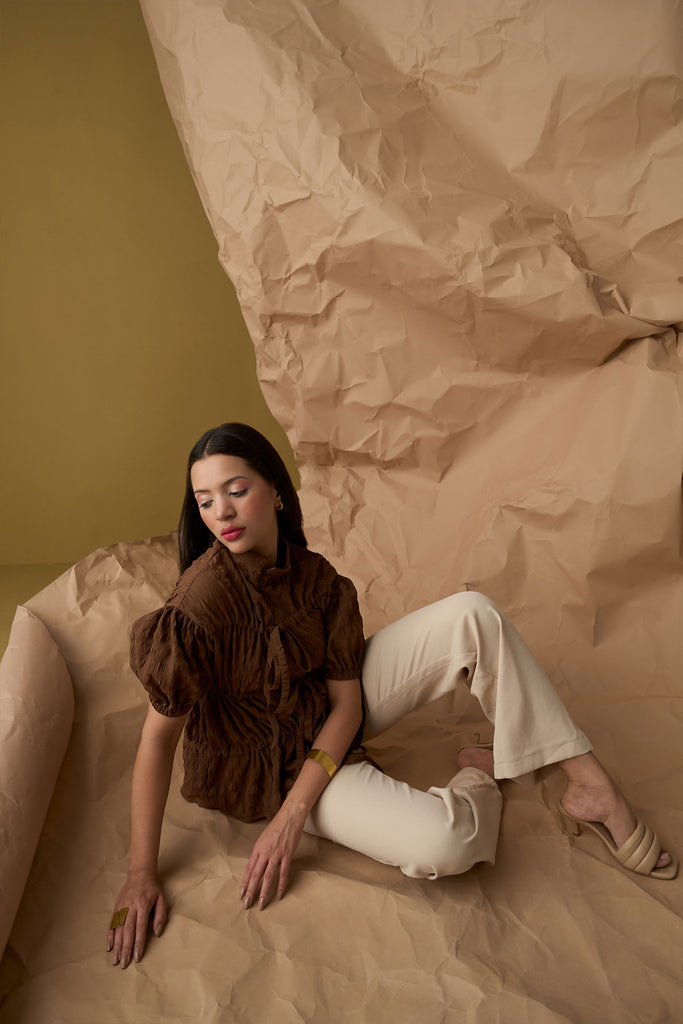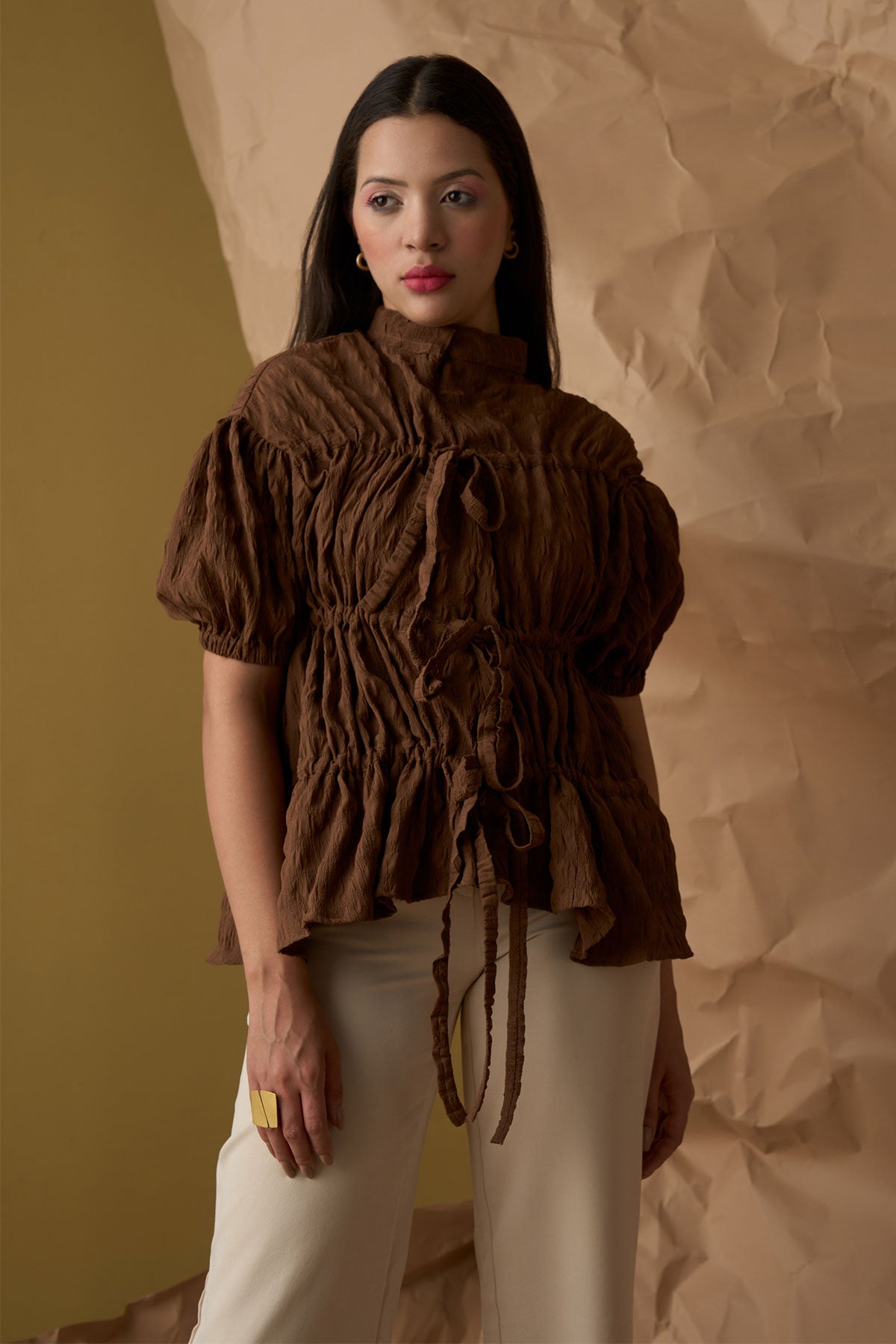 Top with front zip opening creating a beautiful fit in layers. The tie-ups help to adjust the gathers making it perfect for casual day to night wear. Available in plus size also.