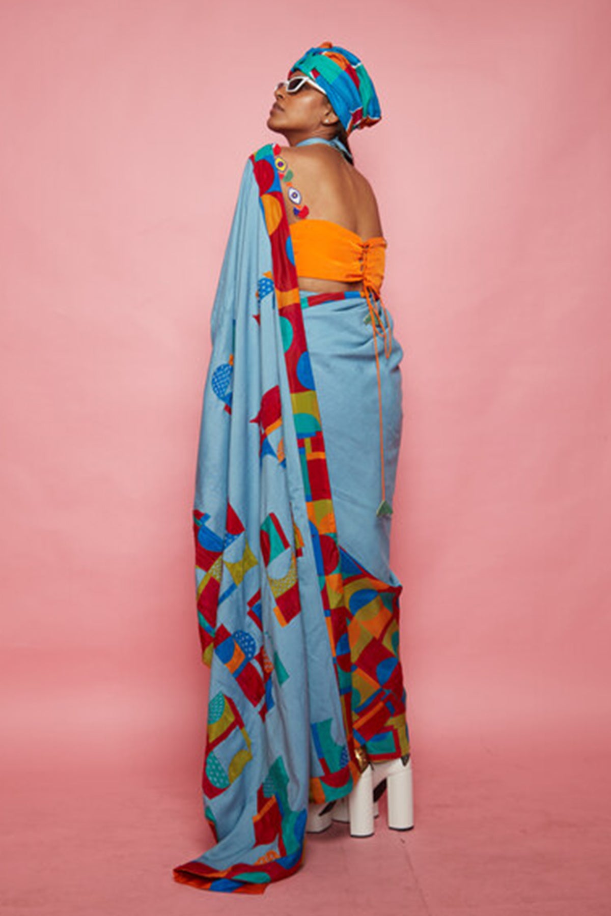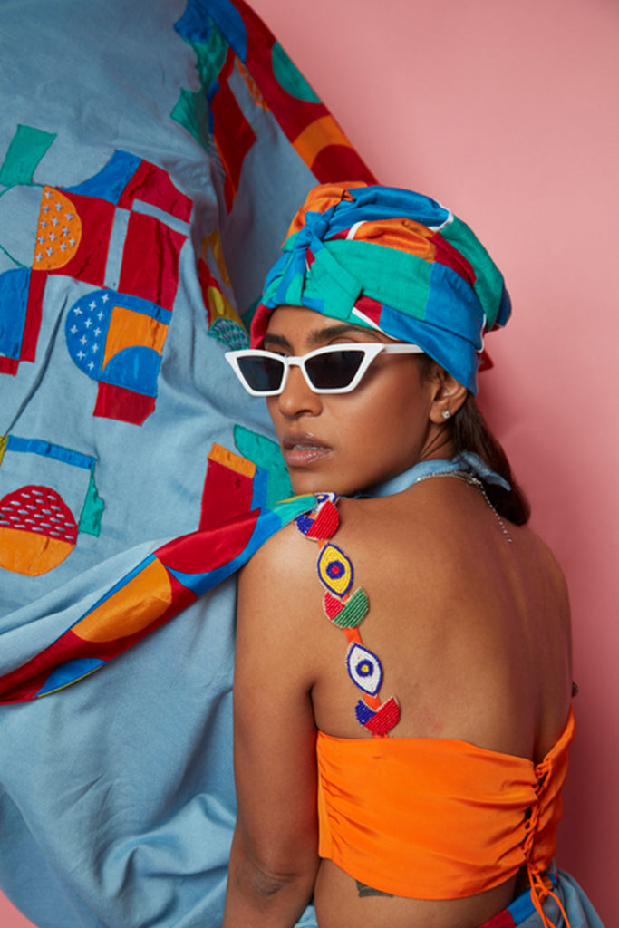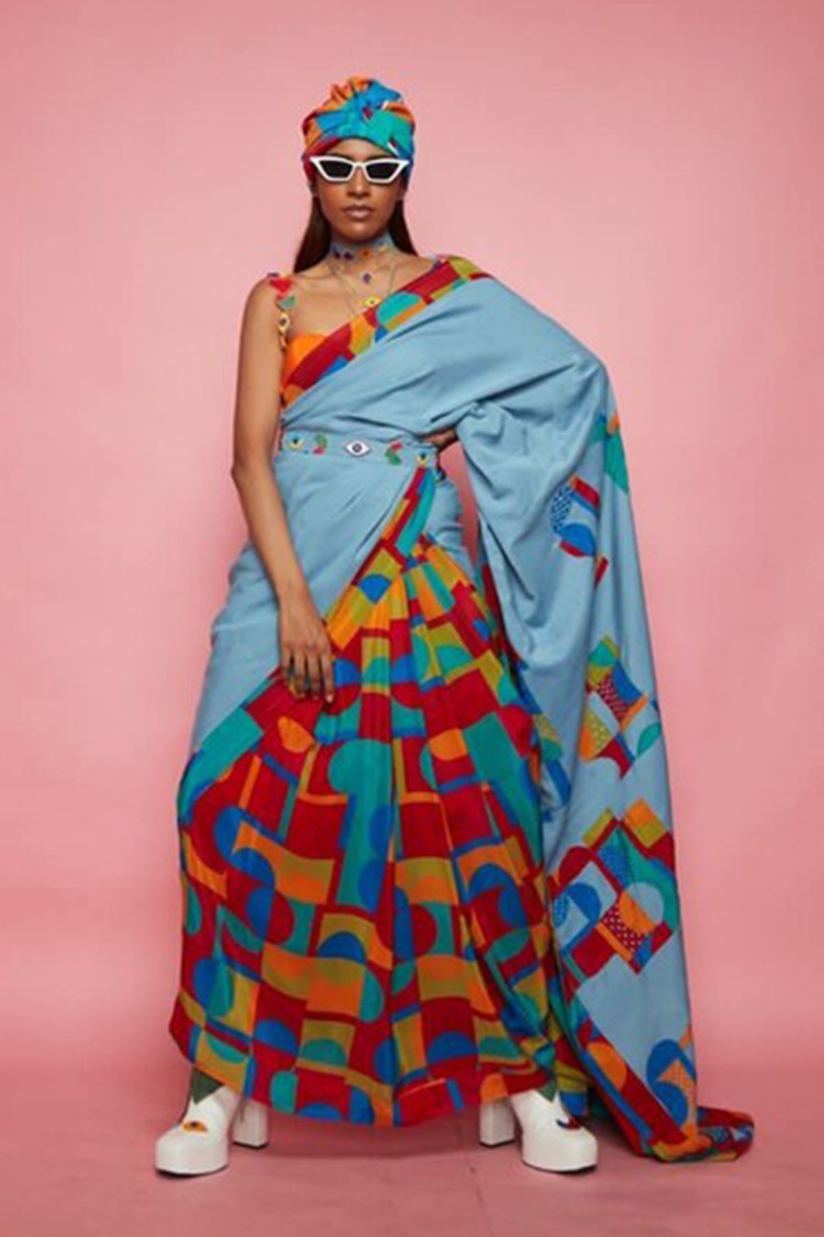 Blue Crepe Geometric Pattern Saree With Blouse