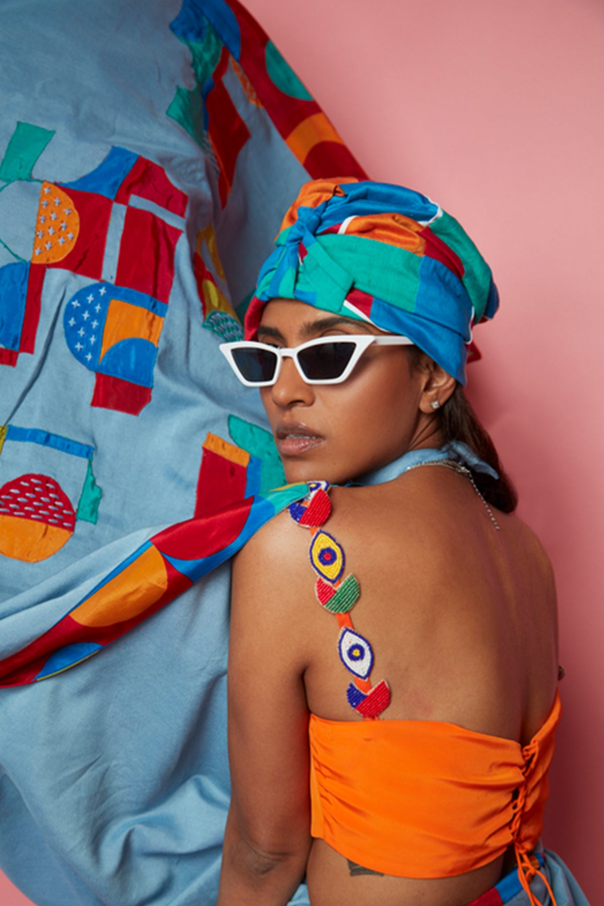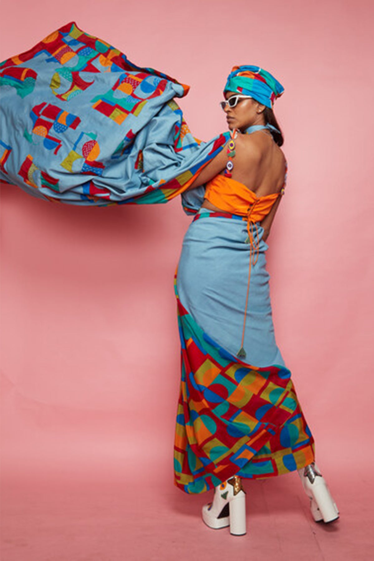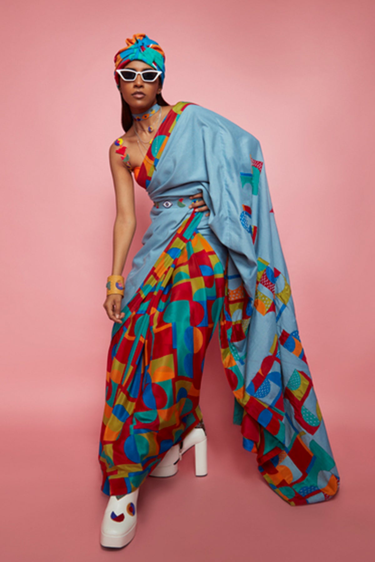 Blue Crepe Geometric Pattern Saree With Blouse