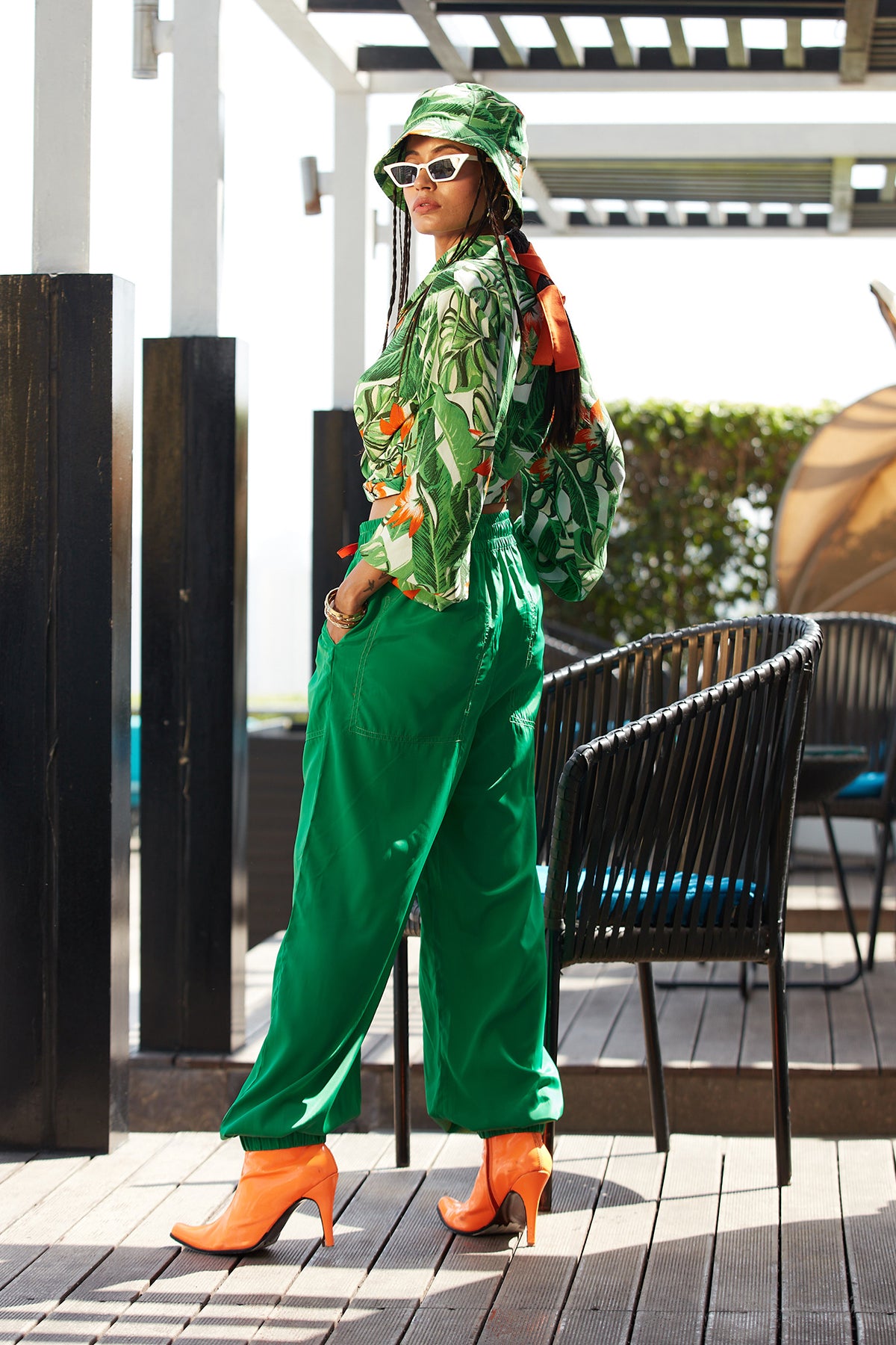 In vibrant colours, this printed knotted top is paired with contrast joggers.