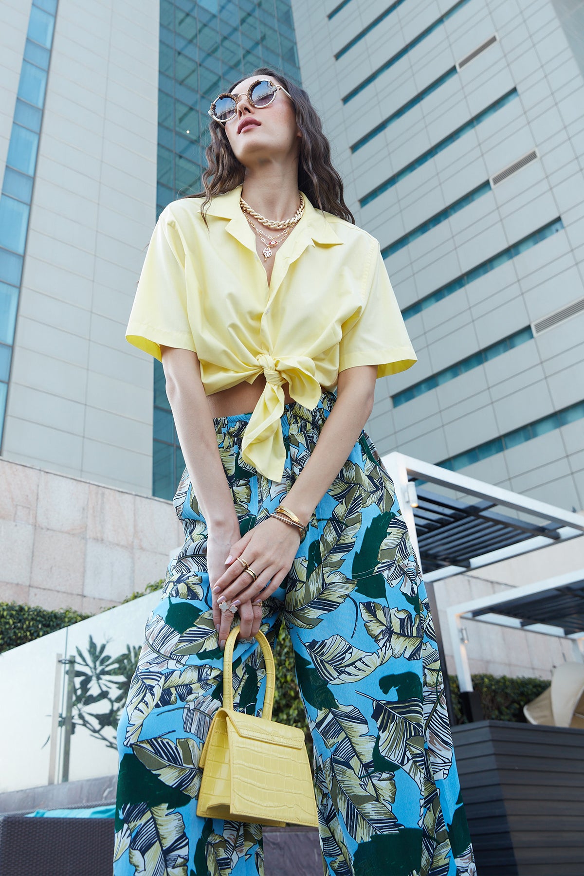 In plain yellow, this knotted top can be paired with any printed bottom.
