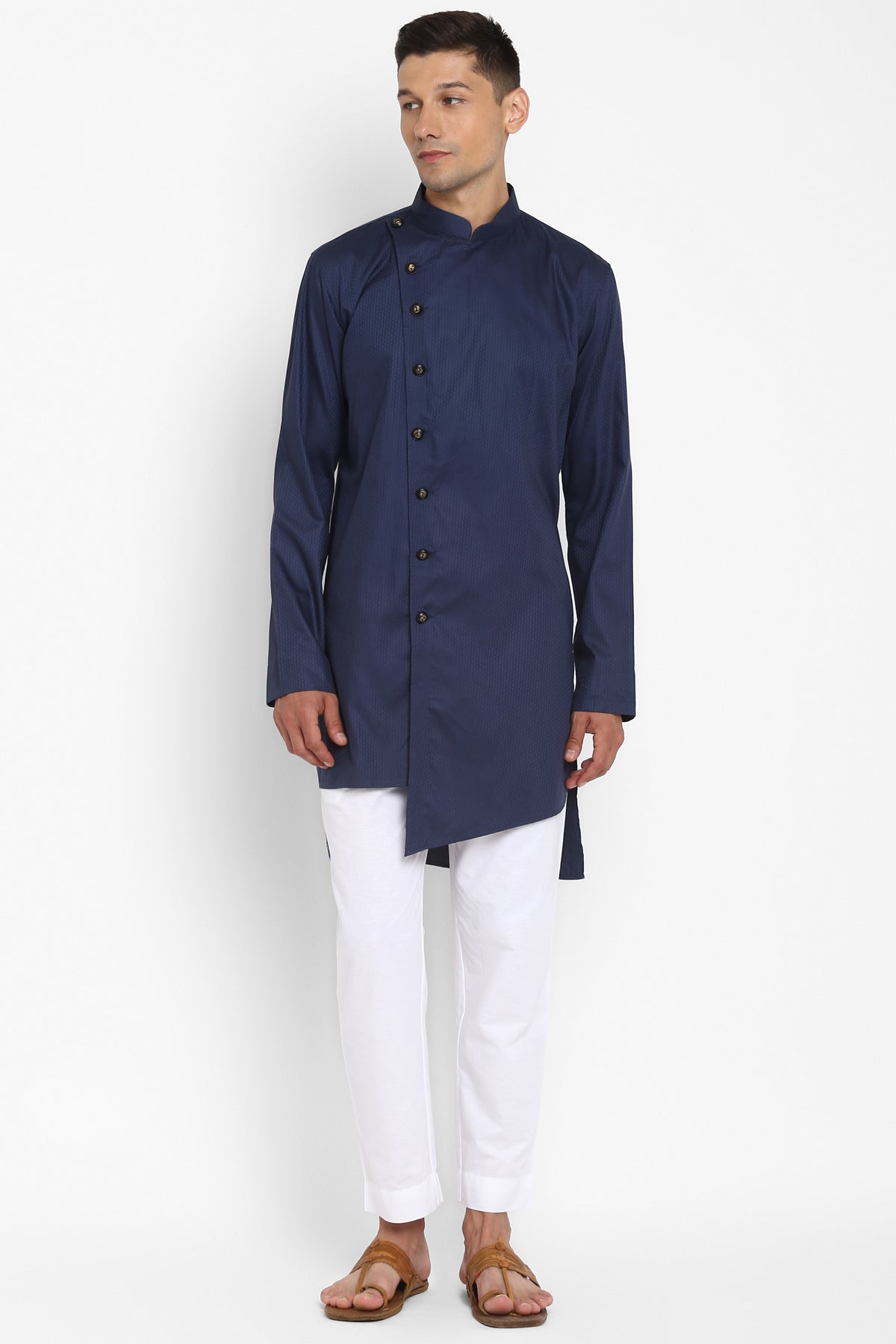 Stylish long sleeve kurta set made in cotton linen. With a contemporary side-button look, this versatile set is perfect for the festive season, crafted for sheer comfort and class. The bottoms are made of 100% cotton.
