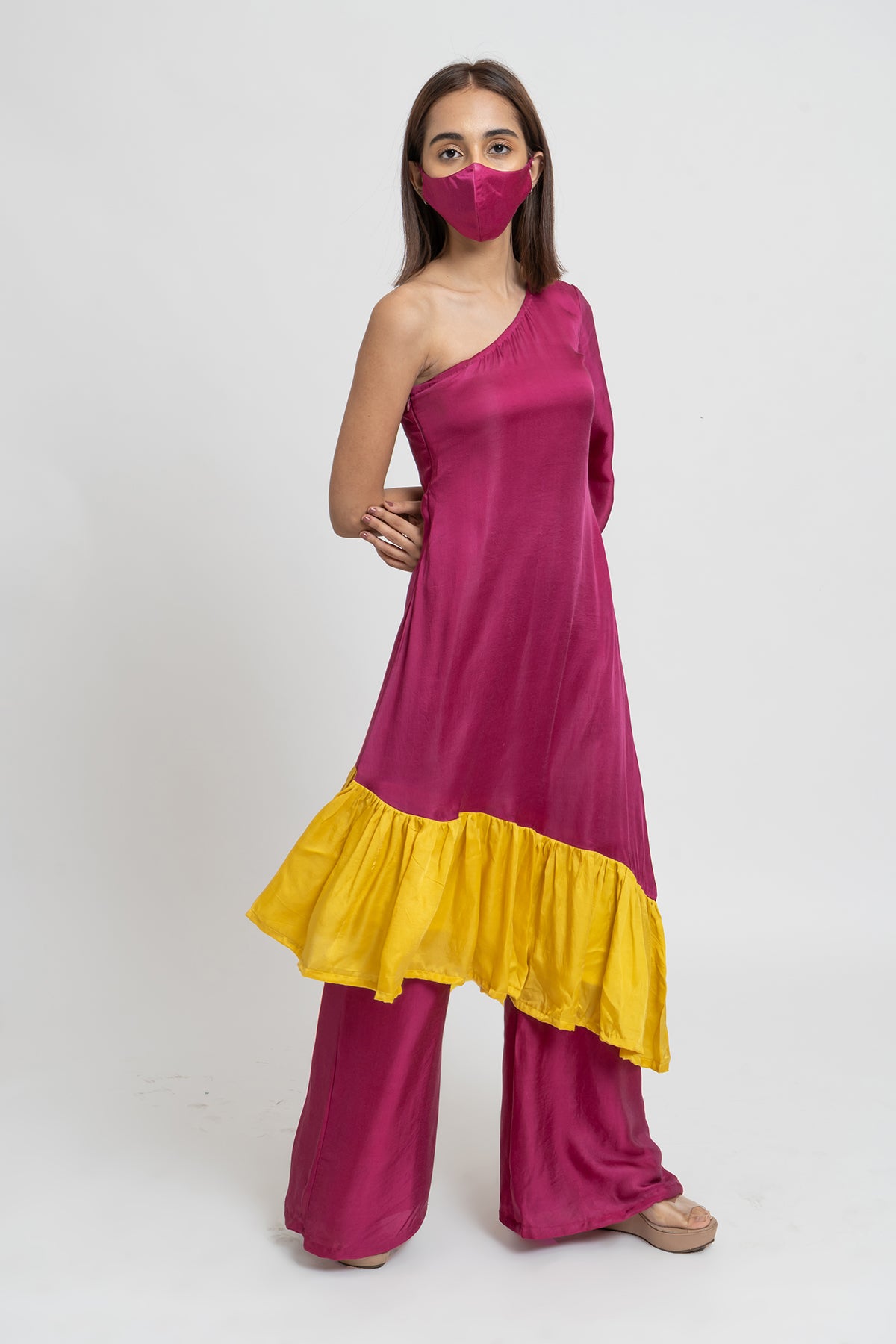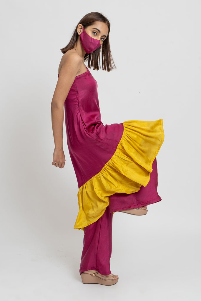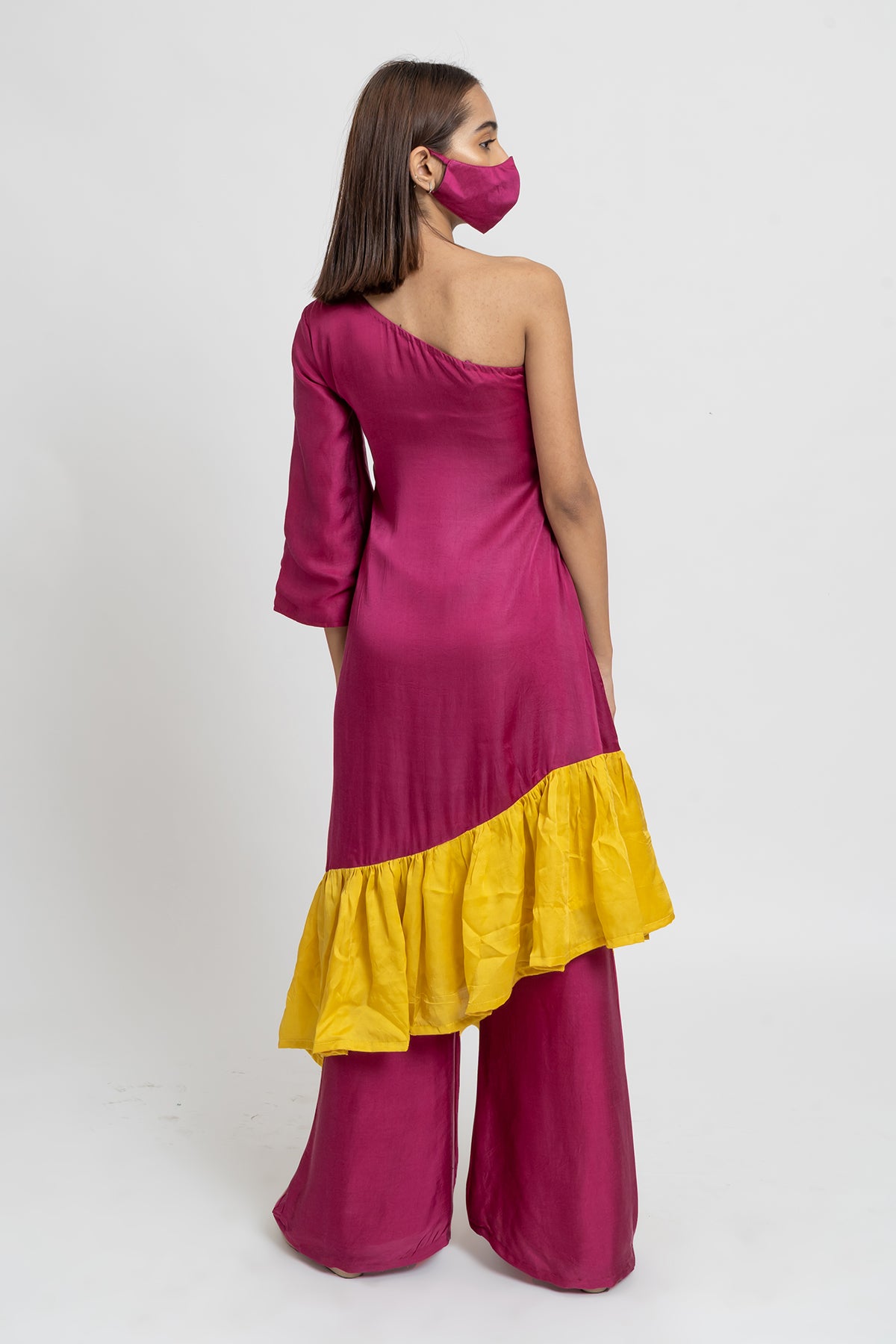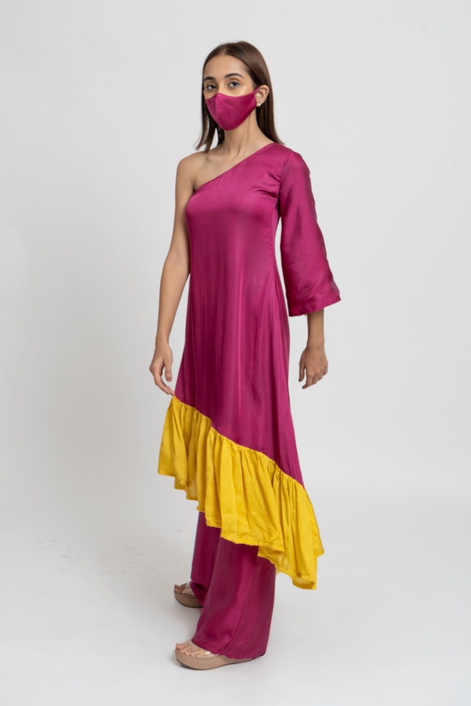 Wine and Yellow Colorblocked One Shouldered Asymmetrical Tunic with Wide Legged Wine Pants.