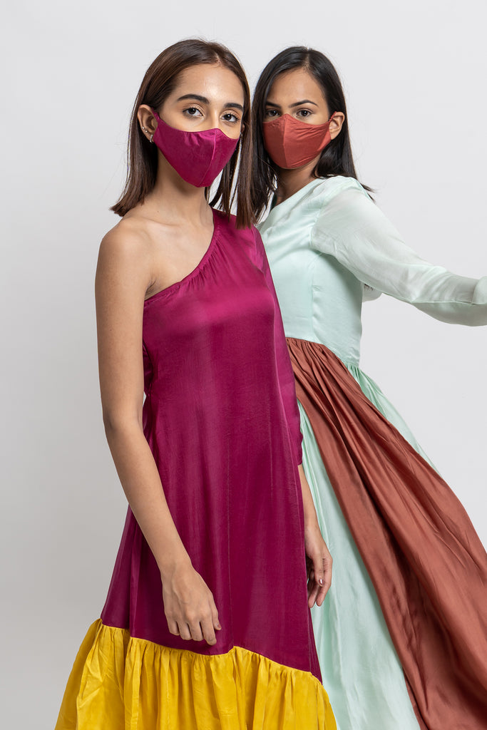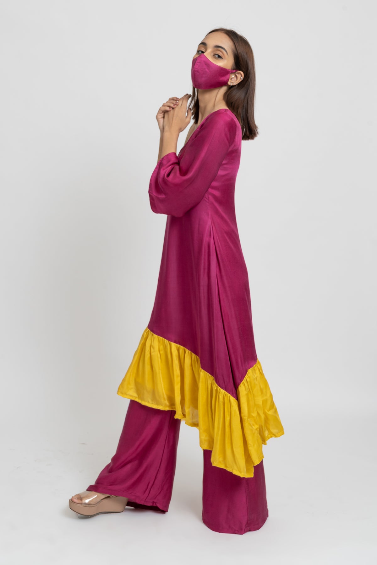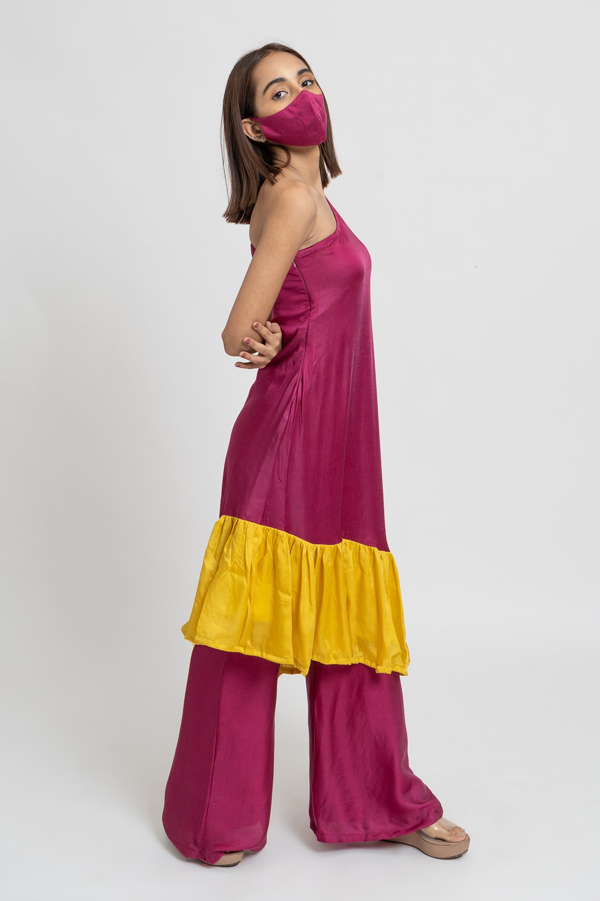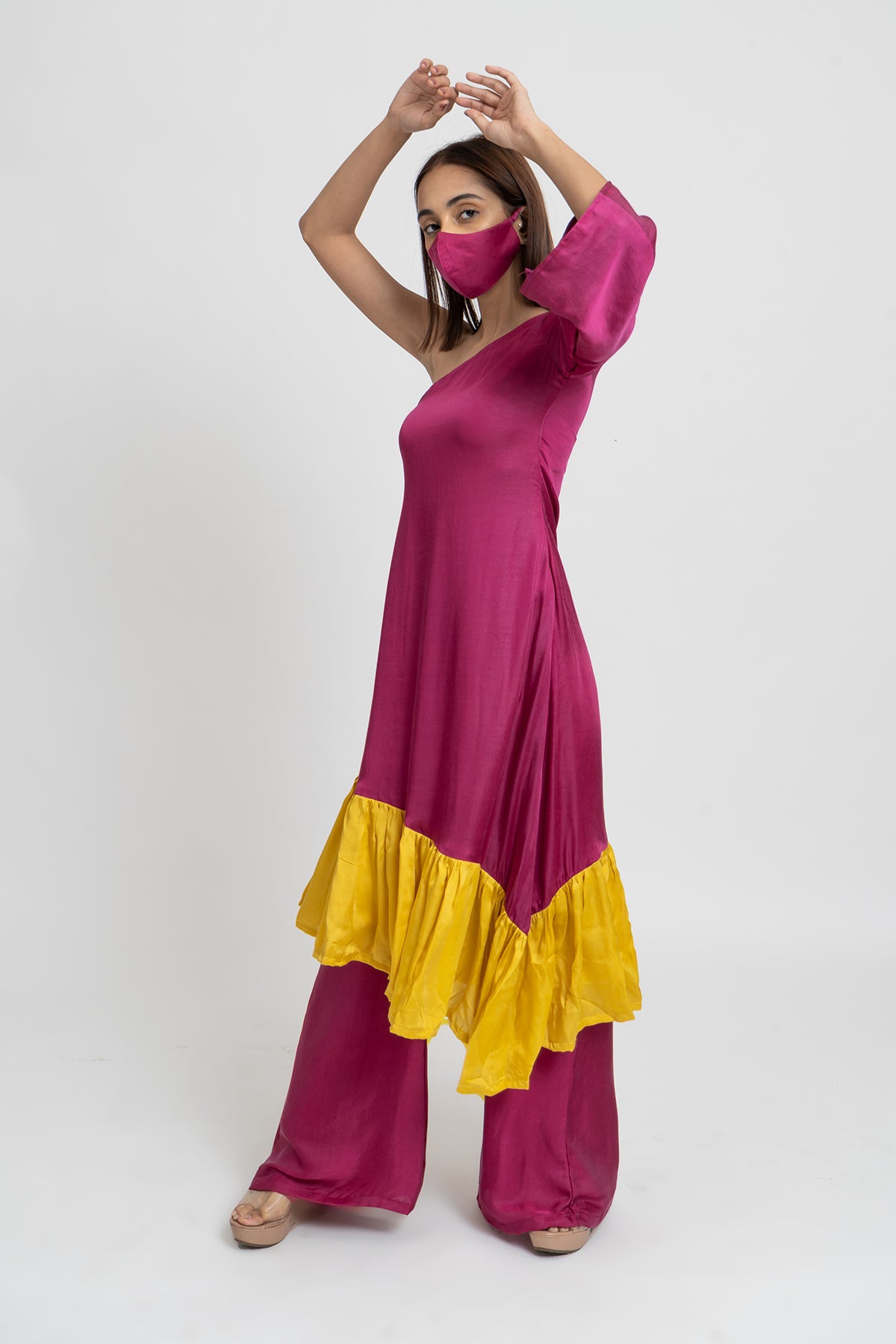 Wine and Yellow Colorblocked One Shouldered Asymmetrical Tunic with Wide Legged Wine Pants.