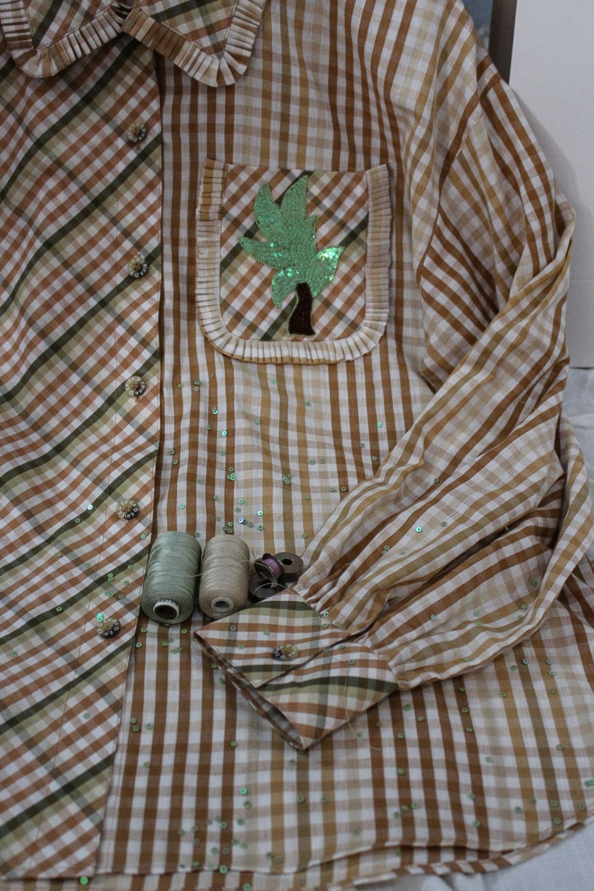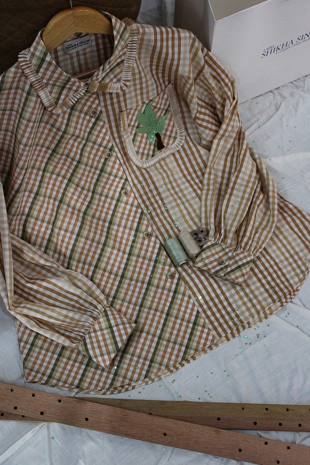 The mix n match concept shirt has a normal shirt collar along with fine pleats, both the front sides has different check panels, front opening with horn buttons details & full sleeves.