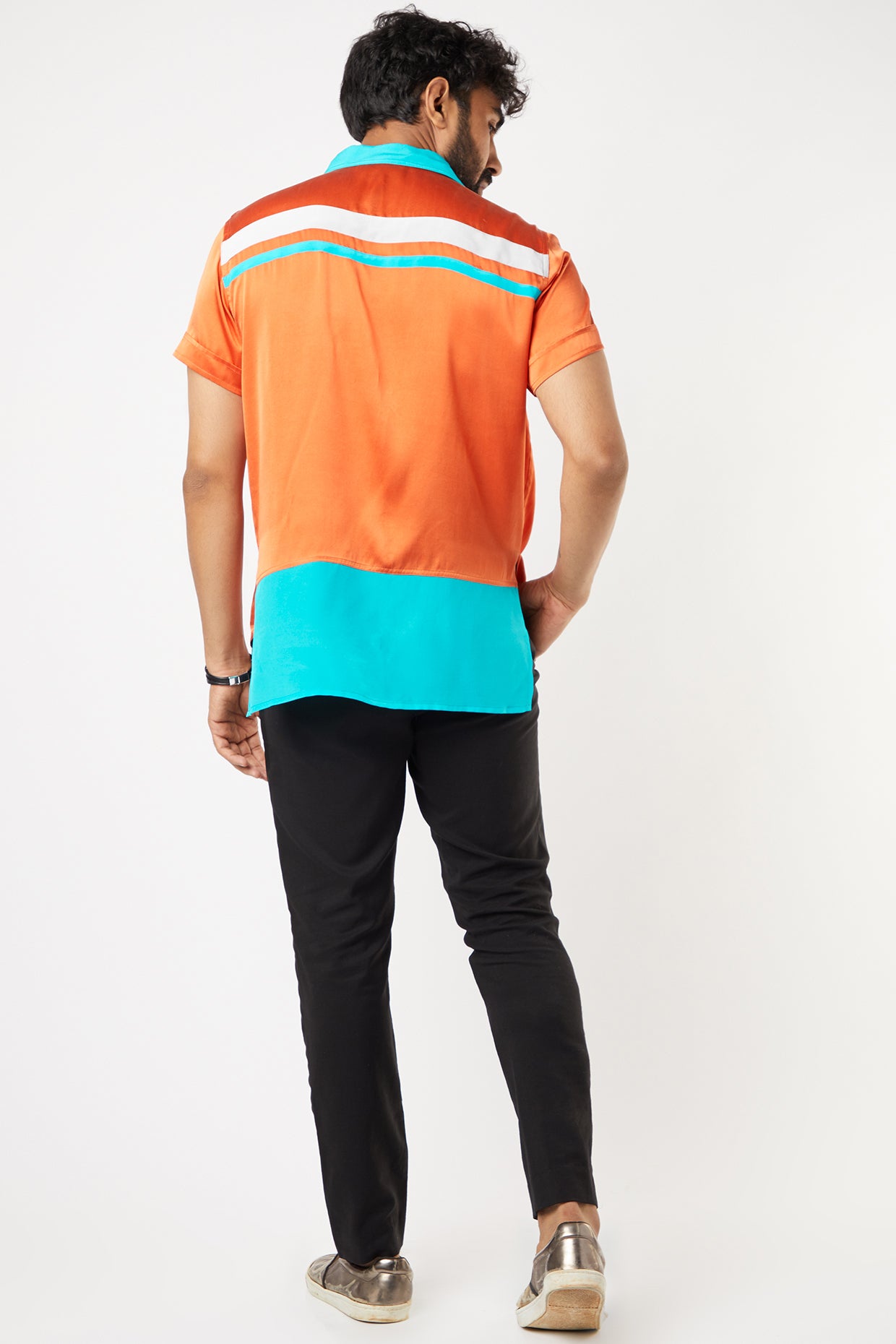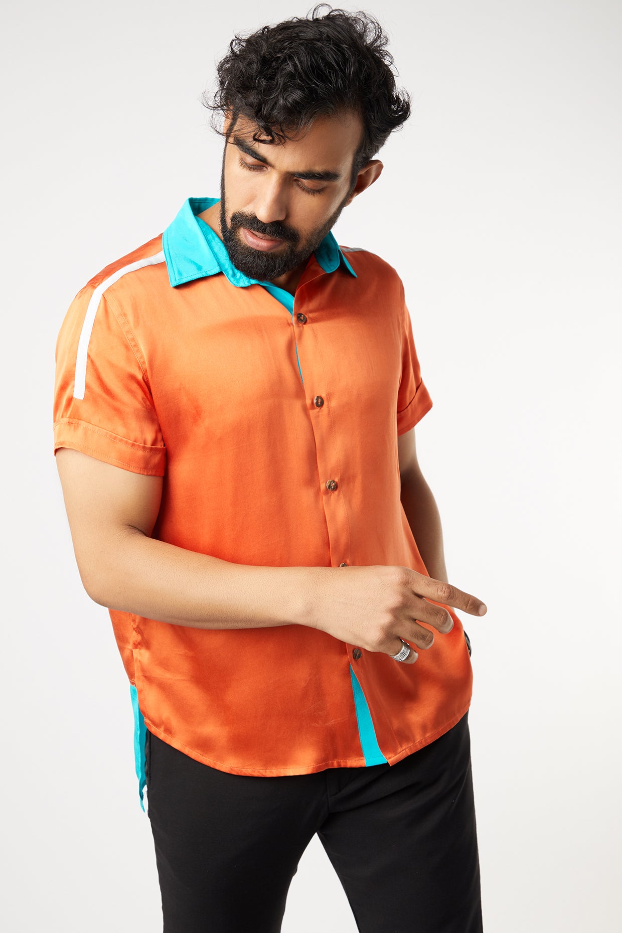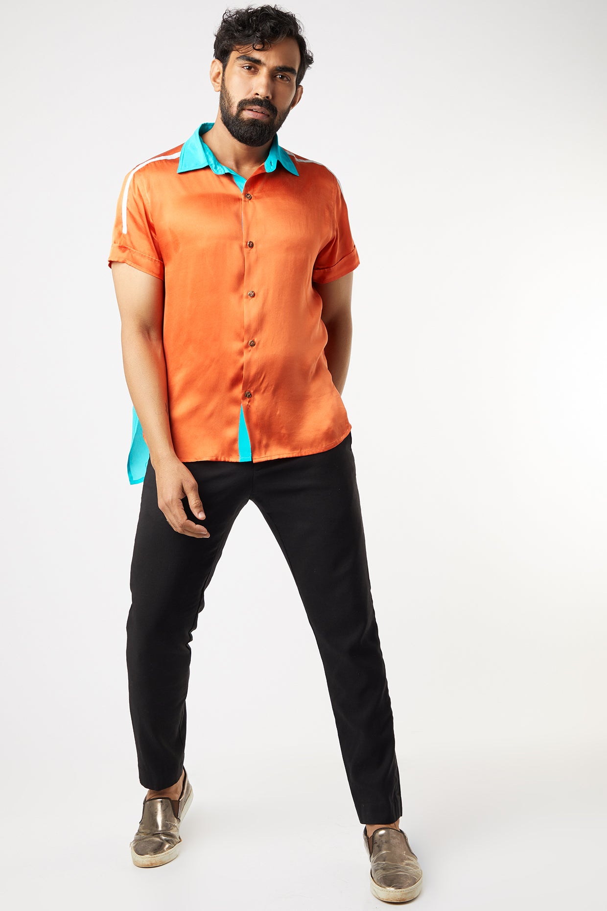 Featuring An Orange Shirt In Satin Silk And Crepe Silk Base With Contrast Collar And Back Hem. This Contains Only One Piece.