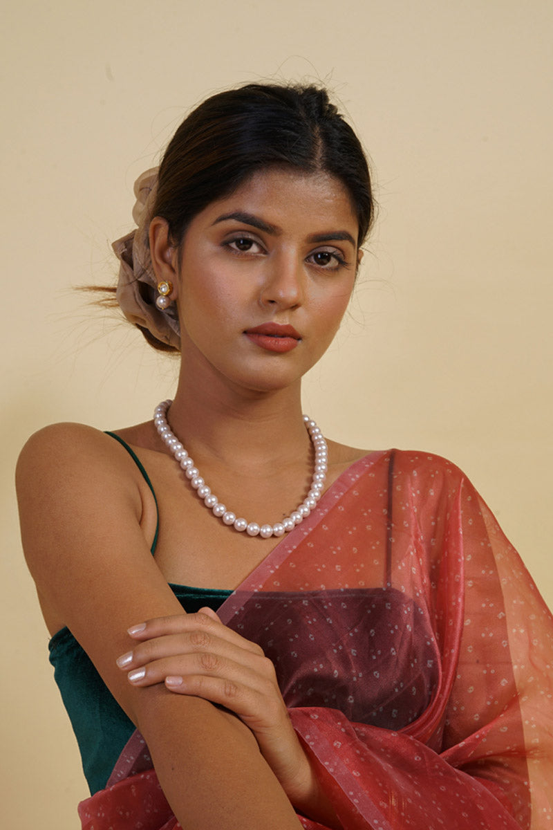 This jewellery set consists of a Necklace & a pair of Earrings. Plum Metallic Pearl Beaded Jewelry set, secured with drawstring closure. A pair of matching earrings each secured with post and back closure.