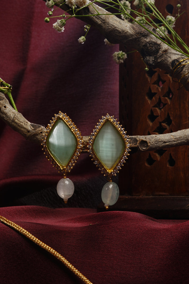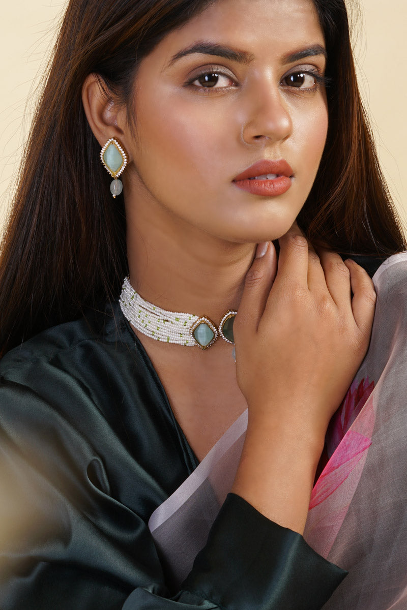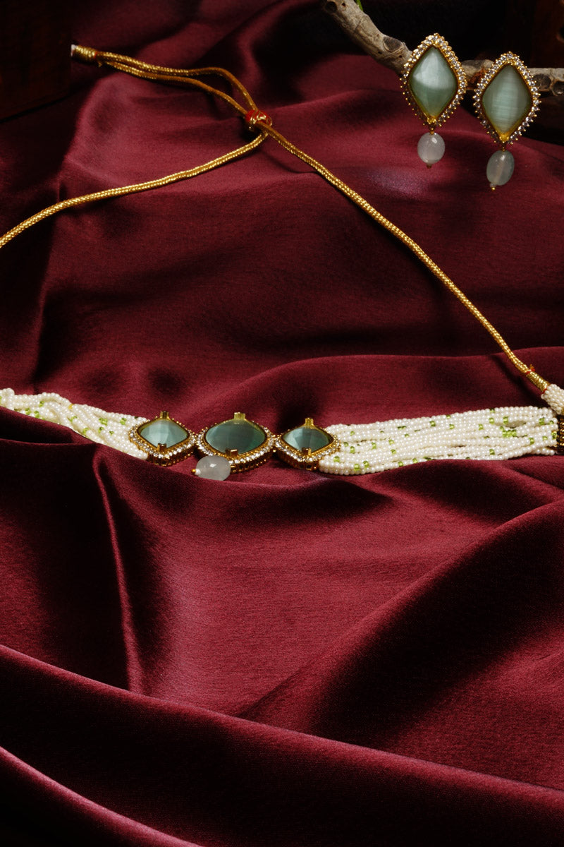 This jewellery set consists of a Necklace & a pair of Earrings. Green Stone Studded Pearl Layered Choker Set, has stone detailing. Secured with drawstring Closure. A pair of matching Earrings, each secured with post and back closure.
